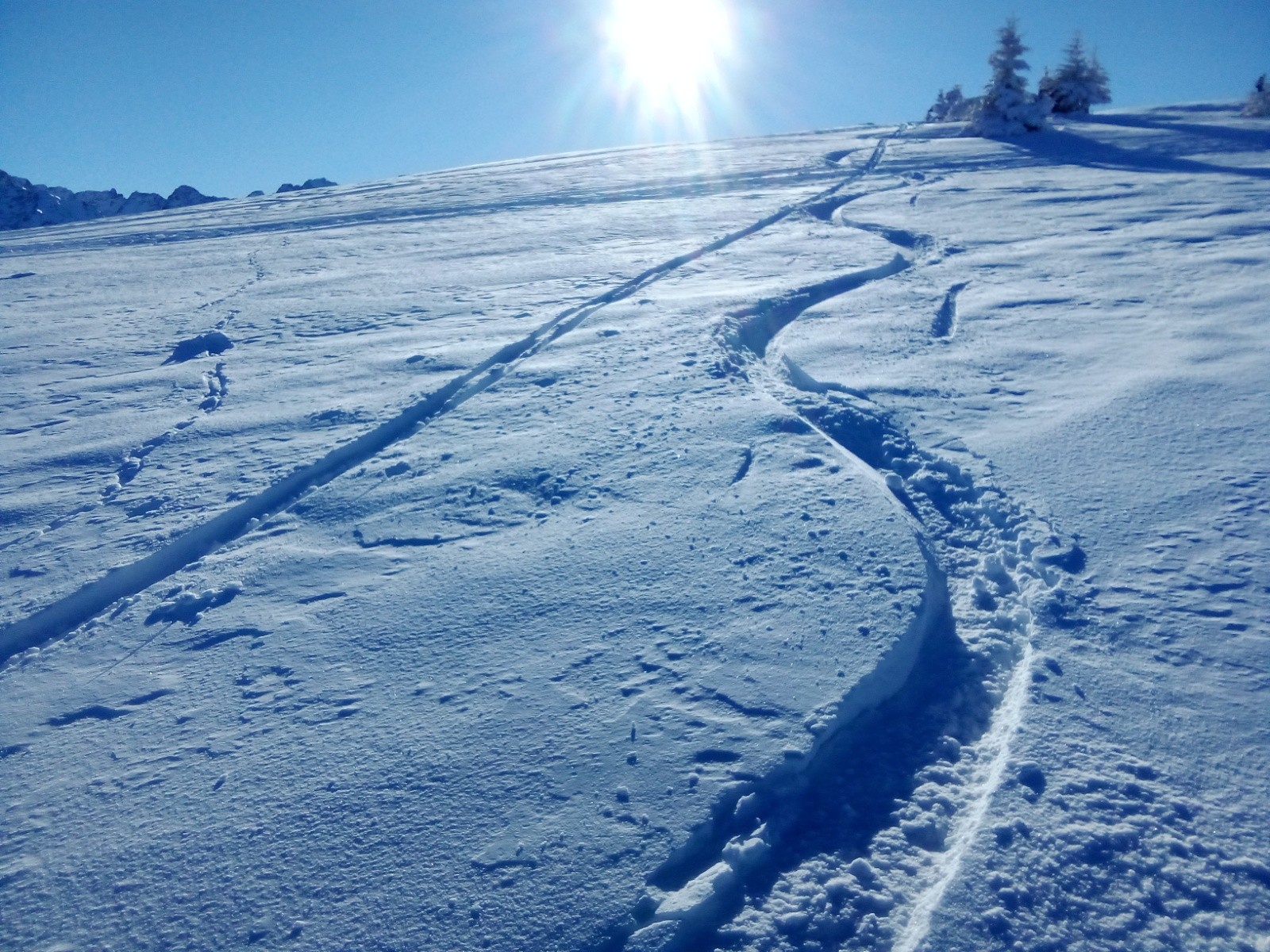 Plus haut la neige est restée légère. Travail du vent quasi inexistant. Peu traffolée d'hier mais aujourd'hui ça va labourer sévère vu la quantité de voitures.