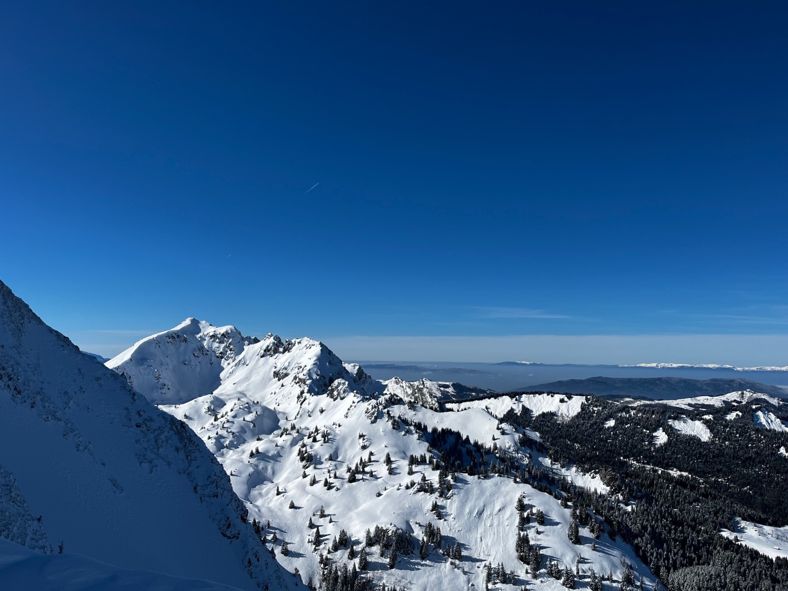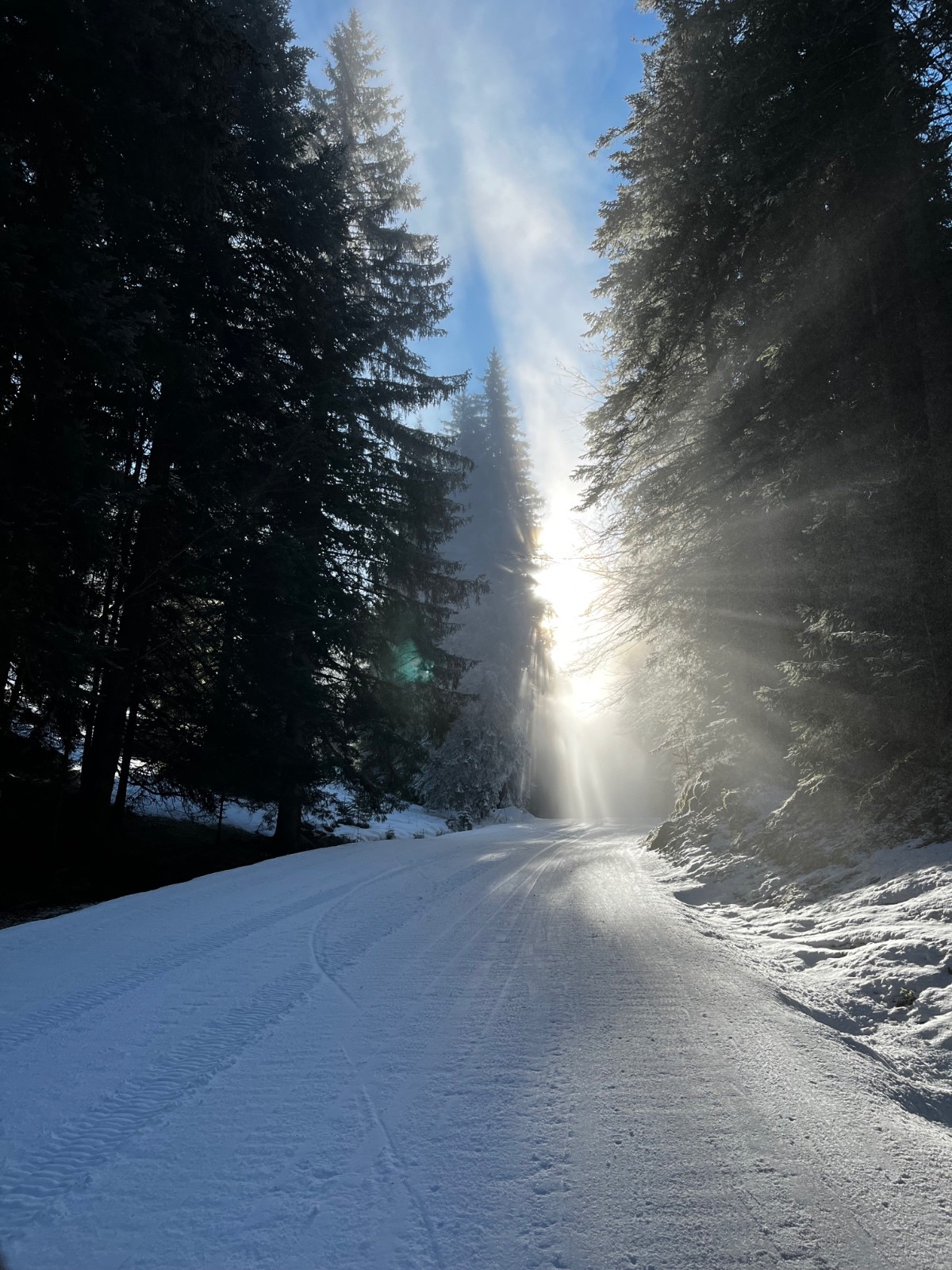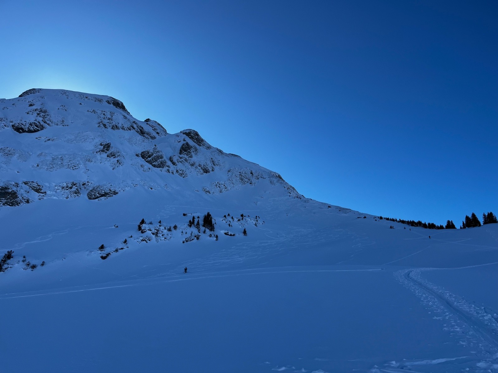 Conditions pour le ski : le chemin passe à la montée sans soucis, mais il ne faut pas envisager descendre par là. Excellente poudre dans la combe jusque à la remontée sur la piste.