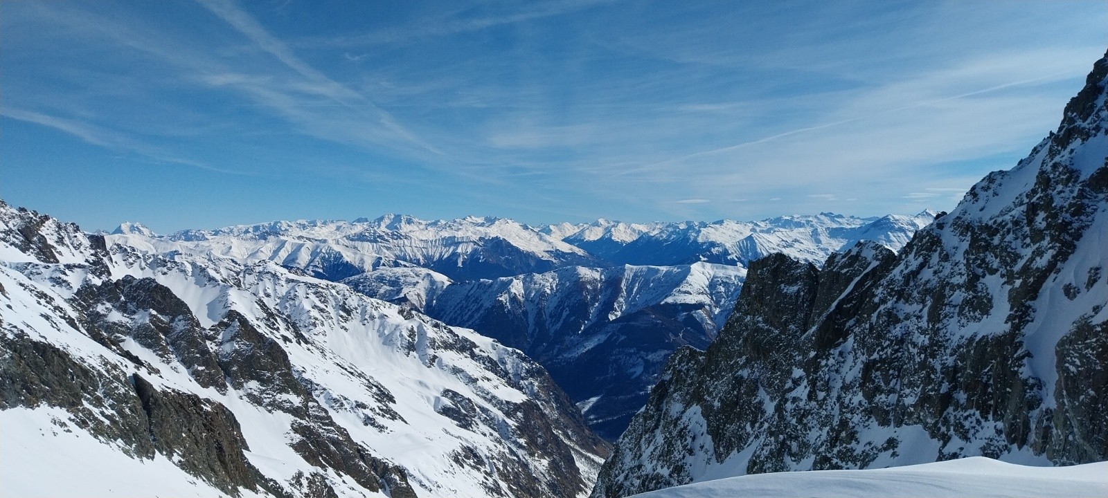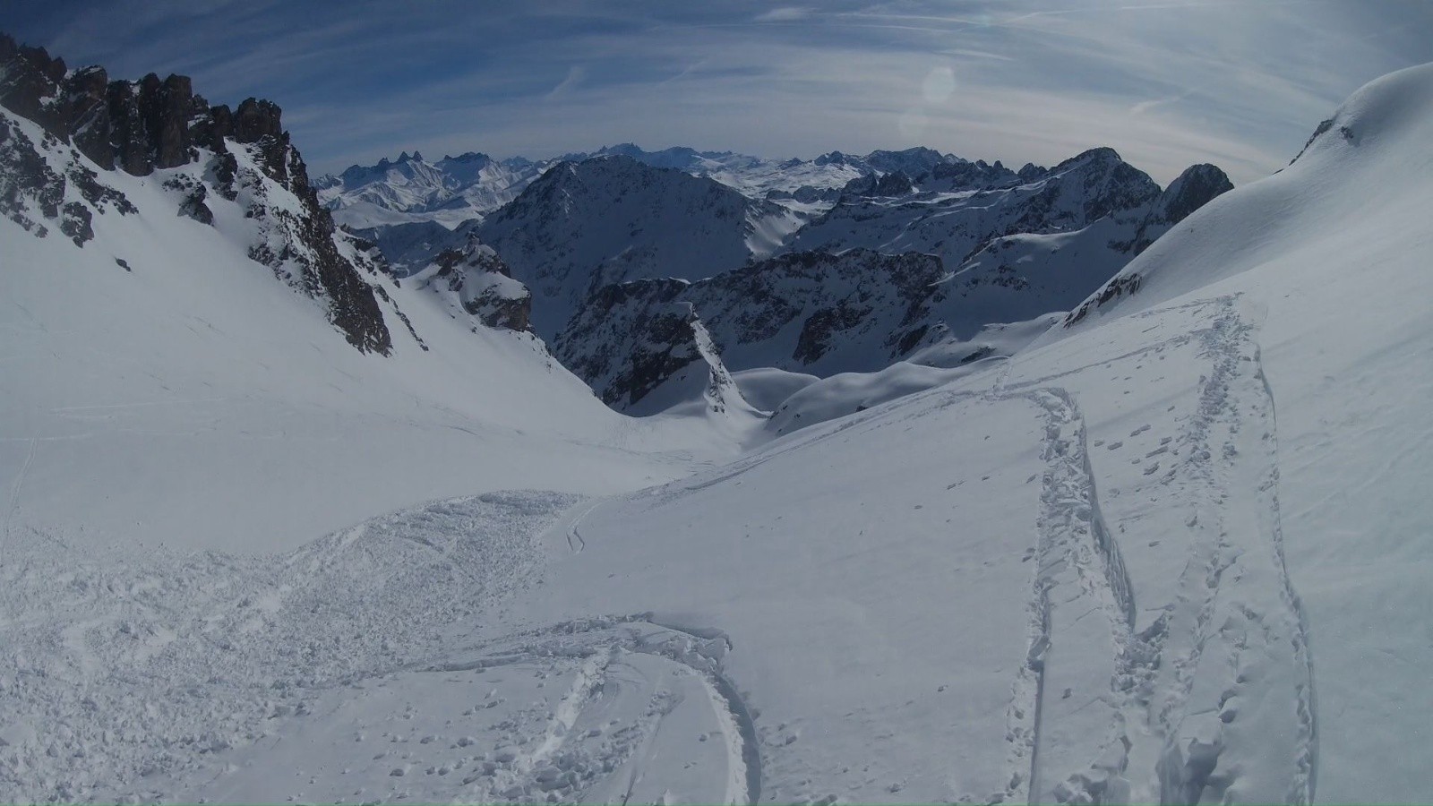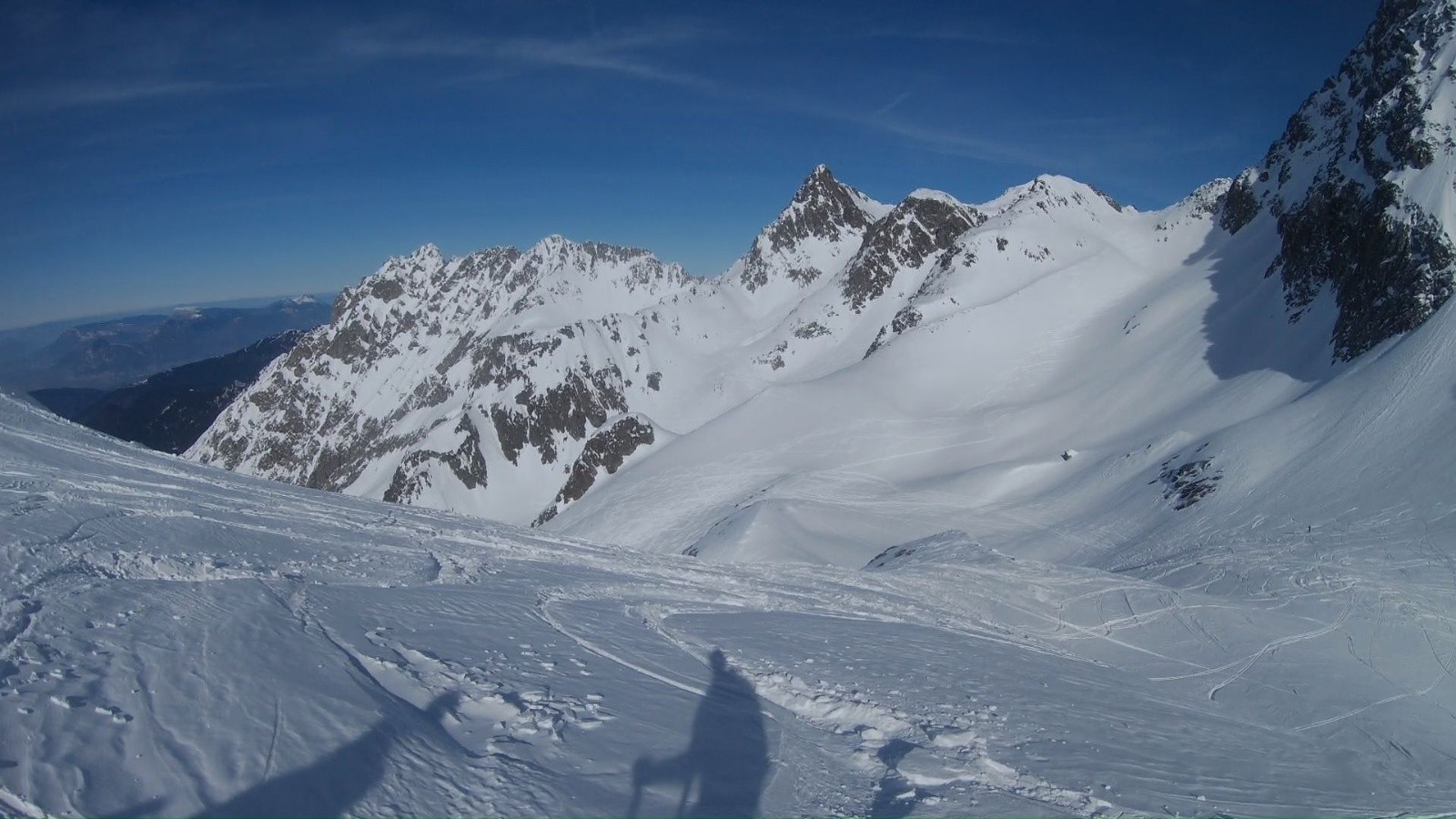 Après avoir admiré une dernière fois le paysage on entame la descente. Le début est similaire à une piste damné en fin de journée. Ensuite vers 2450m il y avait plus de place pour skier, j'ai pu me faire une super trace. Comme au col Sud du Gleyzin il y avait une petite croute pas dérangeante pour descendre à mon gout mais dérangeante pour le plaisir de skier puisque comme tout le monde on préfère une belle poudreuse légère. On commence à bien sentir les cuisses fumer par contre et le pire est à venir. Entre 2100m et 1650m la neige était toujours froide mais avec le monde qui était passé ça l'avait tassé un coup sur deux. C'était tout traffolé, pas un espace pour descendre sans se fatiguer. L'avantage c'est que ça apprend à skier pour les novices et que ça forge les cuisses pour ceux qui le veule, il suffit de s'arrêter le moins possible.