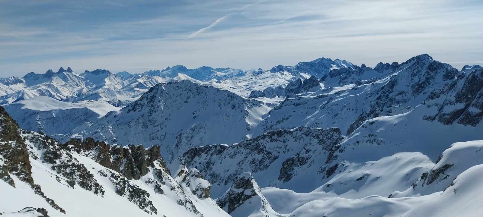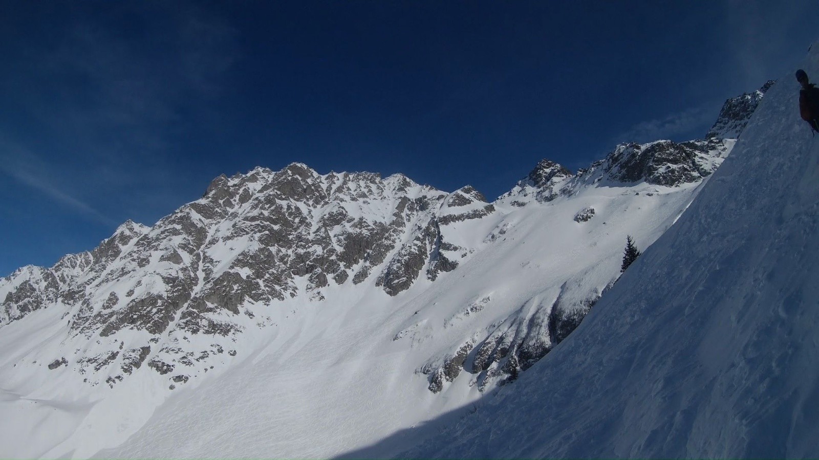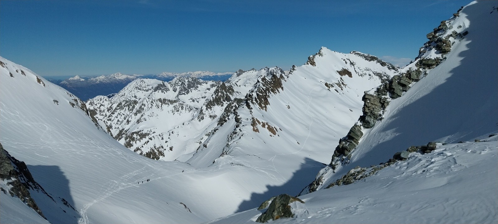 Après avoir admiré une dernière fois le paysage on entame la descente. Le début est similaire à une piste damné en fin de journée. Ensuite vers 2450m il y avait plus de place pour skier, j'ai pu me faire une super trace. Comme au col Sud du Gleyzin il y avait une petite croute pas dérangeante pour descendre à mon gout mais dérangeante pour le plaisir de skier puisque comme tout le monde on préfère une belle poudreuse légère. On commence à bien sentir les cuisses fumer par contre et le pire est à venir. Entre 2100m et 1650m la neige était toujours froide mais avec le monde qui était passé ça l'avait tassé un coup sur deux. C'était tout traffolé, pas un espace pour descendre sans se fatiguer. L'avantage c'est que ça apprend à skier pour les novices et que ça forge les cuisses pour ceux qui le veule, il suffit de s'arrêter le moins possible.