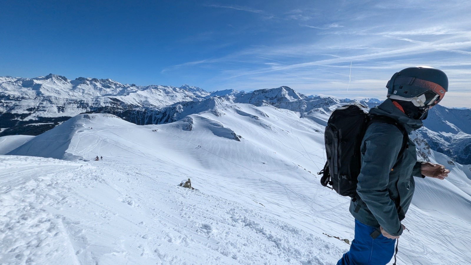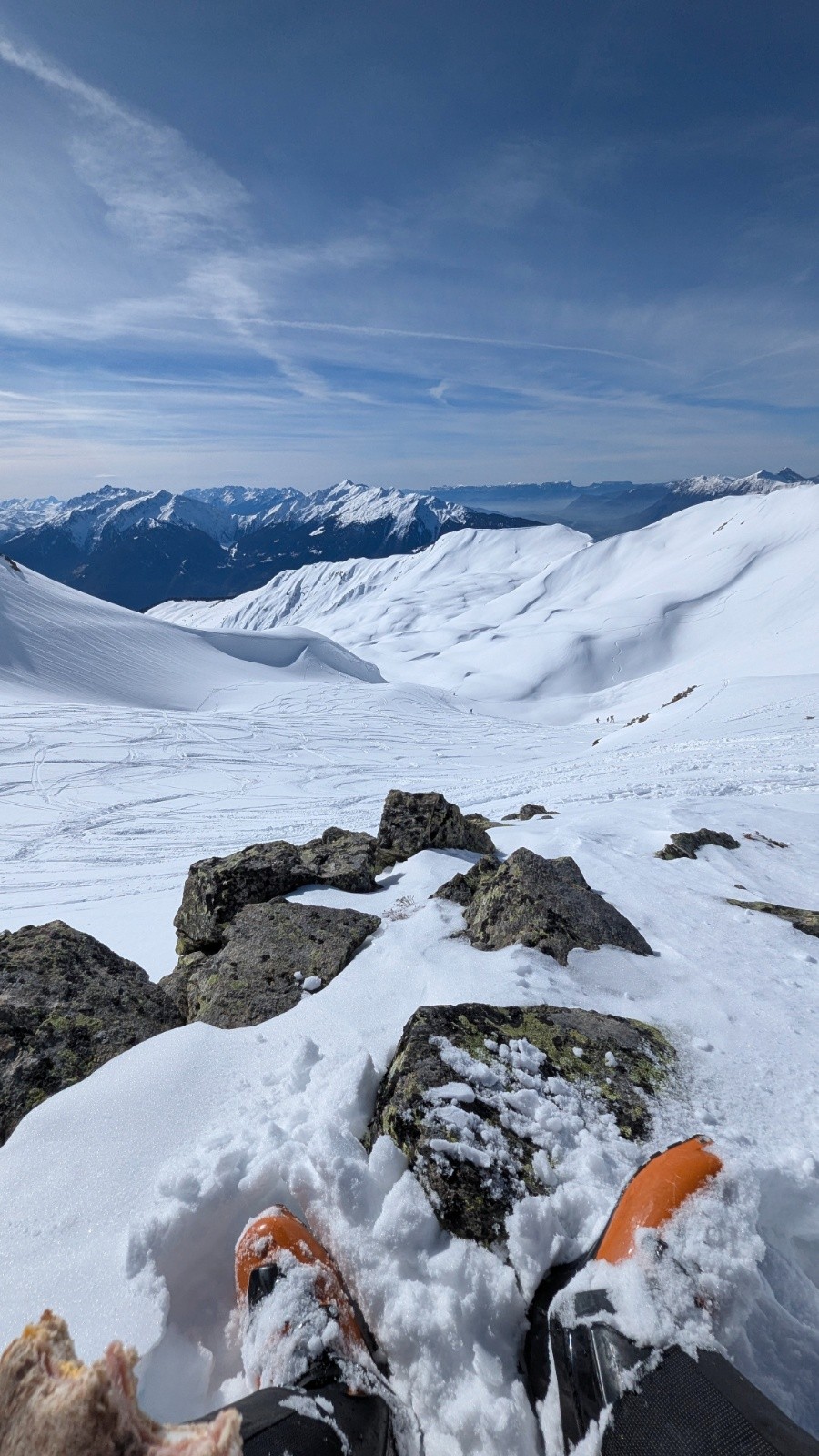 Conditions nivo et activité avalancheuse : pas de départs en ce dimanche (risque 2!) nous n'avons pas fait de couloirs / passages raides vu l'activitée avalancheuse de la veille dans les Alpes ... Mais le petit couloir de la pointe était très tentant ! Nous n'avons pas testé la pointe, la descente hors du couloir avait l'air très désagréable (juste à côté de la montée en mode "feuille morte"...), arrêt 100/200m avant pour rester sur des pentes sans trop de pente (quelques rochers très visibles))