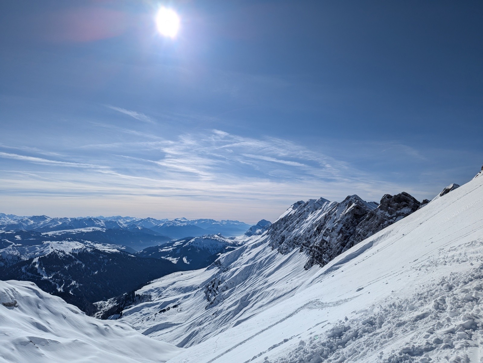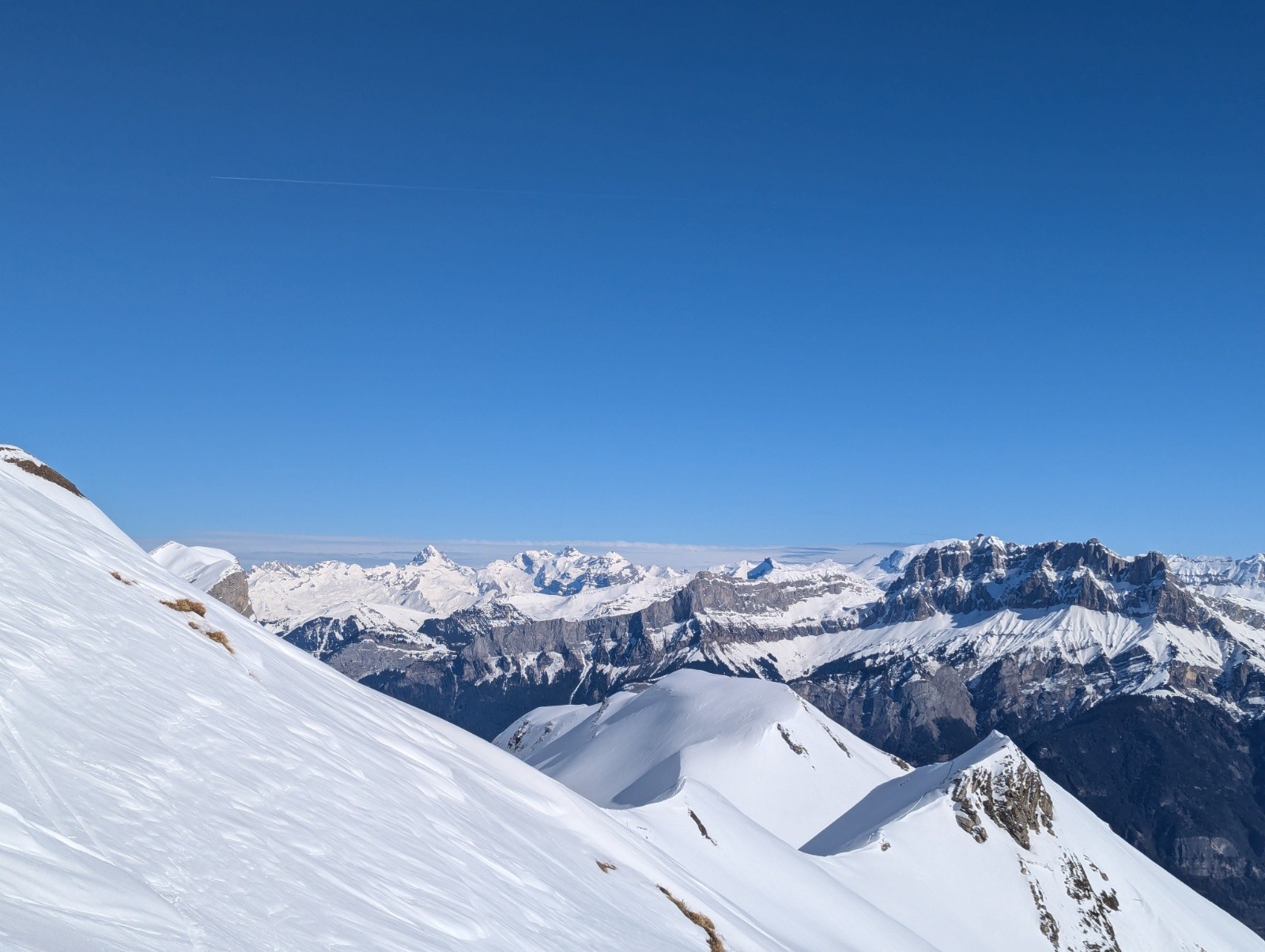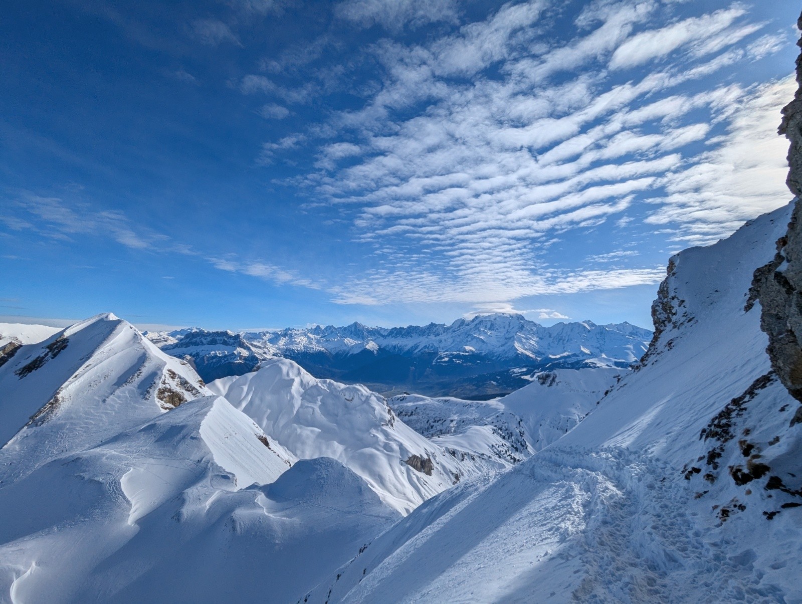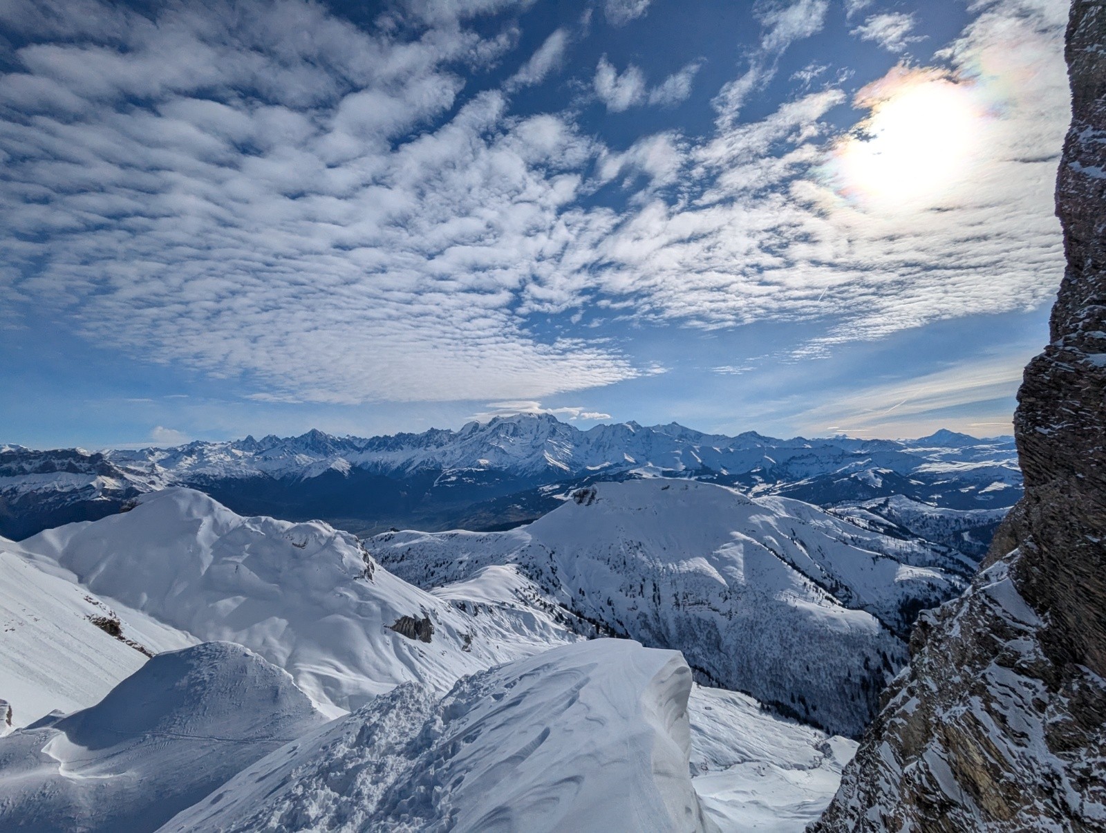 Conditions pour le ski : Excellente ! Froid et léger dans les combes. Printemps très humide au passage du père (pente sud raide donc logique). Neige plus lourde à Tré le Crot, ça battait. Neige fabuleuse à la Grande Forclaz, juste le haut est soufflé !