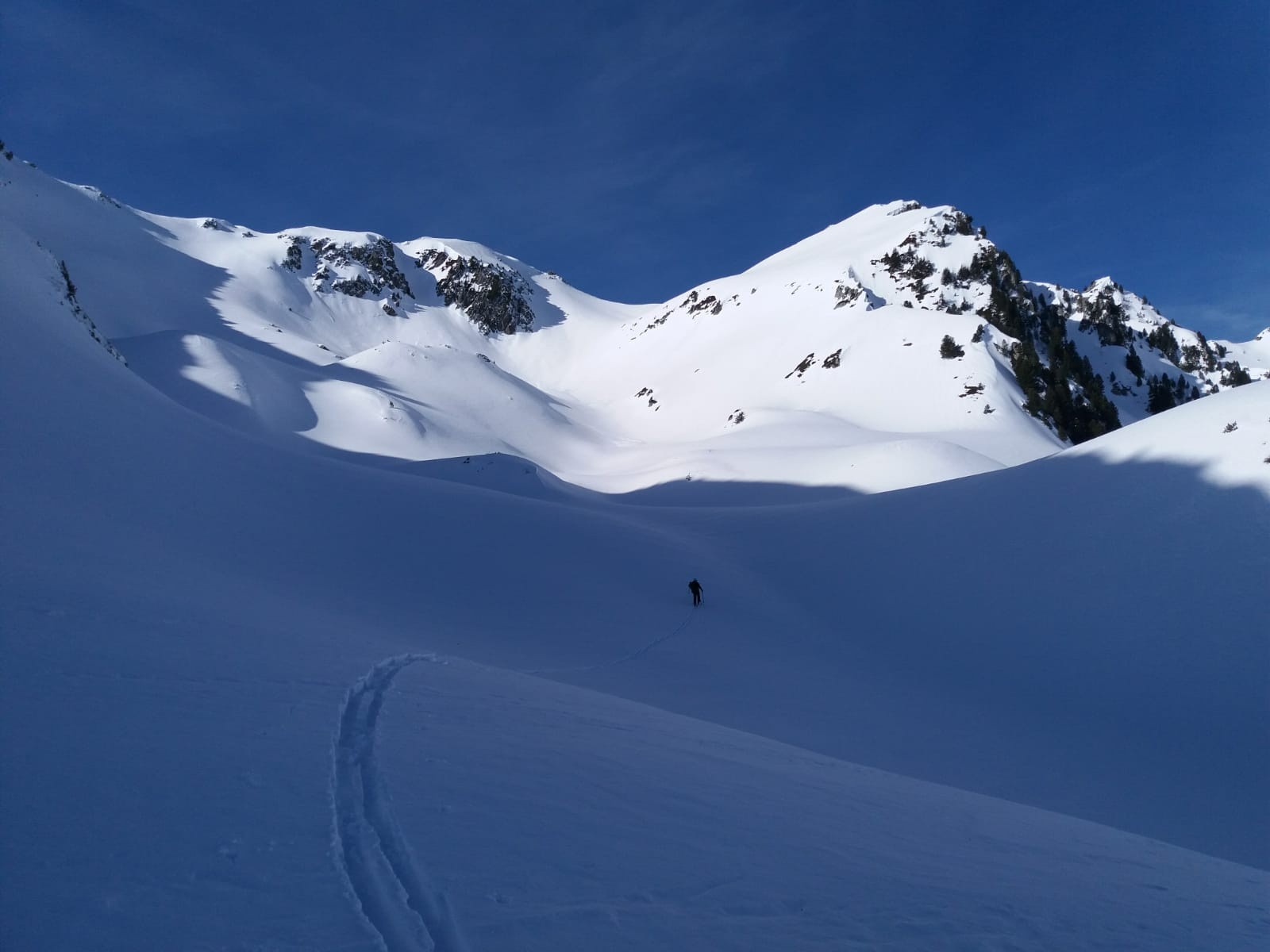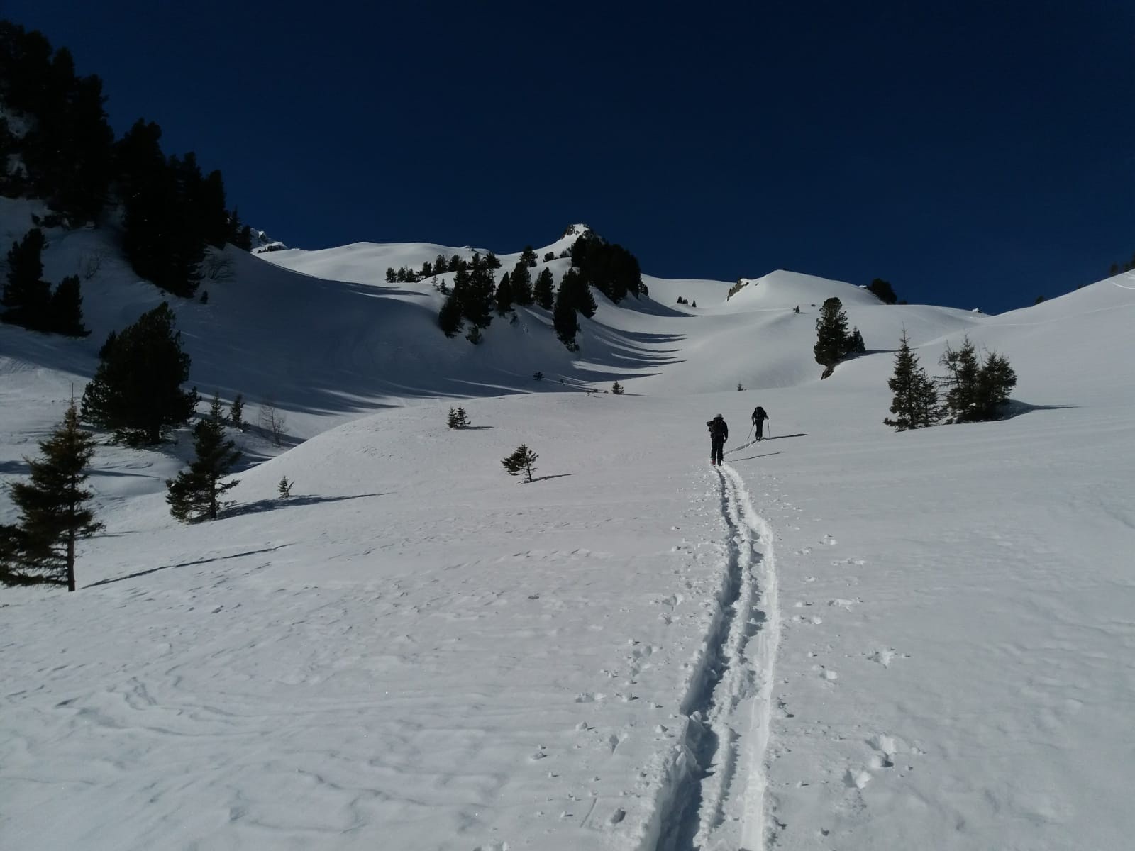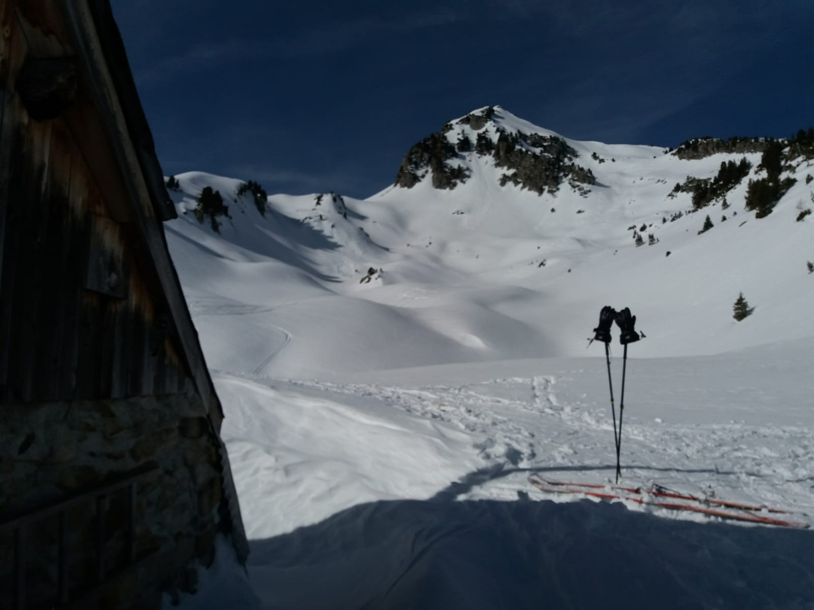Itinéraire suivi : sentier forestier du parking du gué à l'épingle de la piste, puis piste jusqu'au parking 1430, puis sentier forestier (tant bien que mal... non tracé) le long du ruisseau d'Arpingon. Halte à la cabane des Etaves 1685 (la porte est grande ouverte, coincée par la neige...). Puis tout droit, plein E, jusqu'au Roc d'Enfer que nous contournons par le Nord. Nous observons la nivo (anciennes coulées, corniches, expo...), avisons et optons finalement pour le sommet 2302 de La Grosse Tête, en versant NE, plutôt que le sommet 2301 en versant SE. Aucune difficulté. Retour via la cabane d'Arpingon puis la piste forestière jusqu'au parking.