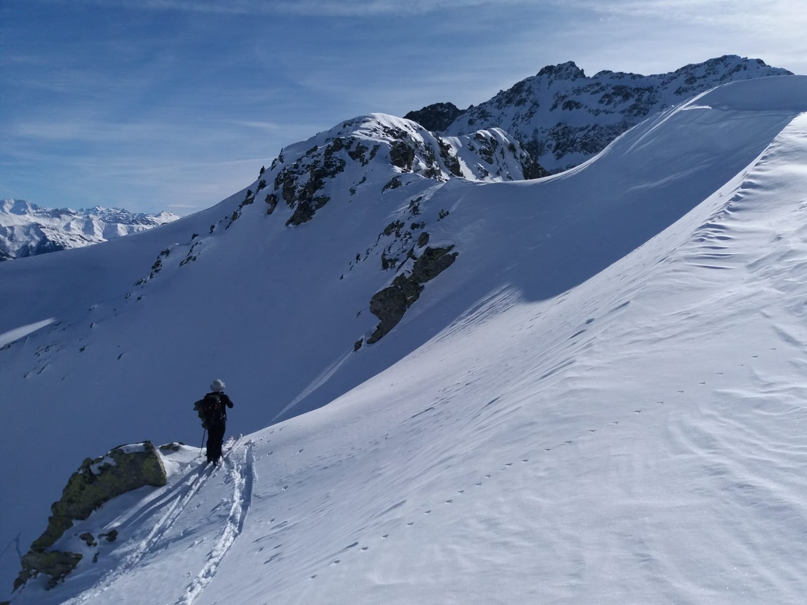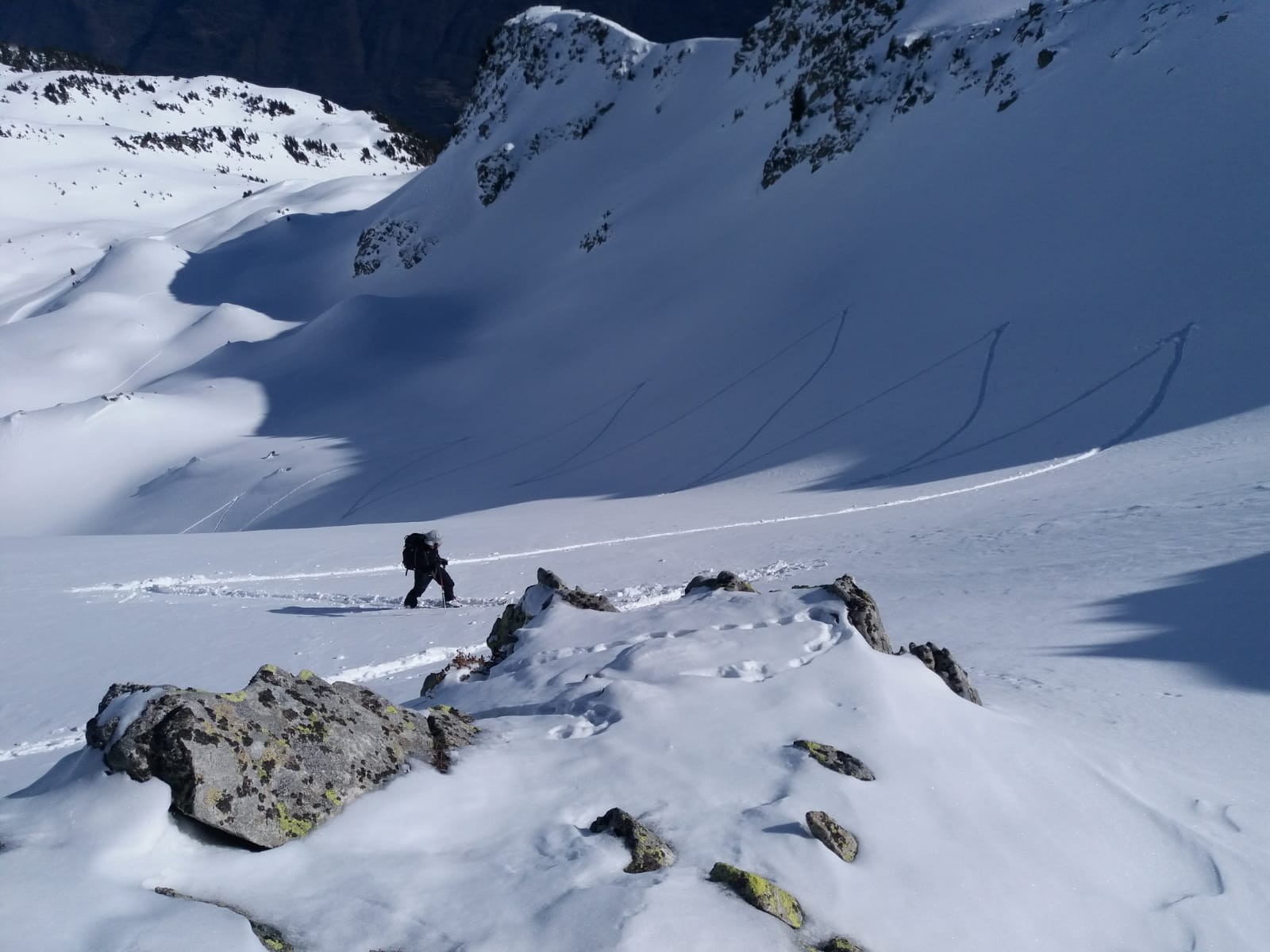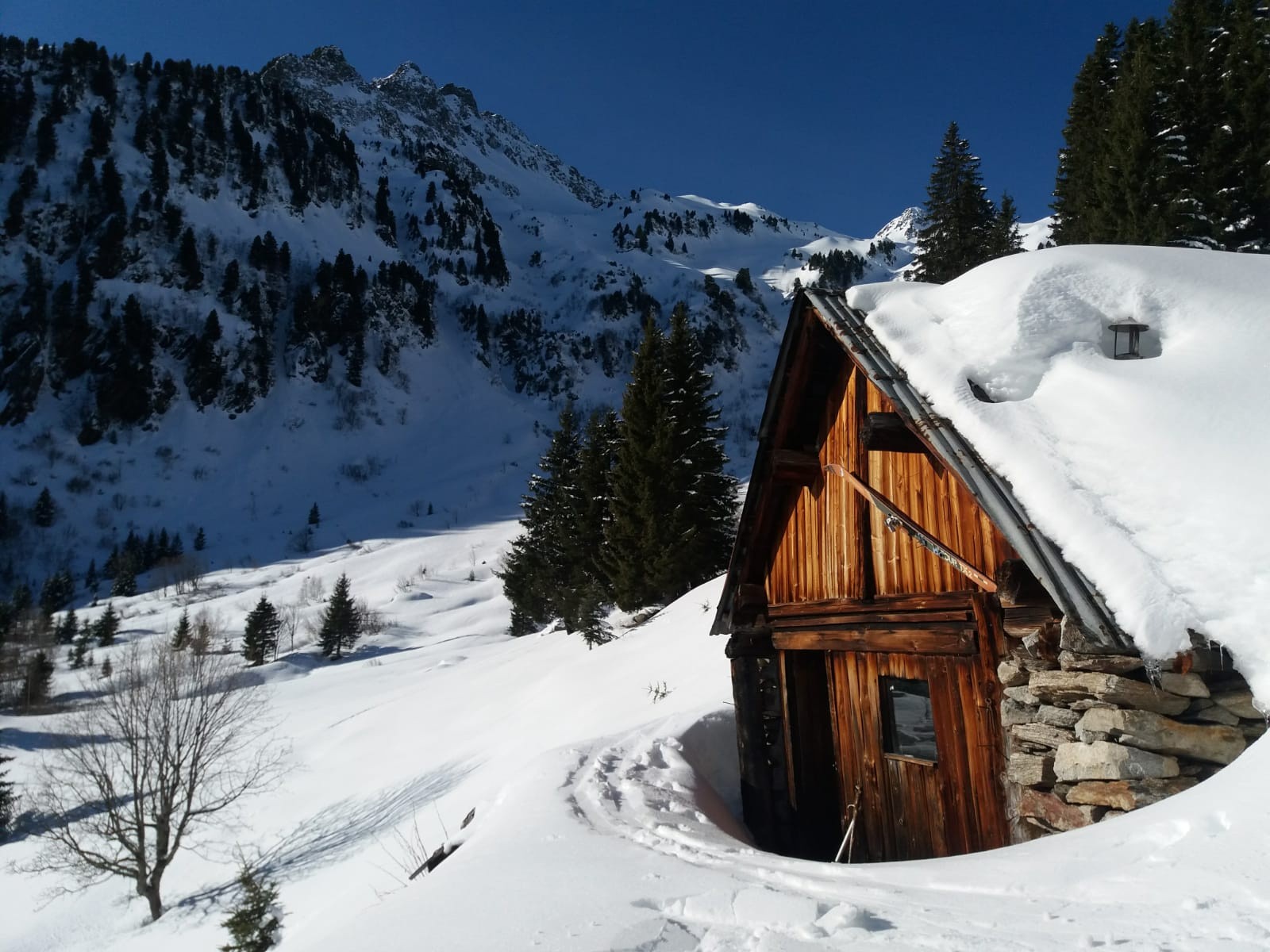 Itinéraire suivi : sentier forestier du parking du gué à l'épingle de la piste, puis piste jusqu'au parking 1430, puis sentier forestier (tant bien que mal... non tracé) le long du ruisseau d'Arpingon. Halte à la cabane des Etaves 1685 (la porte est grande ouverte, coincée par la neige...). Puis tout droit, plein E, jusqu'au Roc d'Enfer que nous contournons par le Nord. Nous observons la nivo (anciennes coulées, corniches, expo...), avisons et optons finalement pour le sommet 2302 de La Grosse Tête, en versant NE, plutôt que le sommet 2301 en versant SE. Aucune difficulté. Retour via la cabane d'Arpingon puis la piste forestière jusqu'au parking.