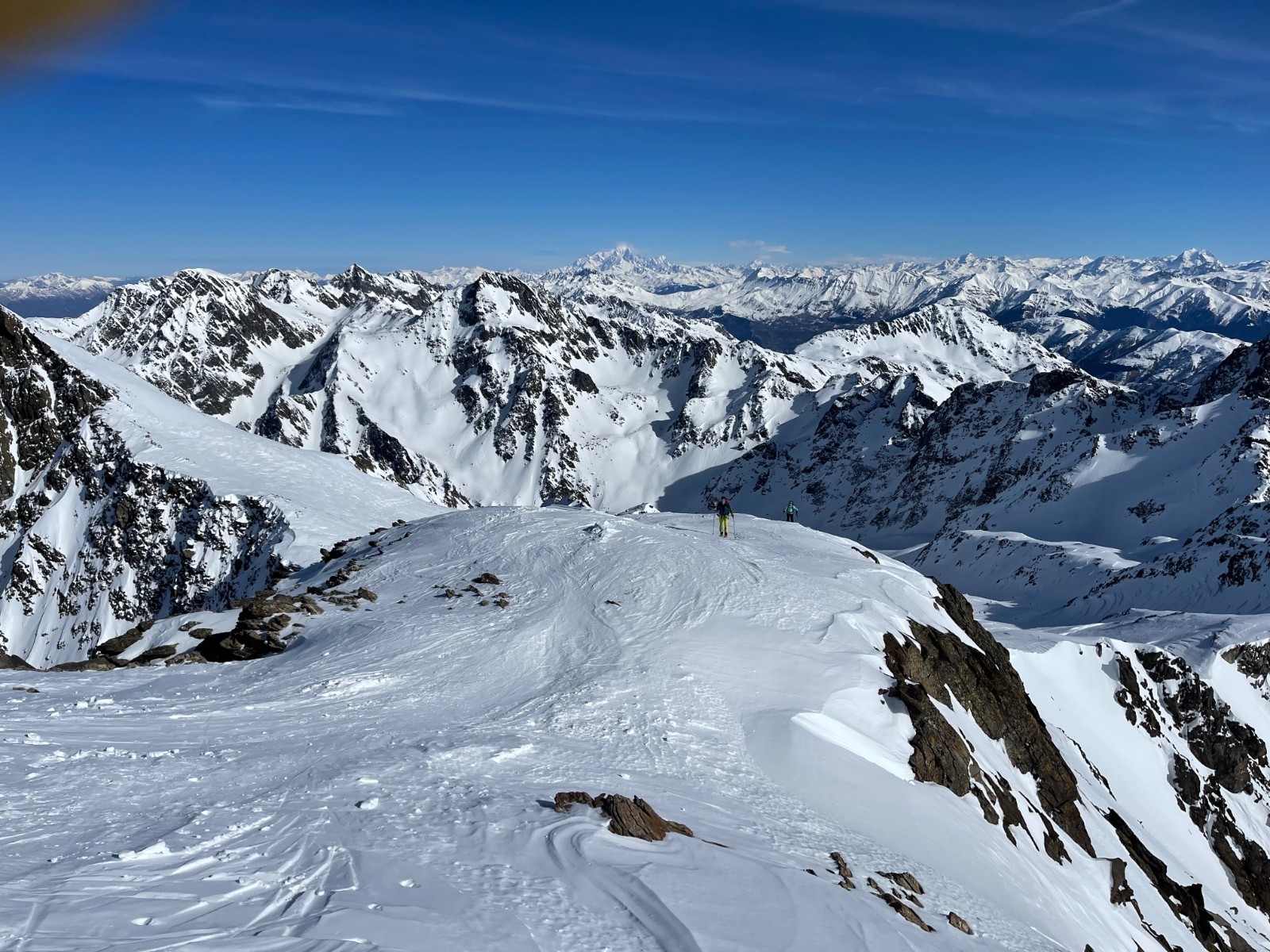 Et pourtant, c’est en corps expéditionnaire de deux skieurs légers que nous avons fui la grande armée qui s’élançait de Prabert, pour profiter, souvent seuls, de ces étendues sauvages. Certes, atteignant le rocher blanc, phare d’Alexandrie de cette sortie mais sans sirènes, nous sommes tombés sur quelques autochtones du massif d’Allevard, munis de leurs felouques de 90 au patin. Ni crocodiles, ni papy rustres, ils nous laissèrent voguer vers Grand maison, véritable barrage d'Assouan en ces ces contrées.