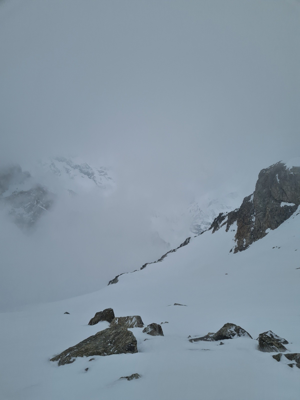 Puis on descend en crampons des pentes à 45 avant de chaussée vers 3100. La neige est plaquée et accumulée, on se taille vite de là mais on a sûrement eu beaucoup de chance. Le fait que la zone prennent le soleil depuis 6 jours m'avait faussement rassuré...