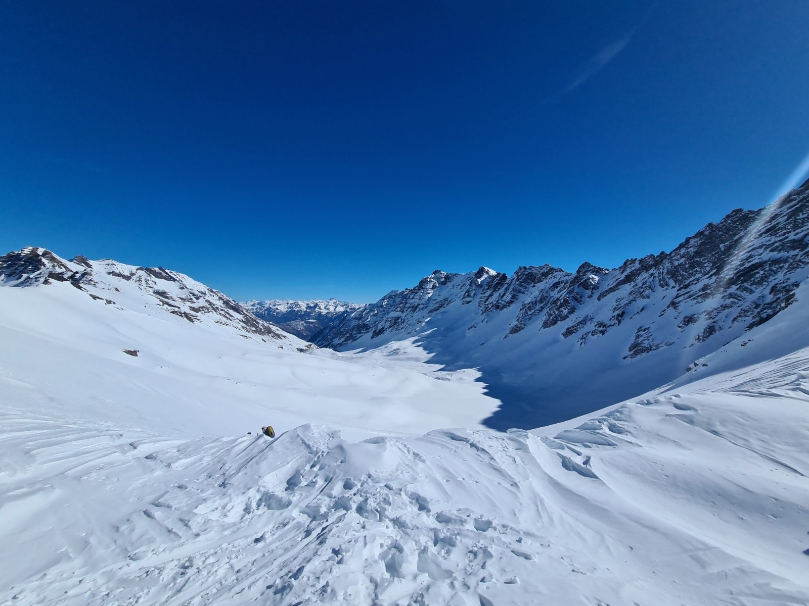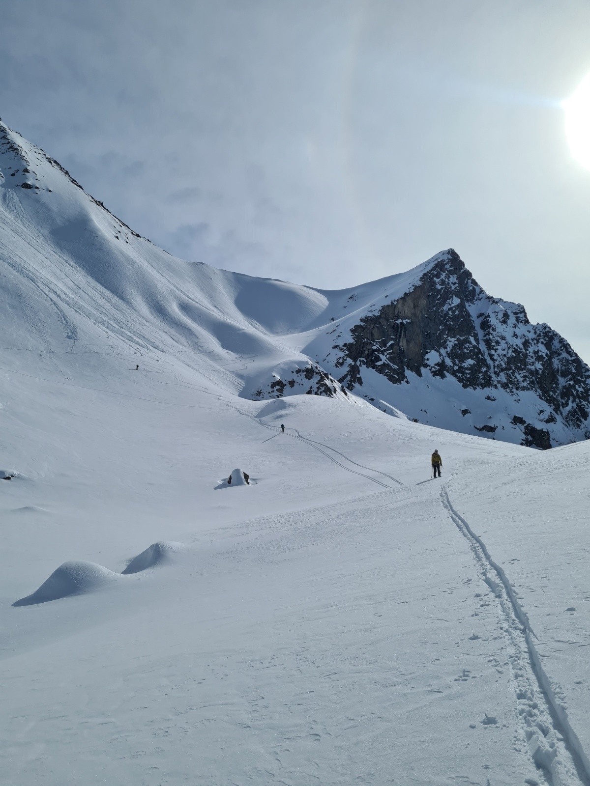 Passage du col de l'Aulp Martin dans les pentes au soleil du matin, le manteau semble stabilisé par les jours consécutifs de beau.