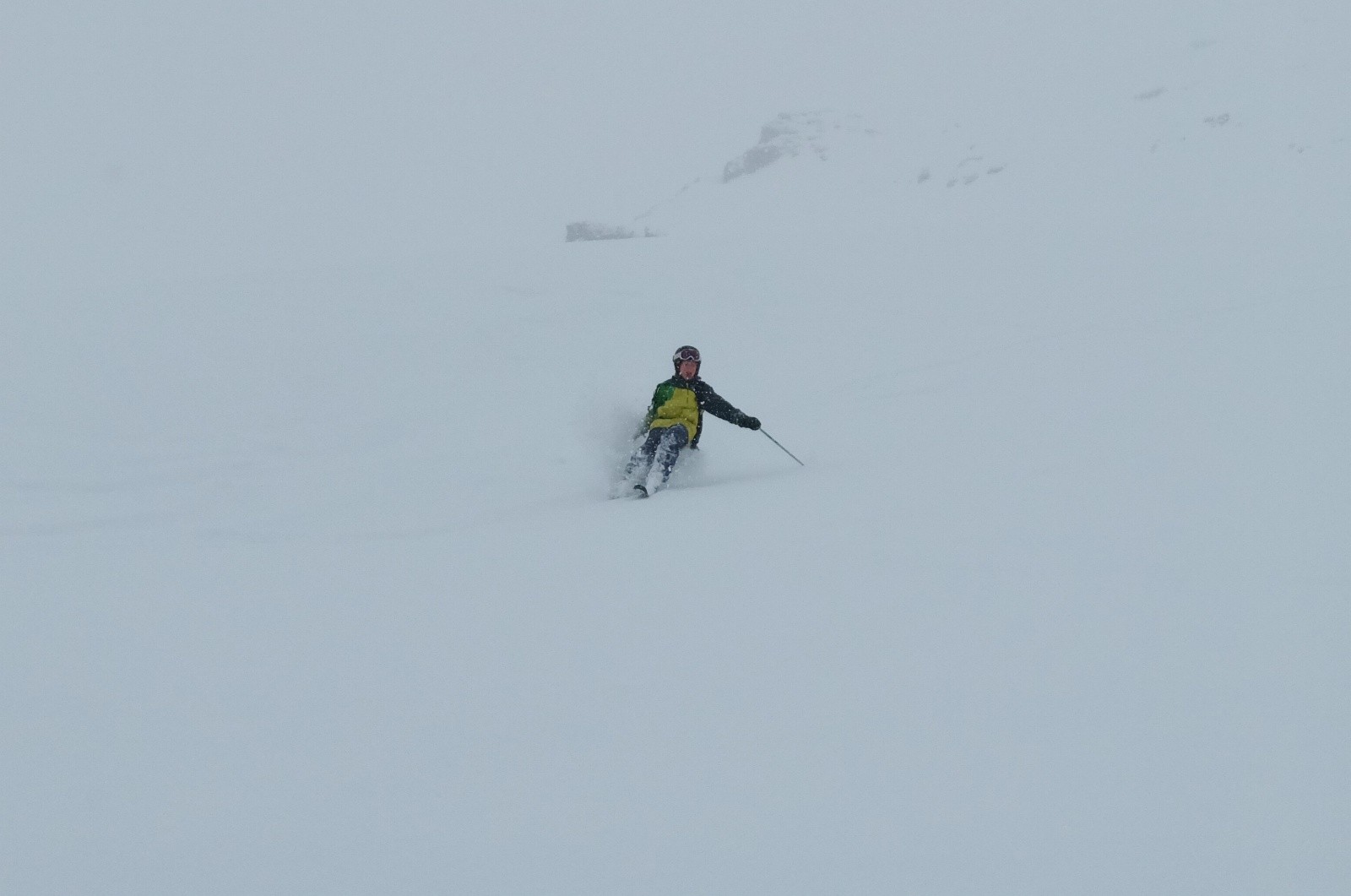 Conditions pour le ski : croûte non portante recouverte de qq cm de coton. Pas simple à skier dans le brouillard et sans traces...ça sera sûrement bon demain au soleil!