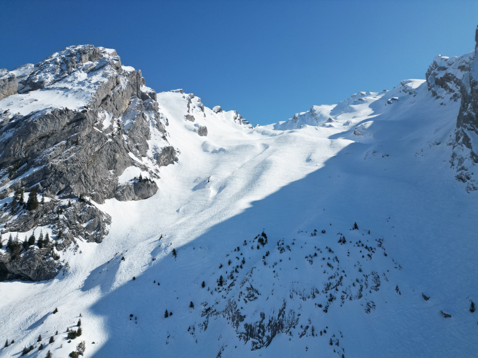 Conditions pour le ski : parfaites. Poudre très stable non soufflée. Qq passages avec fond dur/glacé par les purges. Très bon ski. Final arête avec bien des requins...