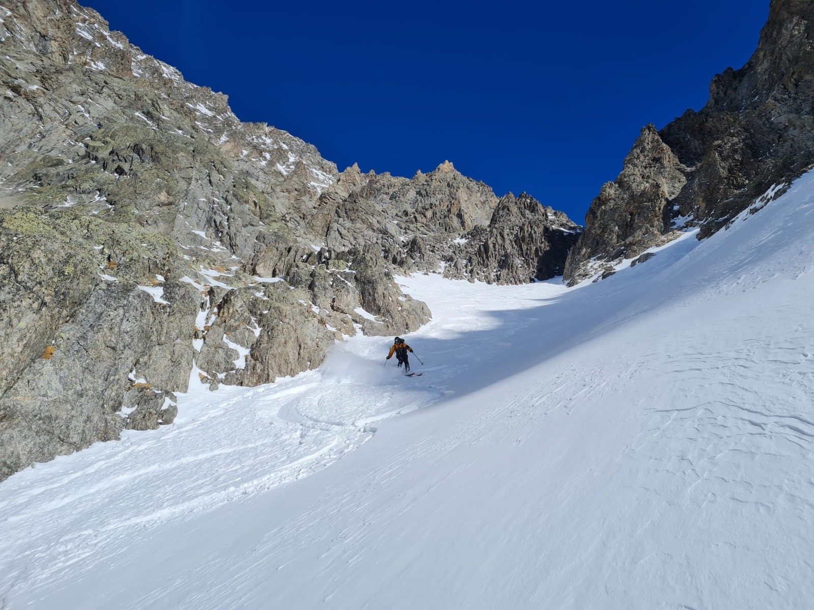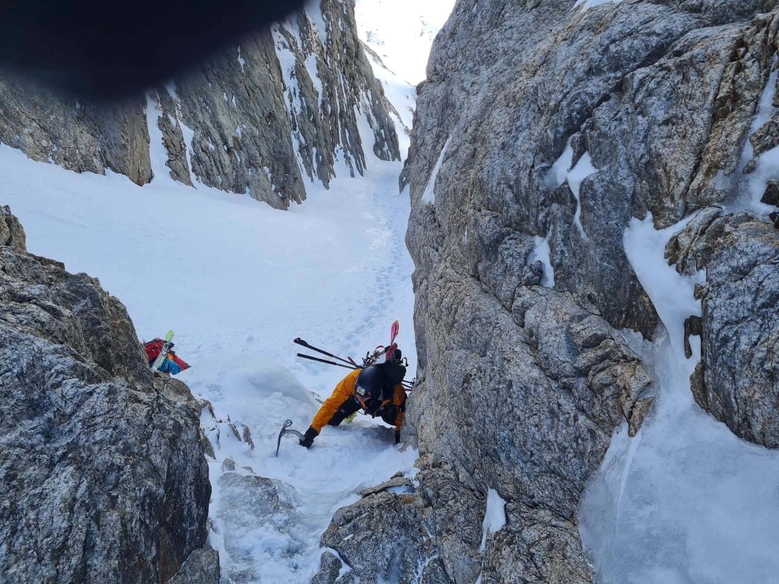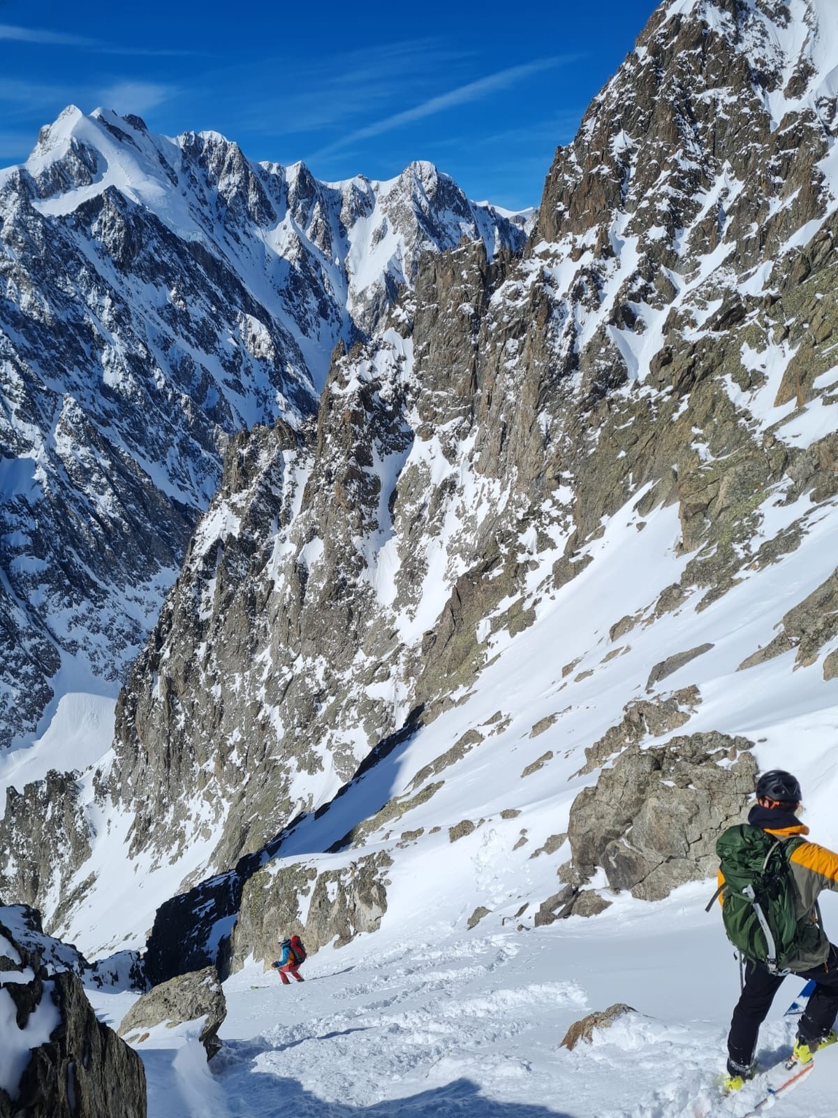 Le crux, c'est là où à la montée on a pris la branche de gauche avec un bon ressaut en neige glace mixte sur 5m, mais où on s'est dit que ça sauterait à l'aise en ski dans la branche de droite.