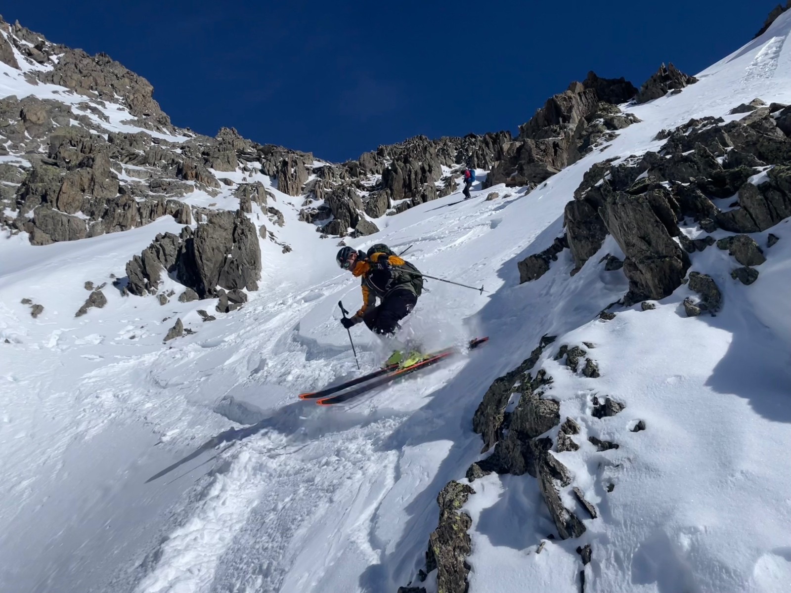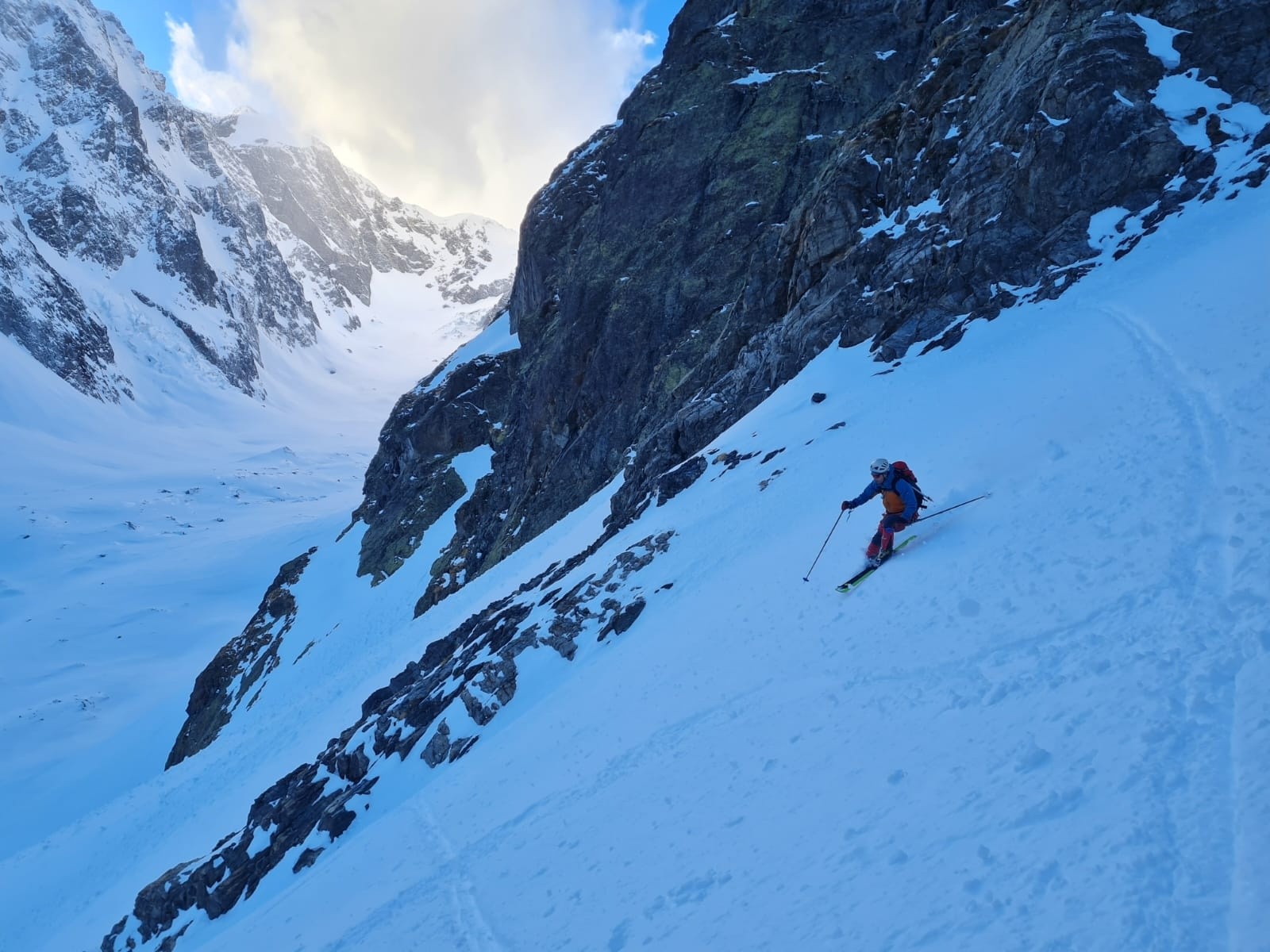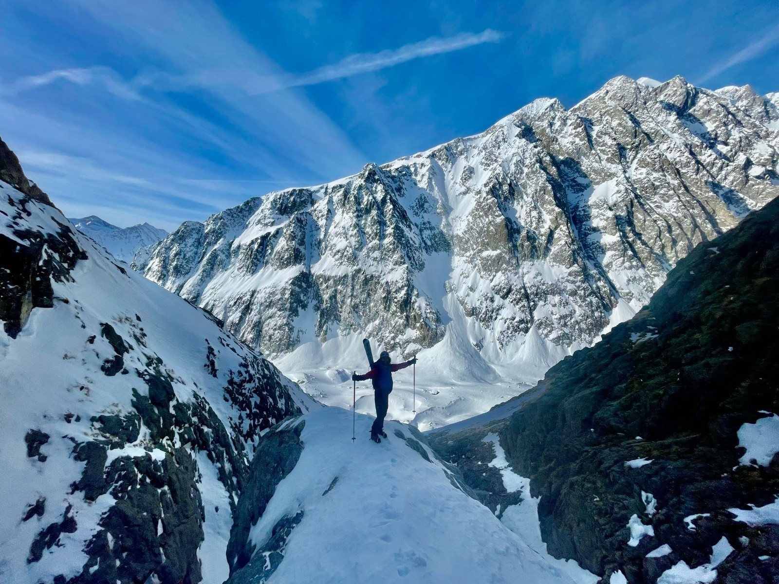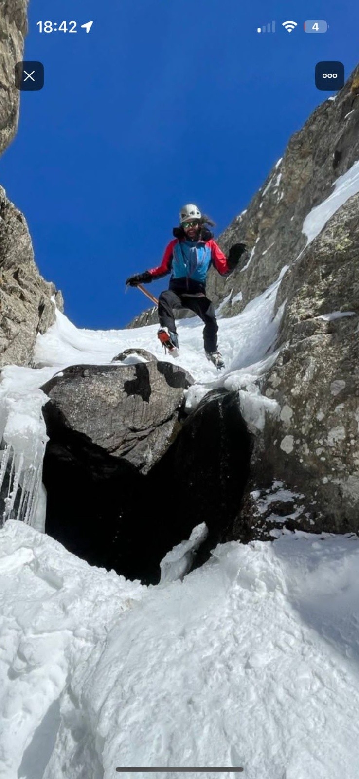 Le crux, c'est là où à la montée on a pris la branche de gauche avec un bon ressaut en neige glace mixte sur 5m, mais où on s'est dit que ça sauterait à l'aise en ski dans la branche de droite.