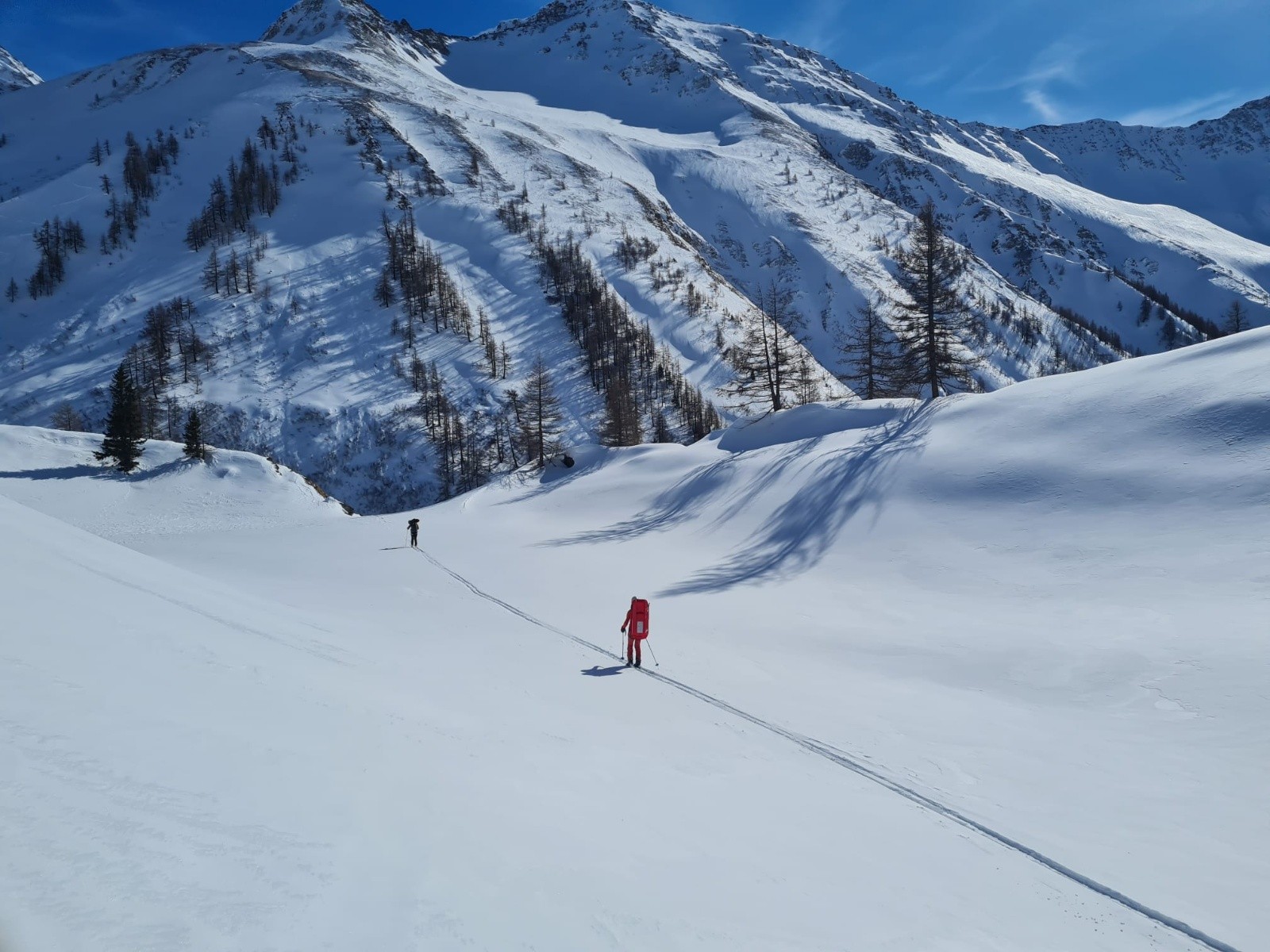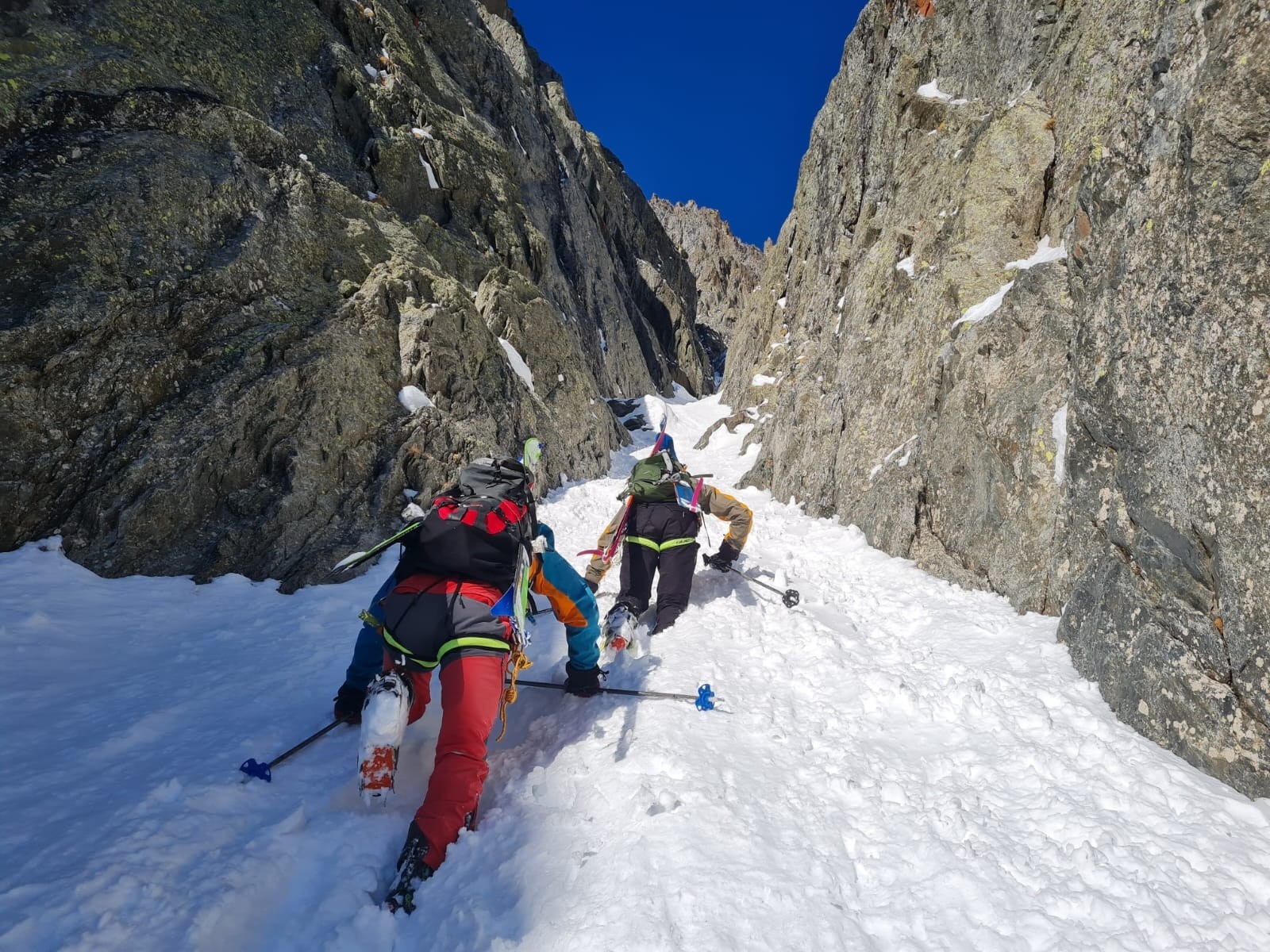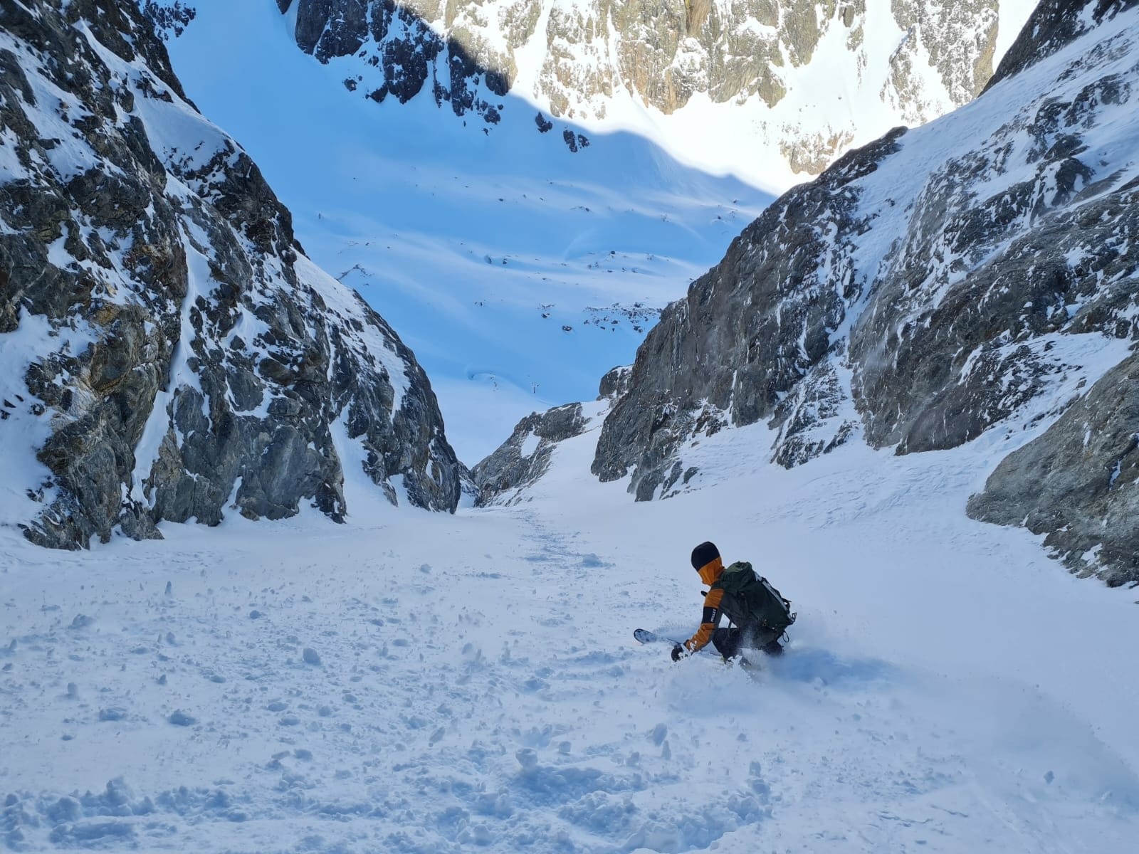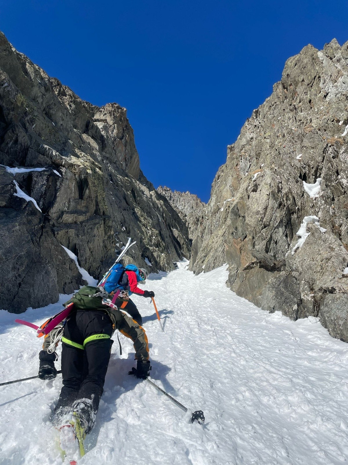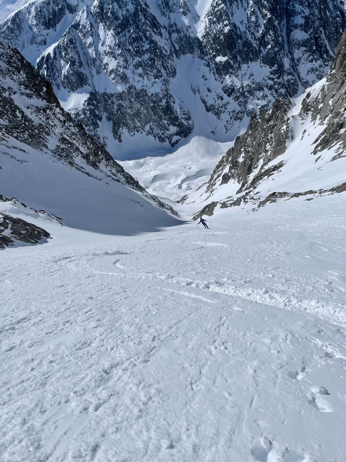Quasi 1000m de couloir dans de la neige relativement profonde, ça fatigue ses hommes. Sans regret, le timing est optimal pour la descente.