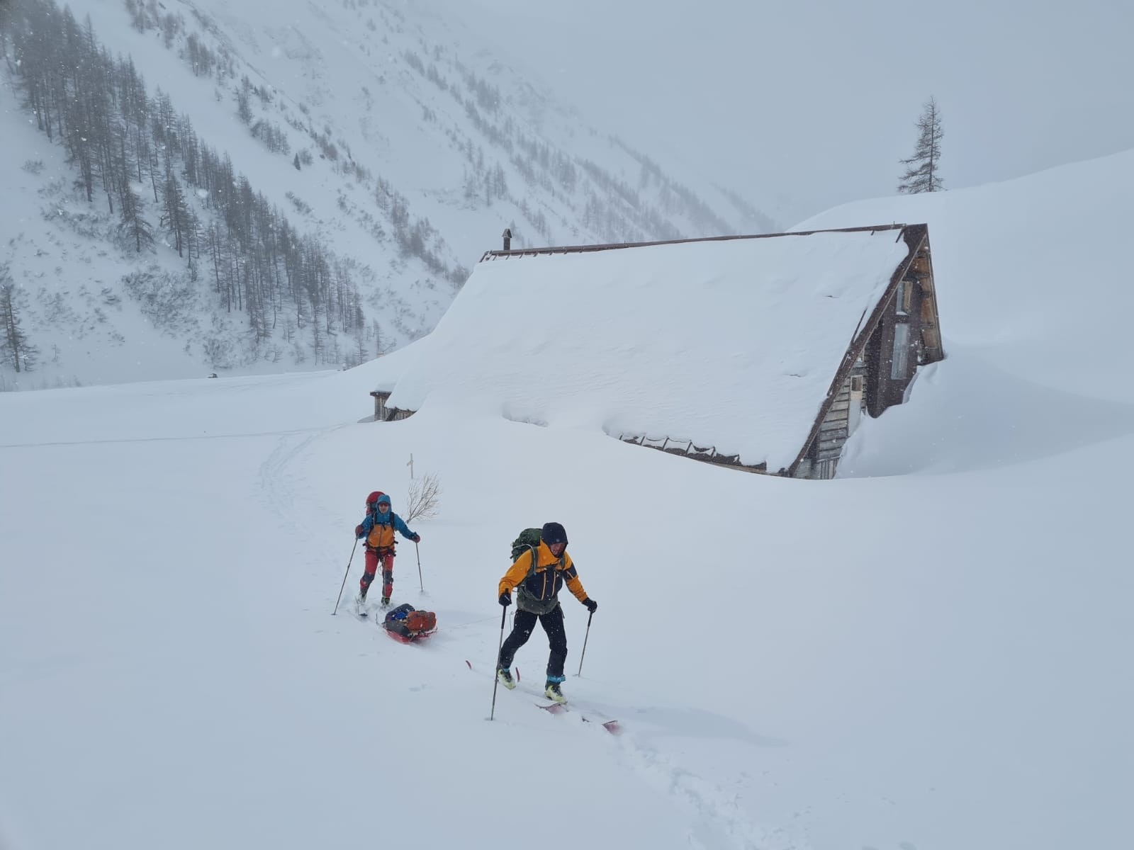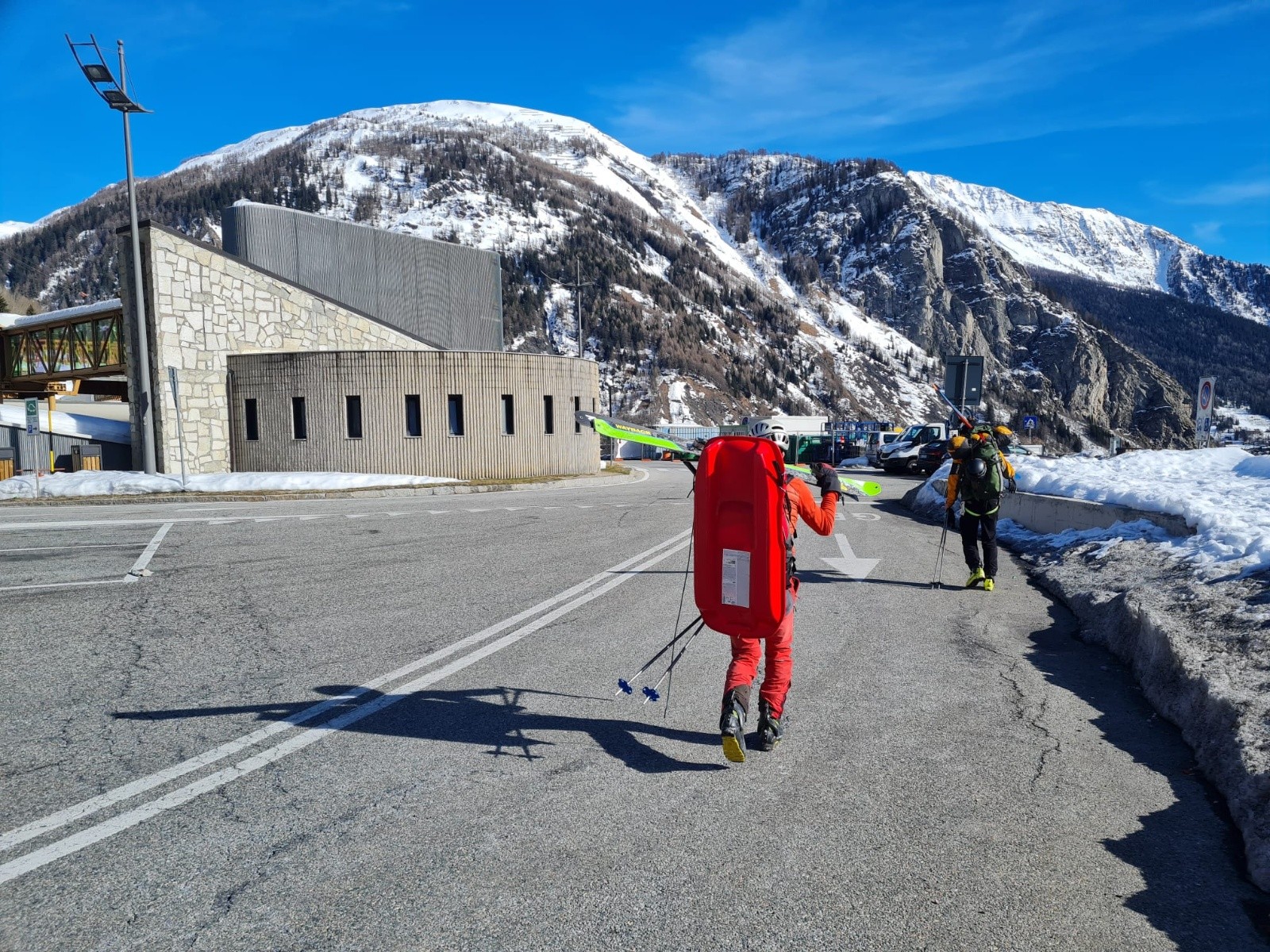 Pas peu fiers de notre pulka du pauvre, on débute notre long périple sur la route enneigée du Val Veni. Après 3min de quiétude on se fait doubler par une première motoneige... Puis par environ 1 toutes les 10min. Retour à l'état sauvage qu'ils disaient...