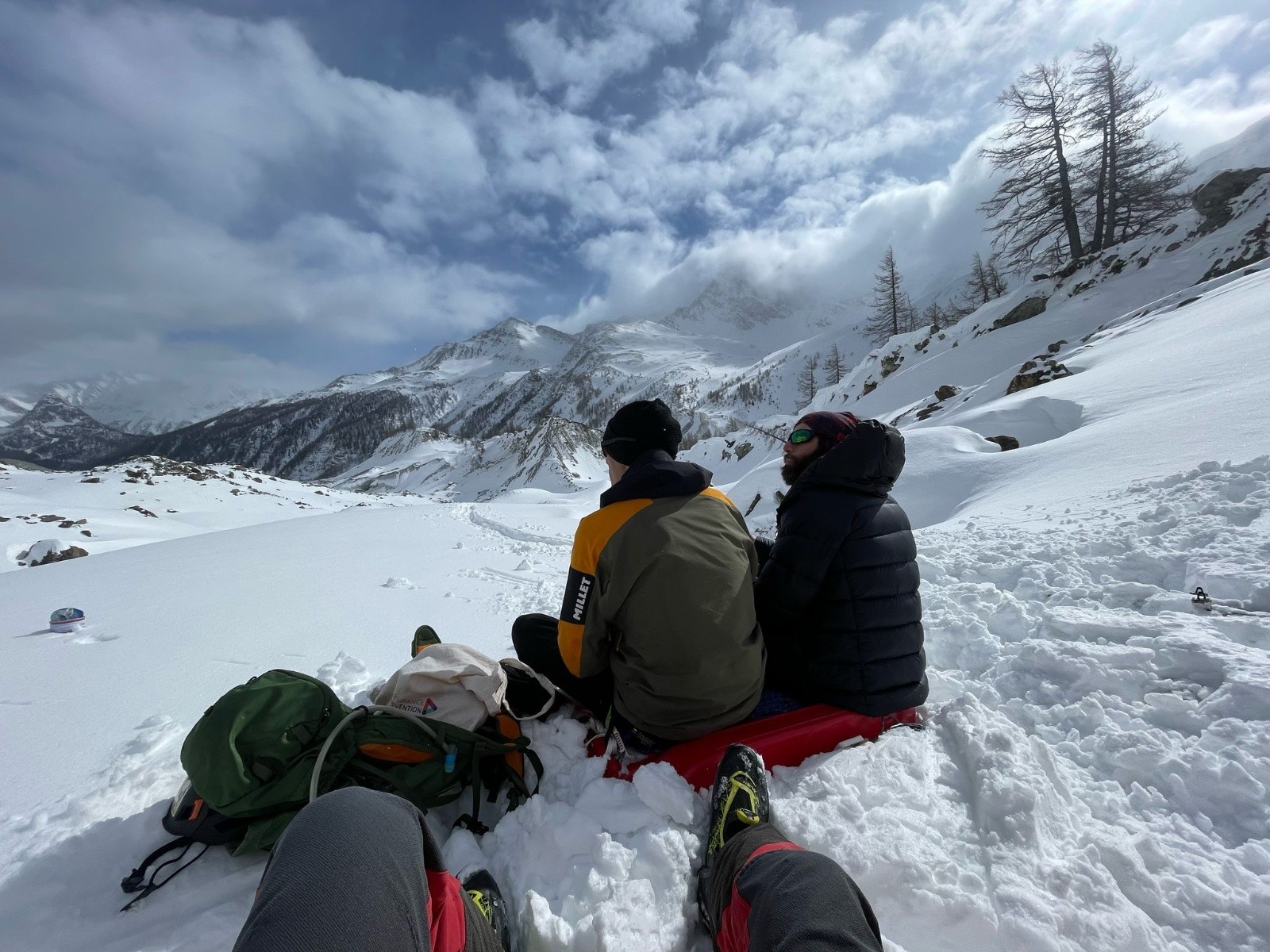 Picnic sous les premiers rayons de soleil de la journée, top confort sur le banc formé par notre luge retournée (#macgyver).
