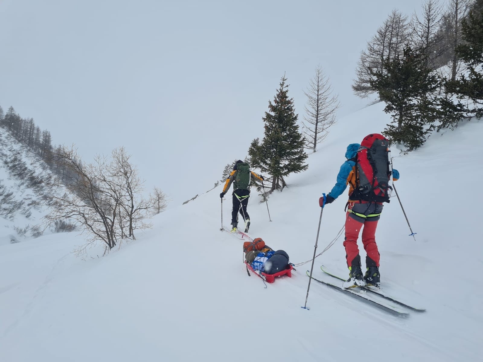 Démontage de bivouac express, gestion de l'ensemble du paquetage dans et hors les sacs et accrochage de notre pulka de fortune sur le dos de celui qui a le plus un style de luge à foin (elle est cadeau celle là Manu, comme ça tu insisteras peut être moins la prochaine fois pour que je fasse le CR :p)