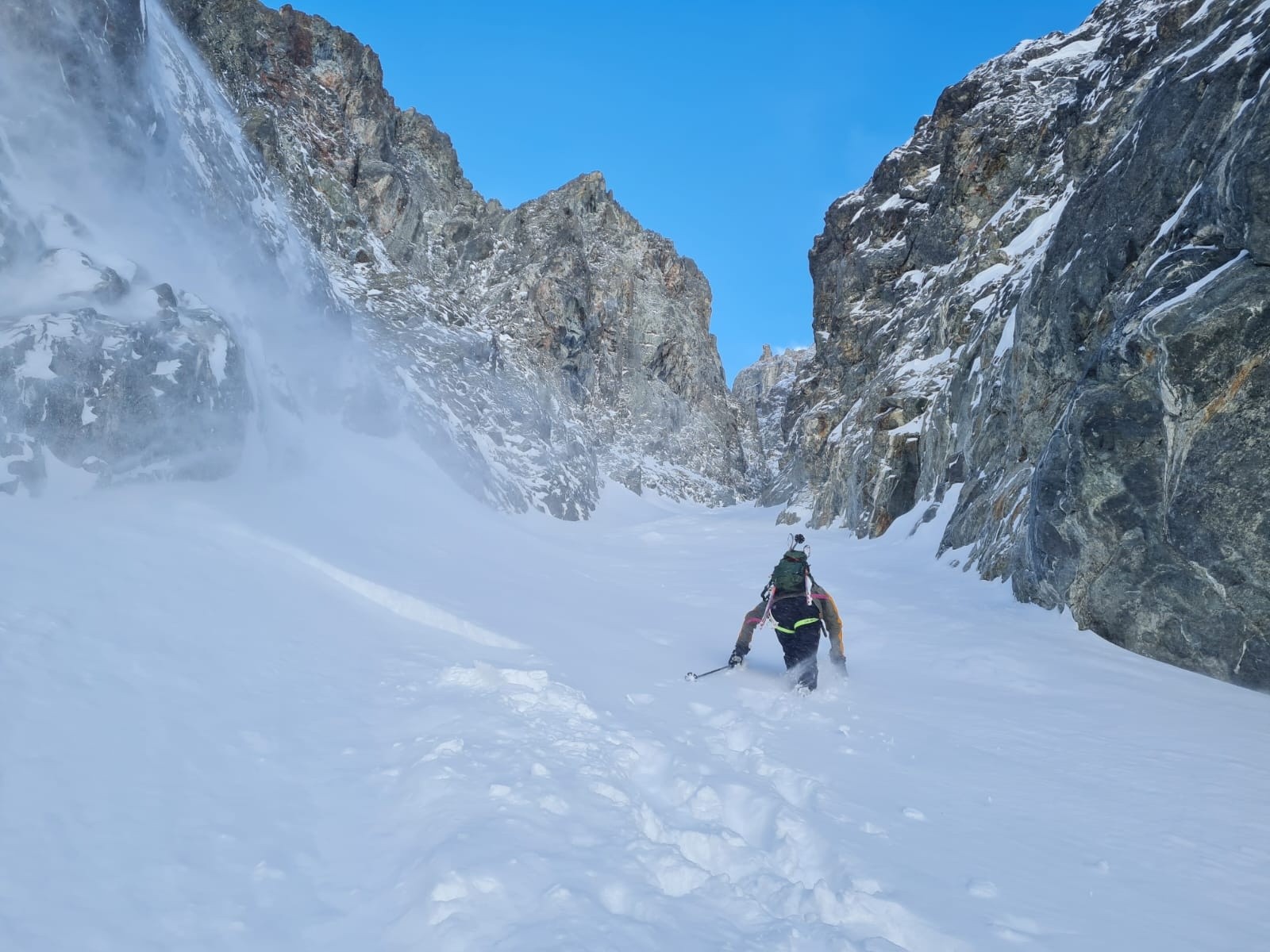 On tente d'abord rive droite dans le couloir NNE de gauche du petit Mont Blanc. C'est beau, c'est bon mais c'est trop chargé par les spindrifts en provenance des falaises. Demi tour après le déclenchement d'une petite plaque de surface. "si il y a doute c'est qu'il n'y a pas de doute".