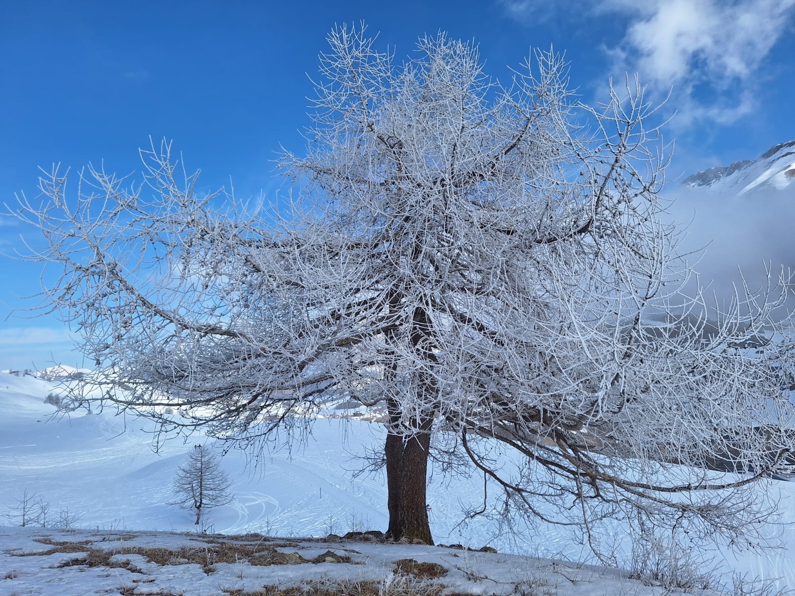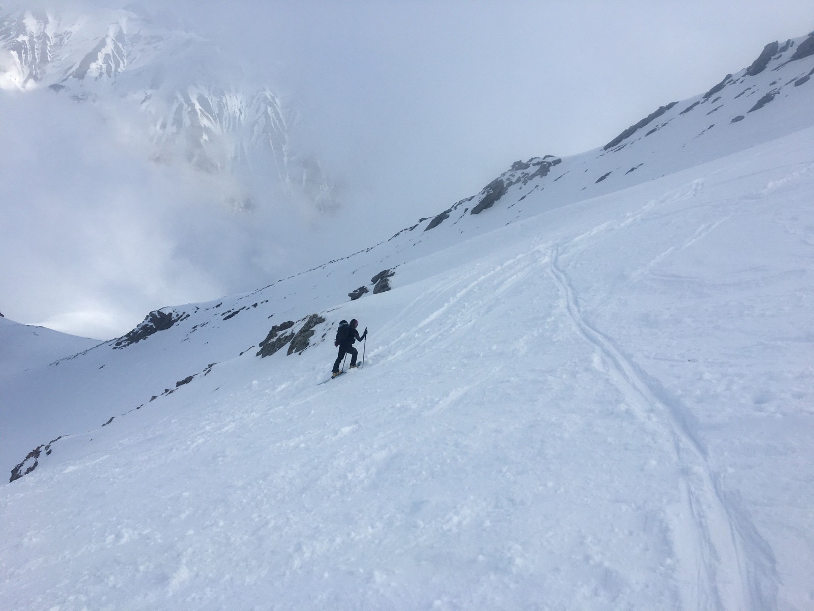 Météo/températures : Beau puis se couvre, descente dans le blanc, à suivre la trace de montée sans s’en écarter de plus de 5m sinon on se perd…