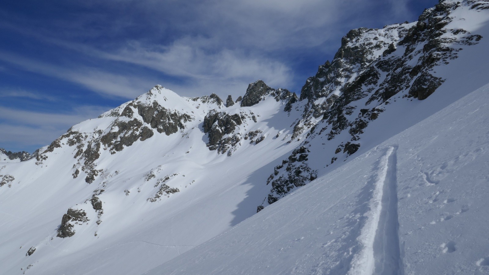 De l'autre côté on rejoint la trace et on se dirige vers le Grand Replomb. Ici aussi ce n'est pas tracé dans la combe habituelle mais sur le premier contrefort. La trace est belle alors on la suit, de toute façon elle va au bon endroit. Pis c'est au tour de Fred de râler car il avait envie d'aller au Ferrouillet comme les deux groupes du moment, restés au fond du vallon et qui vont pour remonter un petit couloir à pied pour accéder à la combe. La neige commence à croûter mais on monte dans une trace profonde. Arrivés sur l'épaule, on repère la première option de descente tout droit, à priori croûtée et avec potentiellement des cailloux. On va voir la vue au sommet et on choisit de redescendre dans le creux qui nous amène vers jas mouton. "Transfo à droite, poudreux à gauche me dit Fred en jetant un oeil"... En réalité au bout du premier virage, croûté à gauche, pas assez décaillé à droite. Mais en cherchant bien, ça descend. Le passage pour rejoindre la combe qui va au col de la mine de fer est encombré d'une coulée mais on arrive à passer, la neige est meilleure sur le bas (transfo). On ne connaissait pas cet endroit. Même si la neige n'était pas au top, c'est sympa, et plutôt facile.