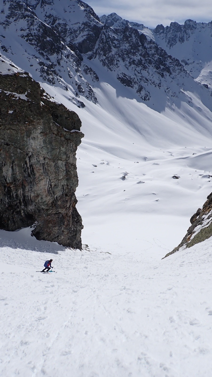 La neige est très bonne, je fais quelques pauses car le jus me manque puis je m'arrête à l'endroit pour repeauter sous le col de la mine de fer. Je surveille Fred qui va descendre son couloir, je le laisserai remplir les conditions de son côté. On remonte au col de la mine de fer. Il n'est pas tôt, on descend au plus simple par la classique. Heureusement c'est plutôt bon. Au lac on traverse rive droite donc on descend par le GR et la trace pas du tout habituelle. Le border est bien gelé mais ça fait comme une piste étroite en bosse et ça passe assez bien.
