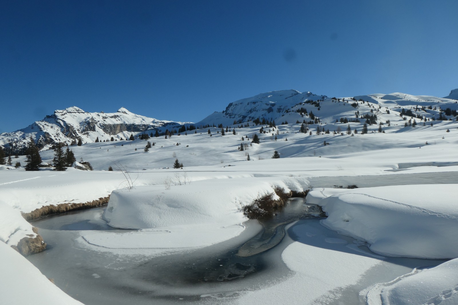 Conditions d'accès/altitude du parking : route enneigée (quasi en continu) à partir de 1000m. Parking sur la route du Lignon, 1000m.