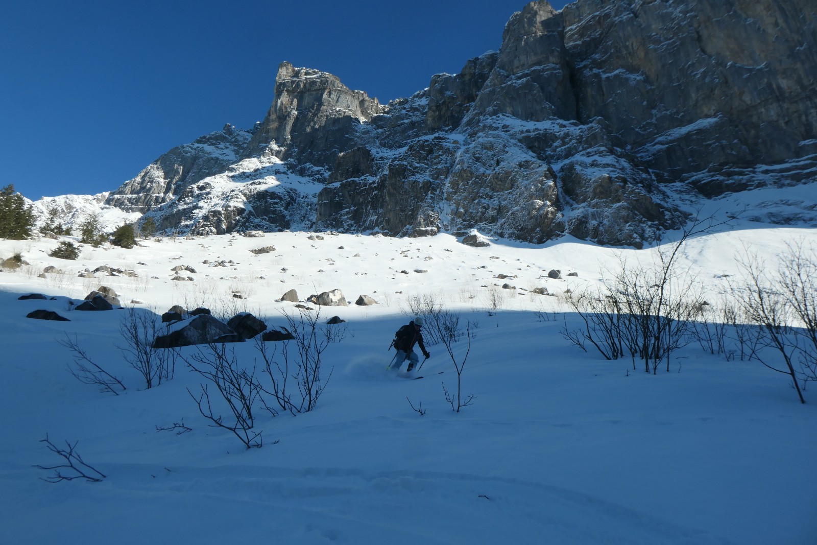 Malgré les passages la descente est super bonne en neige froide, qui prend parfois des allures de border cross un peu raide. Vraiment top. Un peu de concentration pour passer le verrou du bas puis le cône est en poudre d'anthologie ! On se laisse glisser jusqu'au fond du vallon et on repeaute profiter une seconde fois du cône, tant qu'à avoir fait le trace.