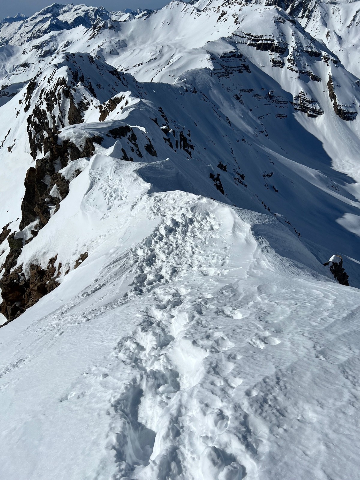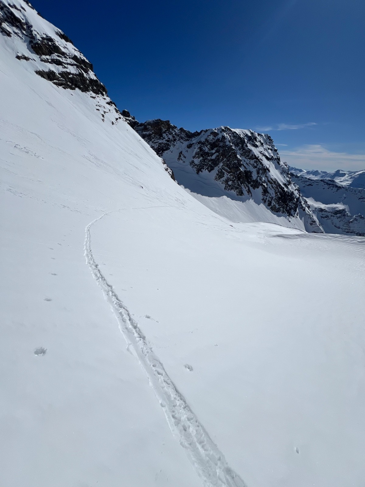 Conditions pour le ski : au dessus de 2700m la neige est plutôt restée froide (donc croutée selon orientation ou pas décaillée selon d’autre) en dessous de 2500m en versant SW et en cherchant bien moquette 5* parfaite jusque presque en bas 😋