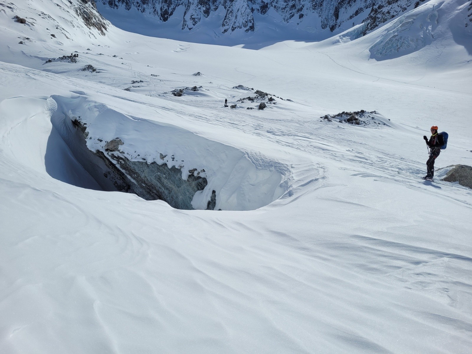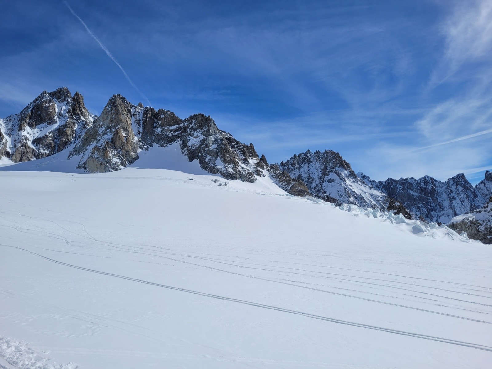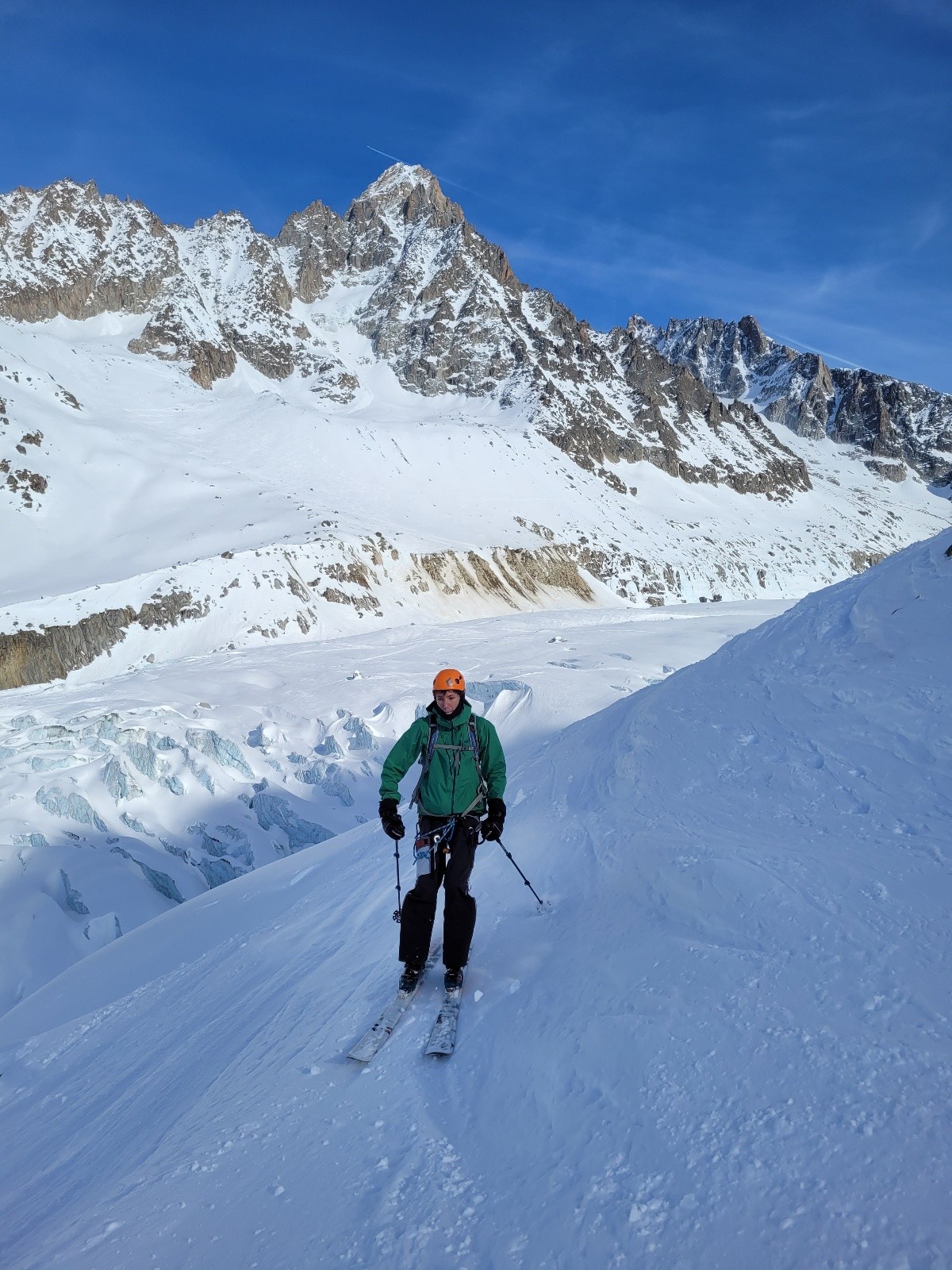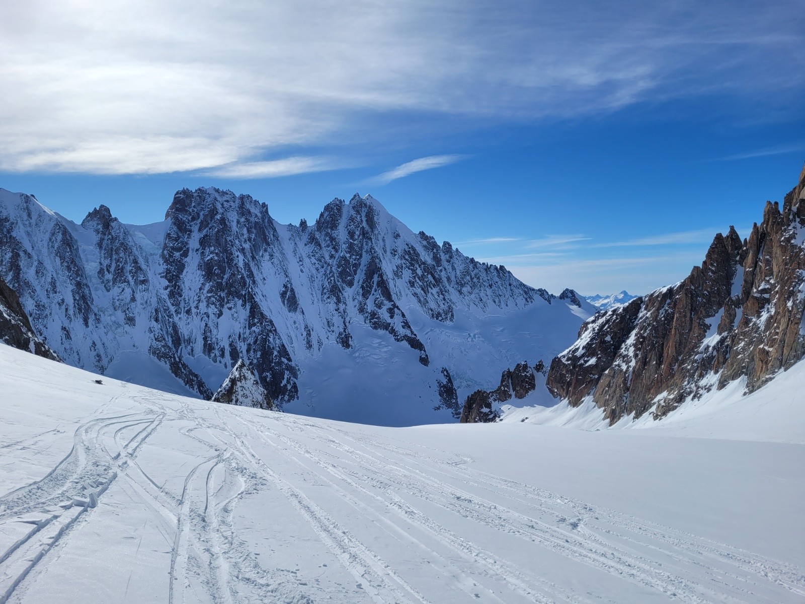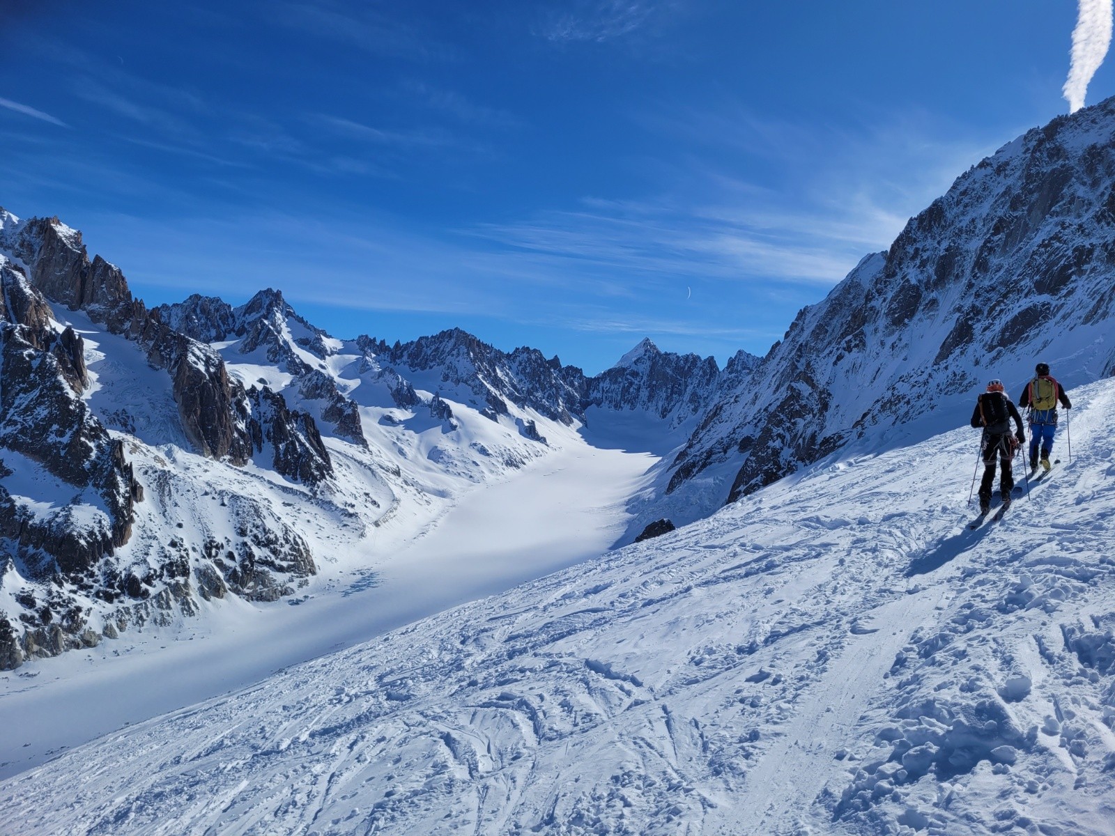 Conditions pour le ski : Très bonnes. Neige poudreuse dans les expositions autres que Sud. Revenue, par endroits regelée dans les orientations S. Du très bon ski globalement, particulièrement sur la partie haute du glacier des améthystes.