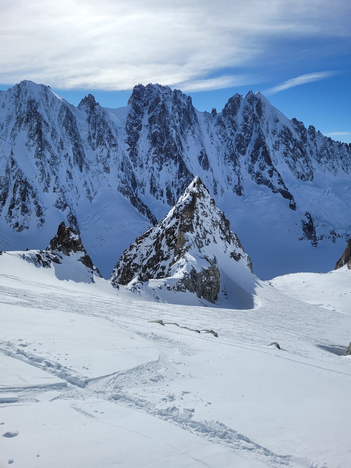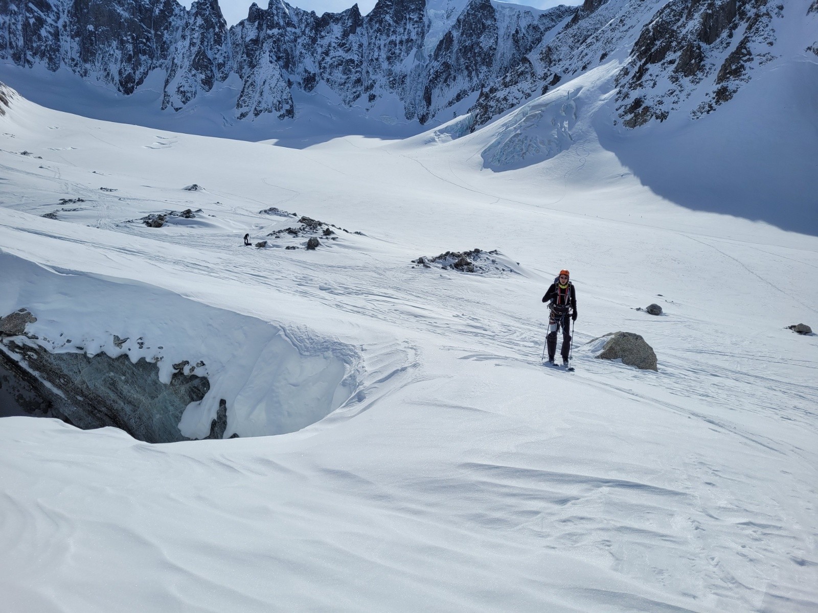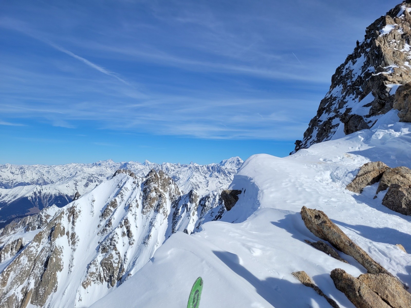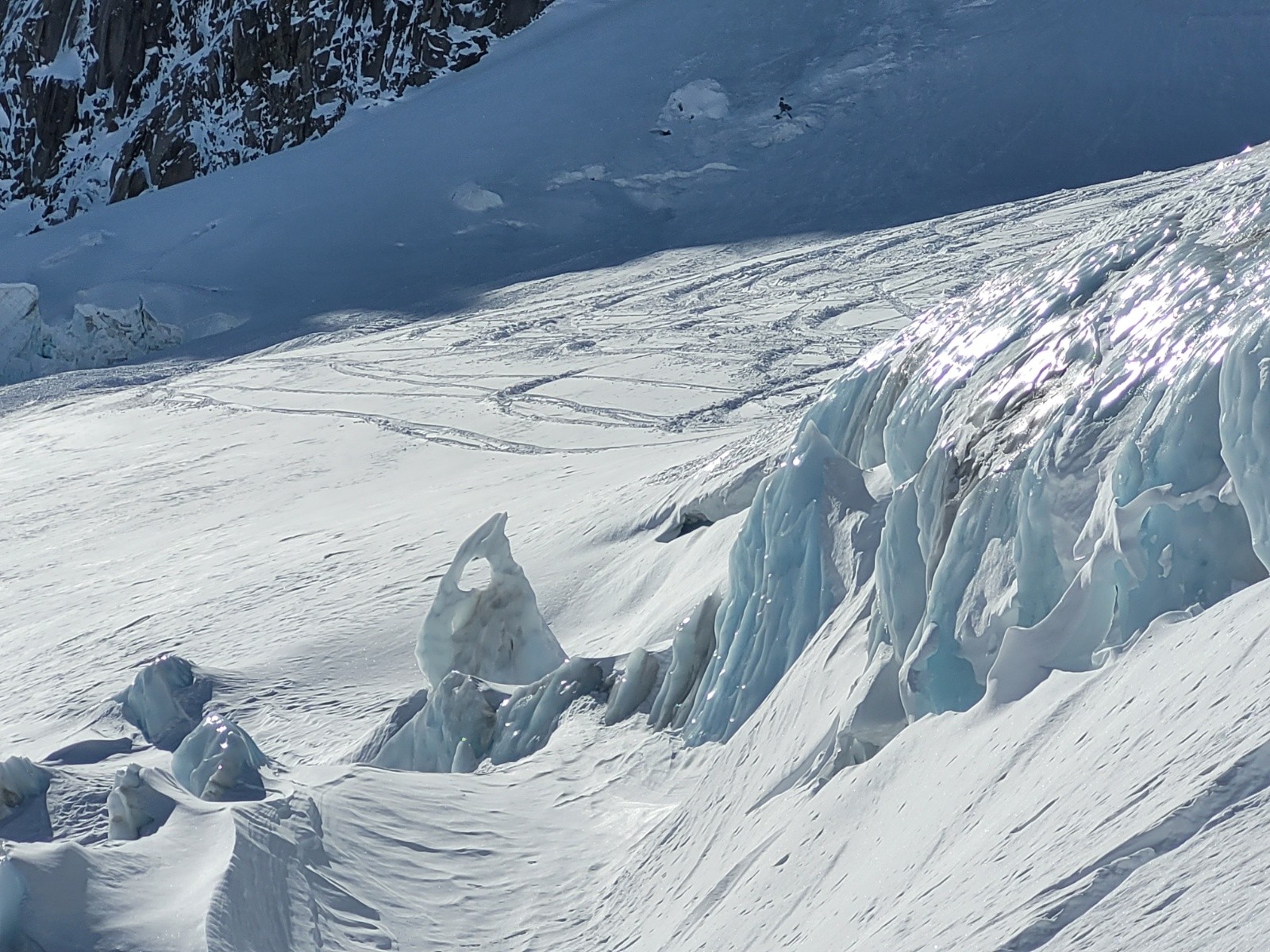 Conditions pour le ski : Très bonnes. Neige poudreuse dans les expositions autres que Sud. Revenue, par endroits regelée dans les orientations S. Du très bon ski globalement, particulièrement sur la partie haute du glacier des améthystes.