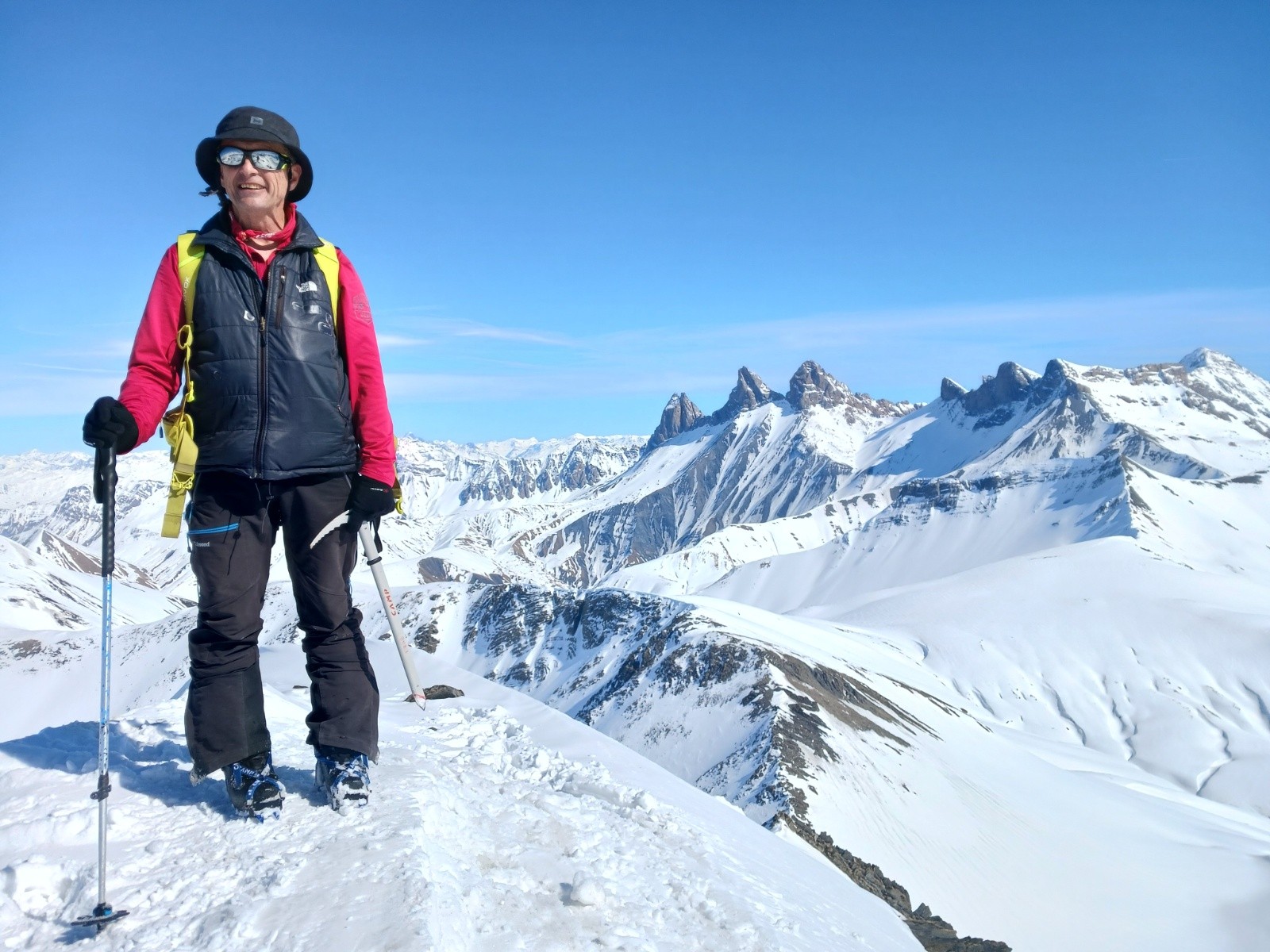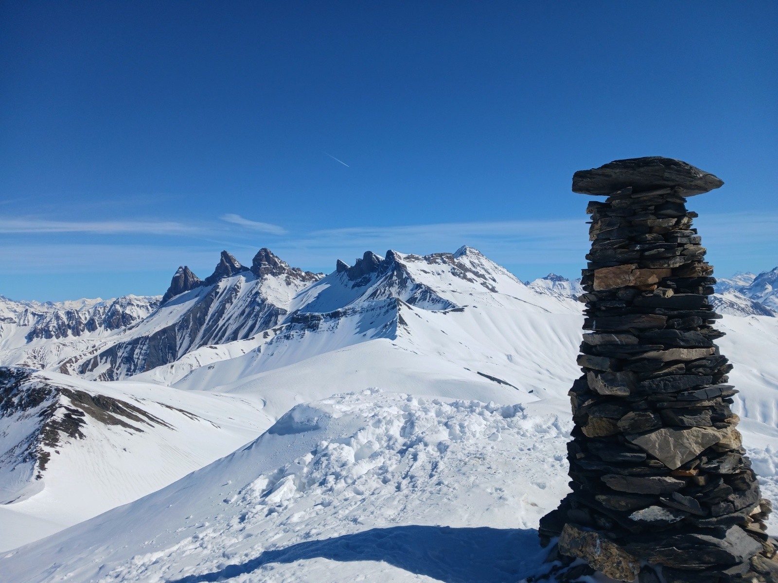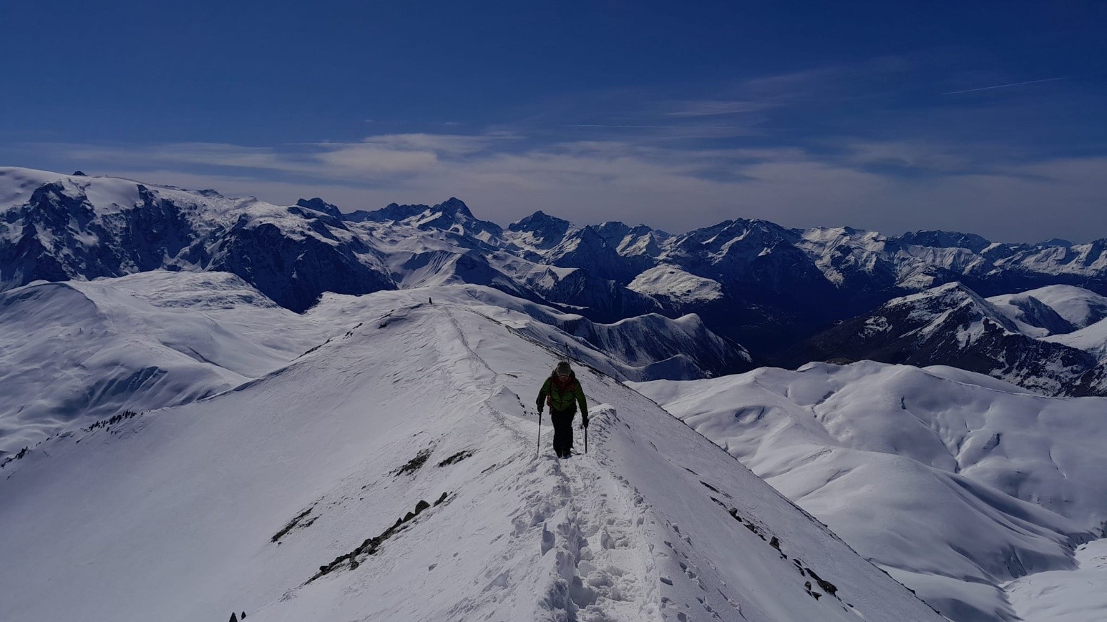 Le plus beau est à venir, sur la magnifique arête qui mène au sommet. Un guide s'échappe avec ses deux clients vers le Col de l'Infernet par le Pâquier, puis le paysage nous appartient, des Aiguilles d'Arve à la Meige, en passant par le Goléon et la Saussaz.
