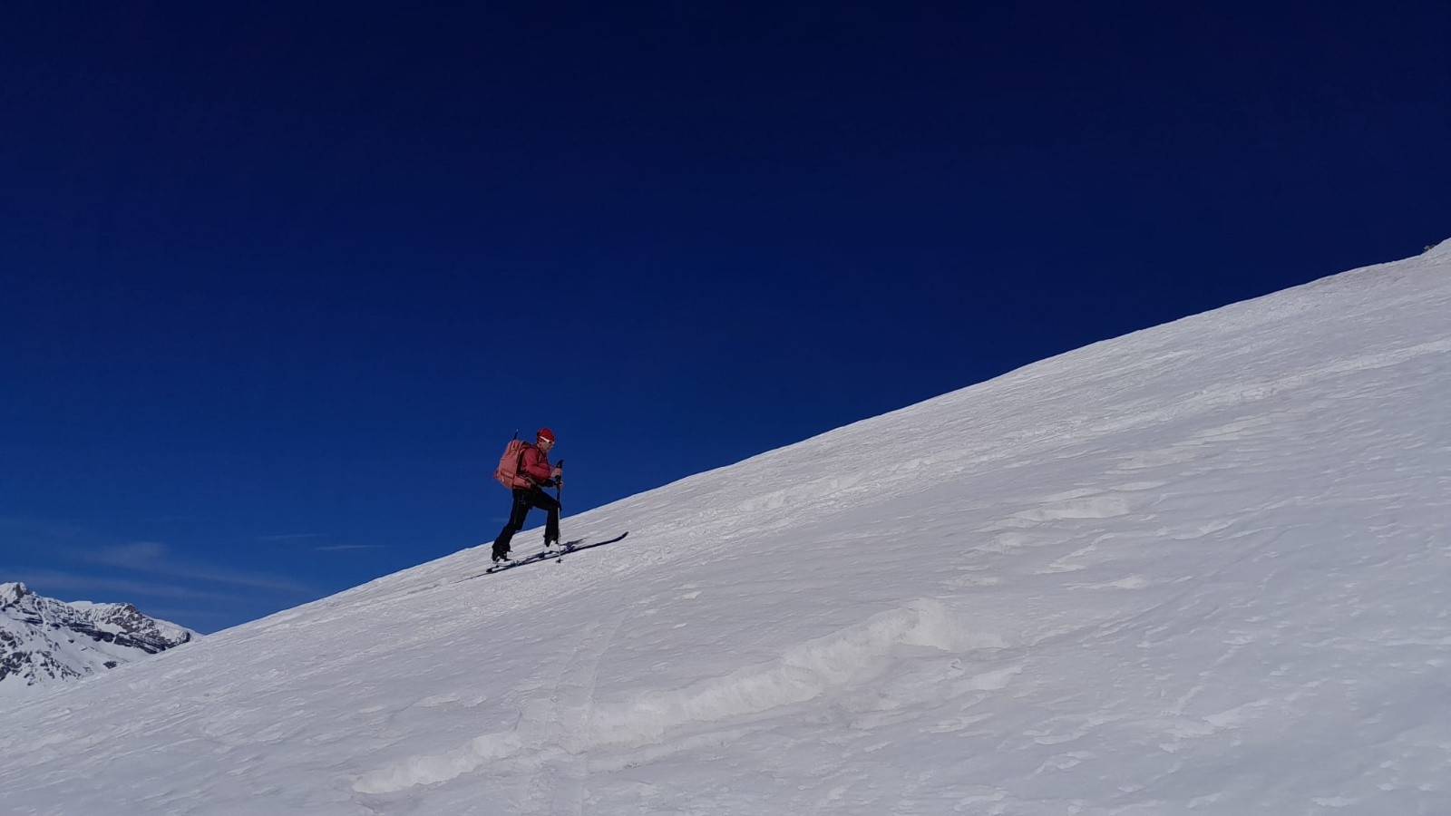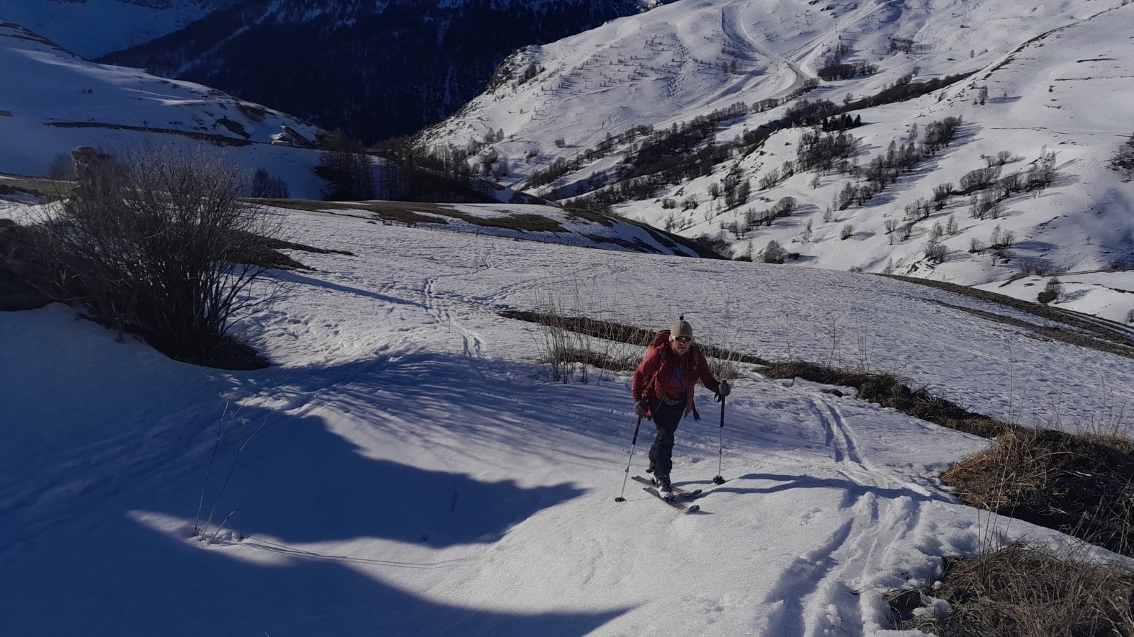 Pour rentrer,nous choisissons la montée au Gros Têt malgré ses interminables faux plats. Nous avions parié sur une descente en bonne neige vers maison rouge, mais c'est raté. Neige dure, damée, du carton peu tendre à nos jambes fatiguées. Arrivée par la piste noire et une petite remontée vers le parking de la station.