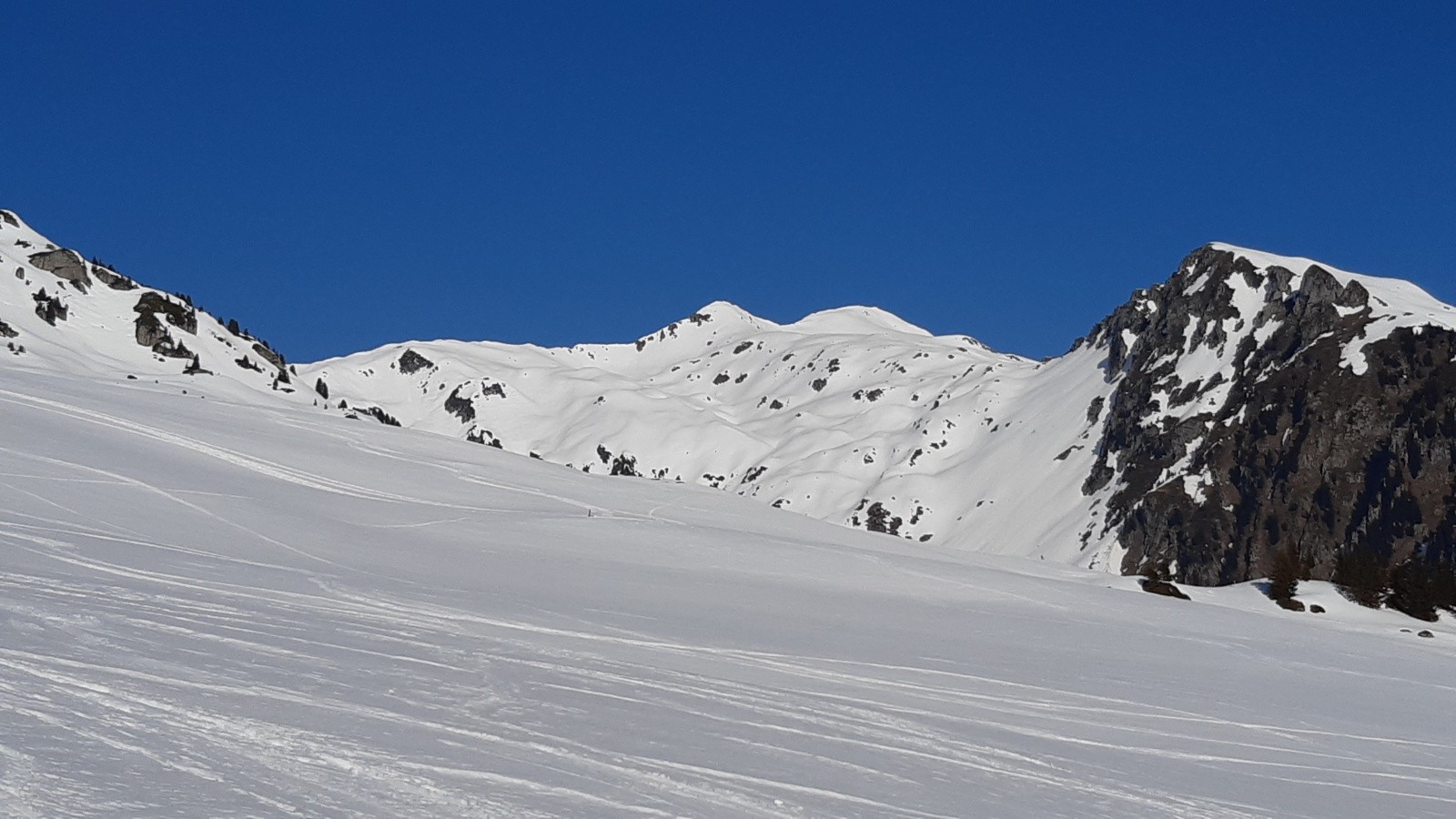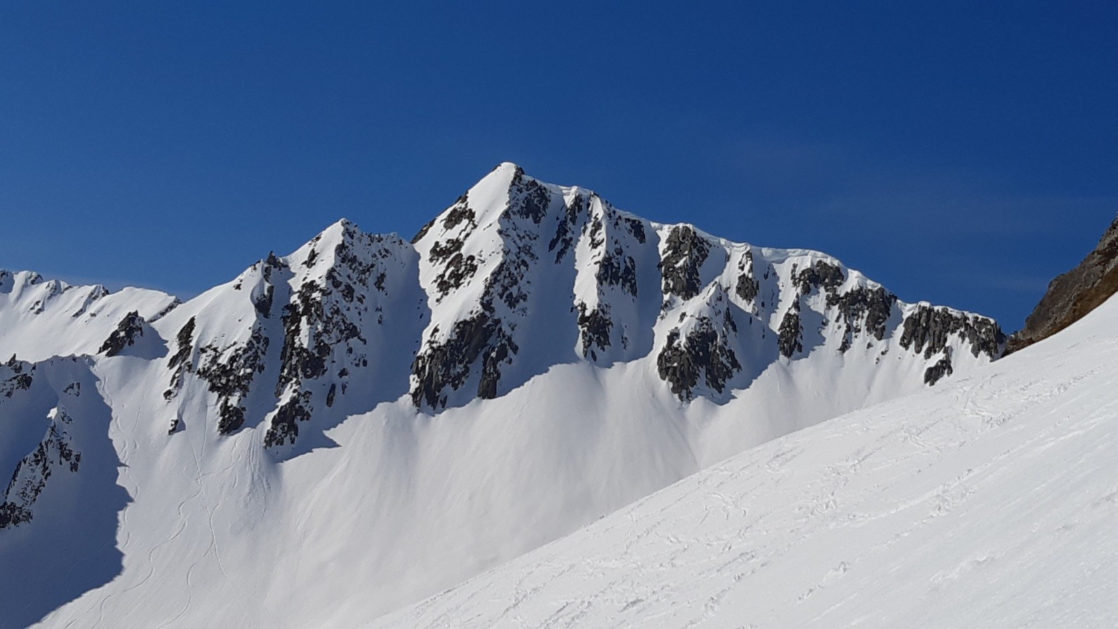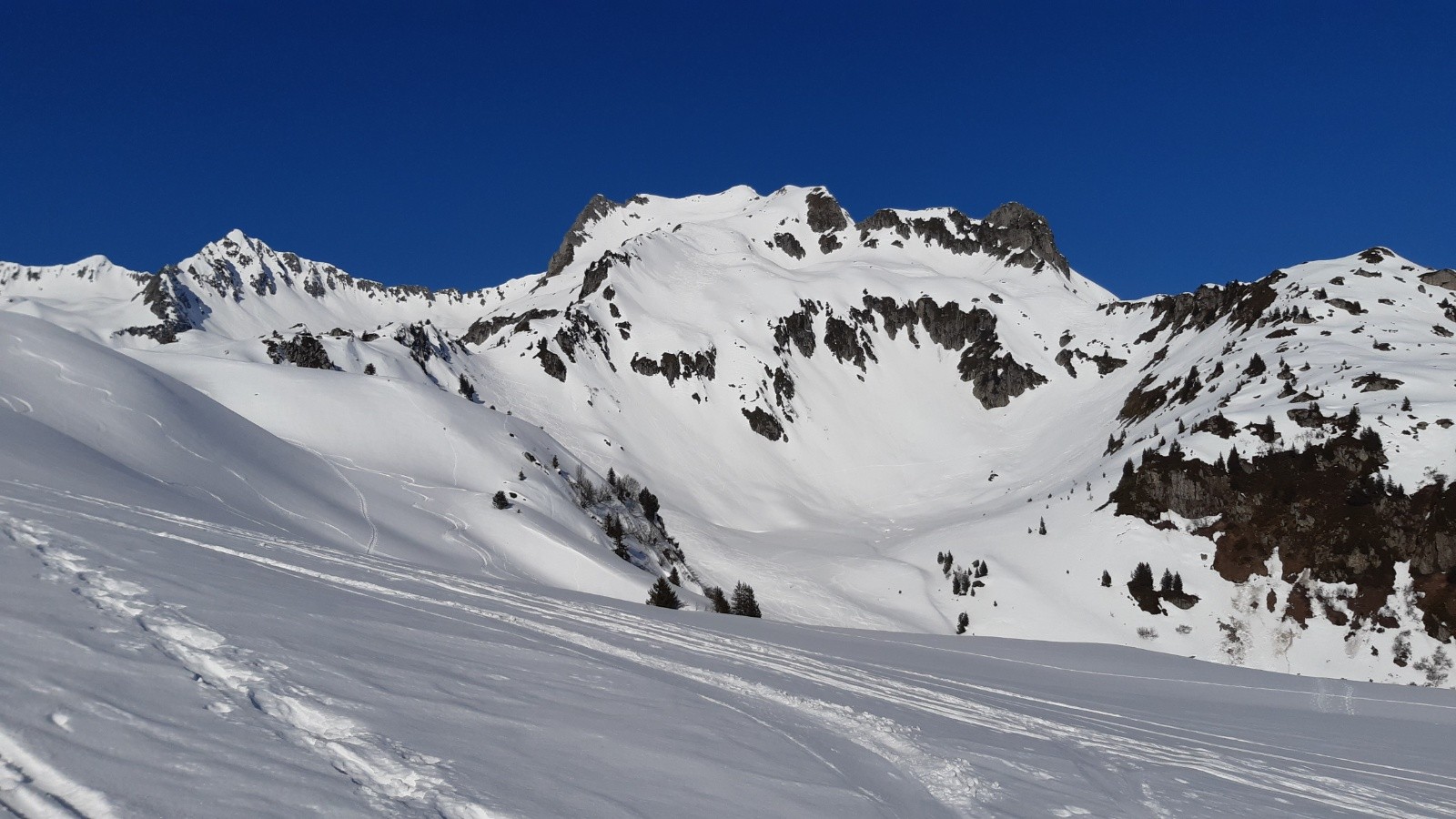 Conditions pour le ski : moquette un peu épaisse dans tout le vallon SE sous le sommet, à l´exception des 50 premiers m sous le sommet non décaillé/trafollée. Neige froide à la montée en versant nord.