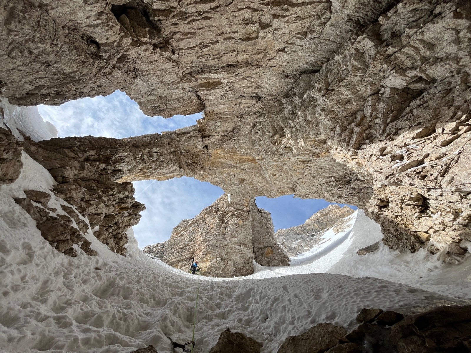 Le pas en glace passe finalement bien en piolet traction, et même si être assuré rassure, rapidement on retrouve une neige portante. Ouf, car c’est bien bien raide tout de même !