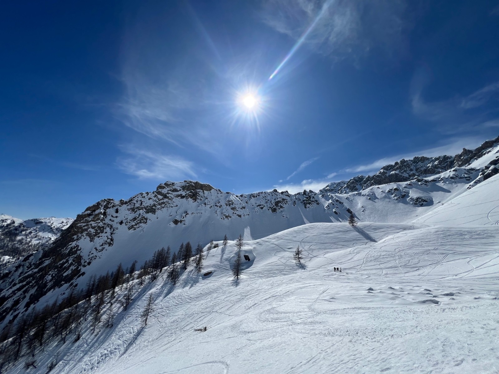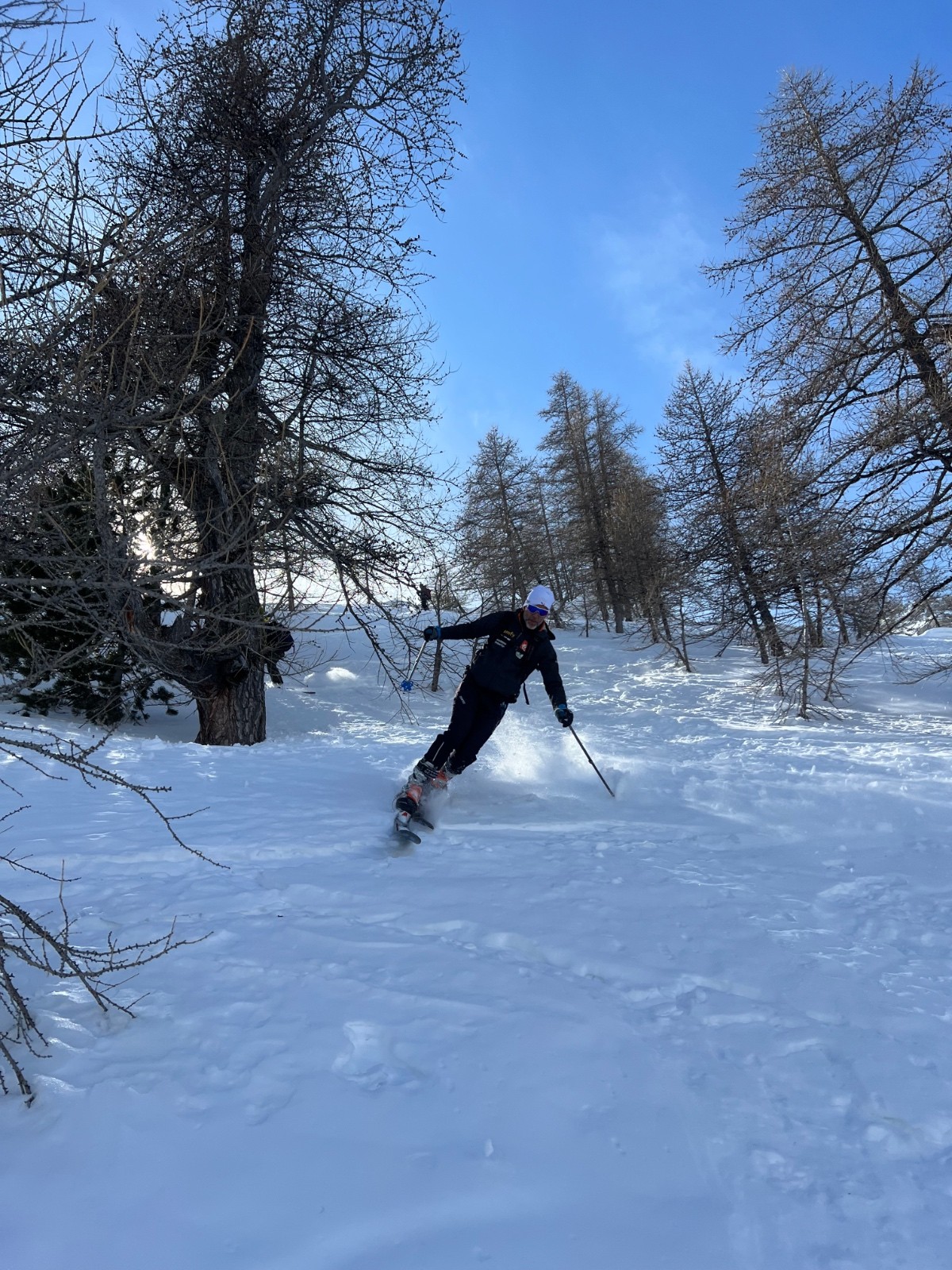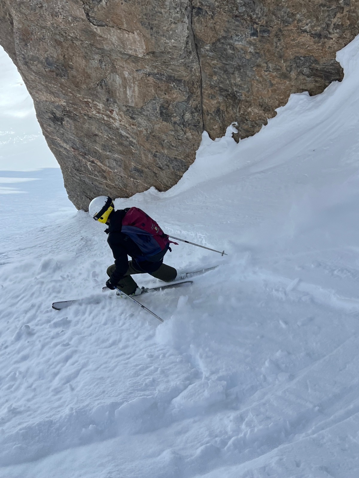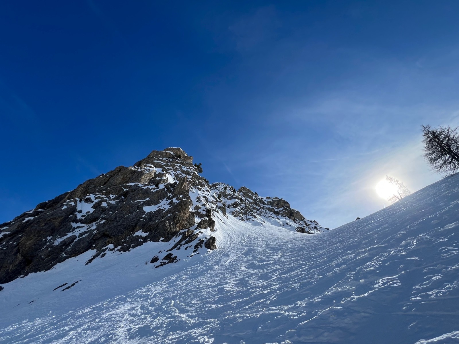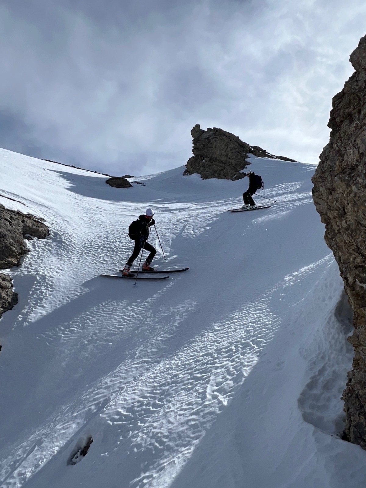 Conditions pour le ski : un peu de tout : neige froide entre rare poudreuse, dure ou croutée en N, très bonne transfo à trop transfo en Sud et Est. couloir Est en neige dure bien portante pour ses cotés et vielle poudré dans l’axe