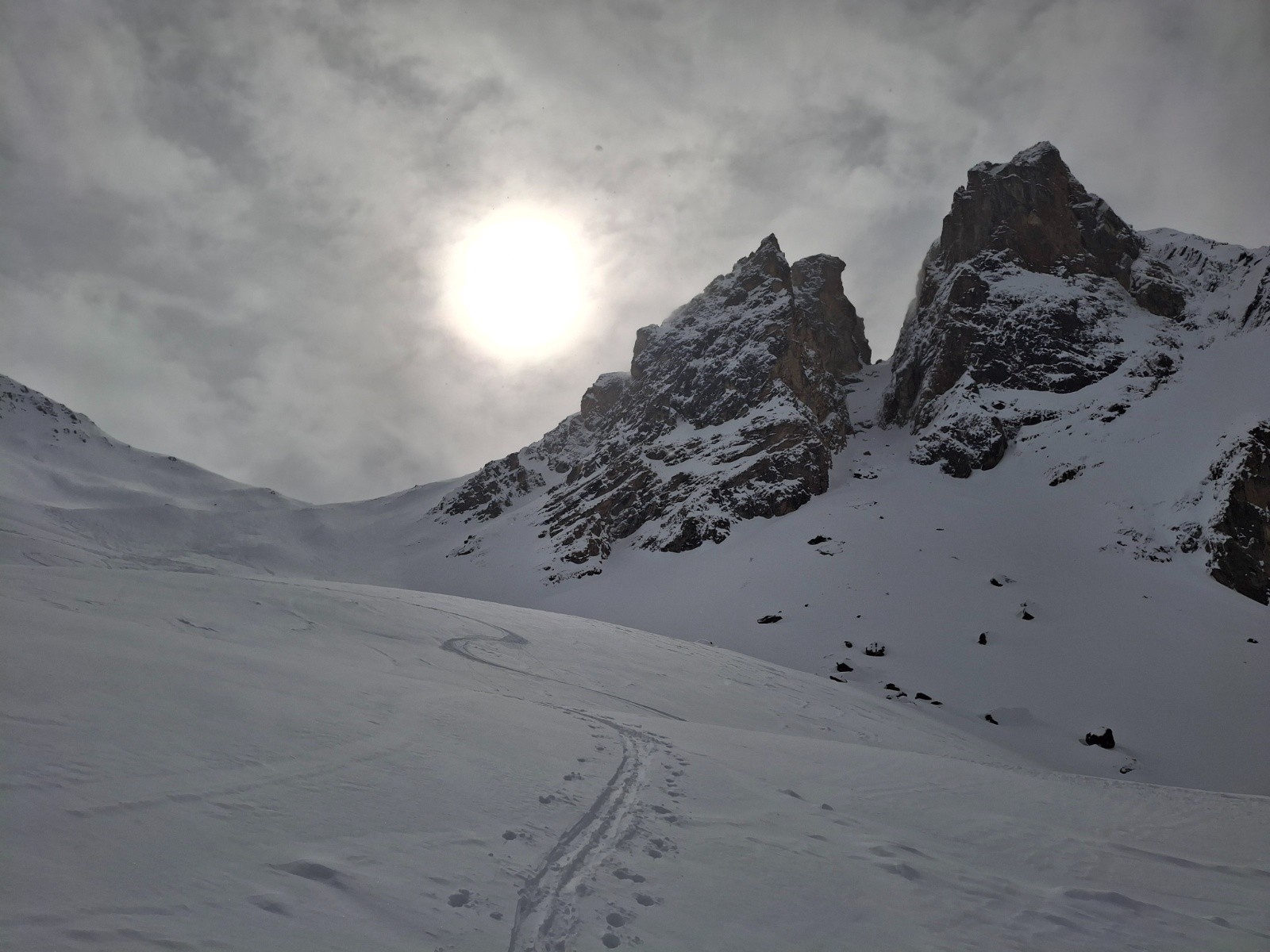 Au col, Le ciel commence à se boucher et les crêtes du Chardonnet ne sont plus visibles. La descente est super sympa avec une belle poudreuse et une visibilité encore suffisante.On en profite pour se filmer…