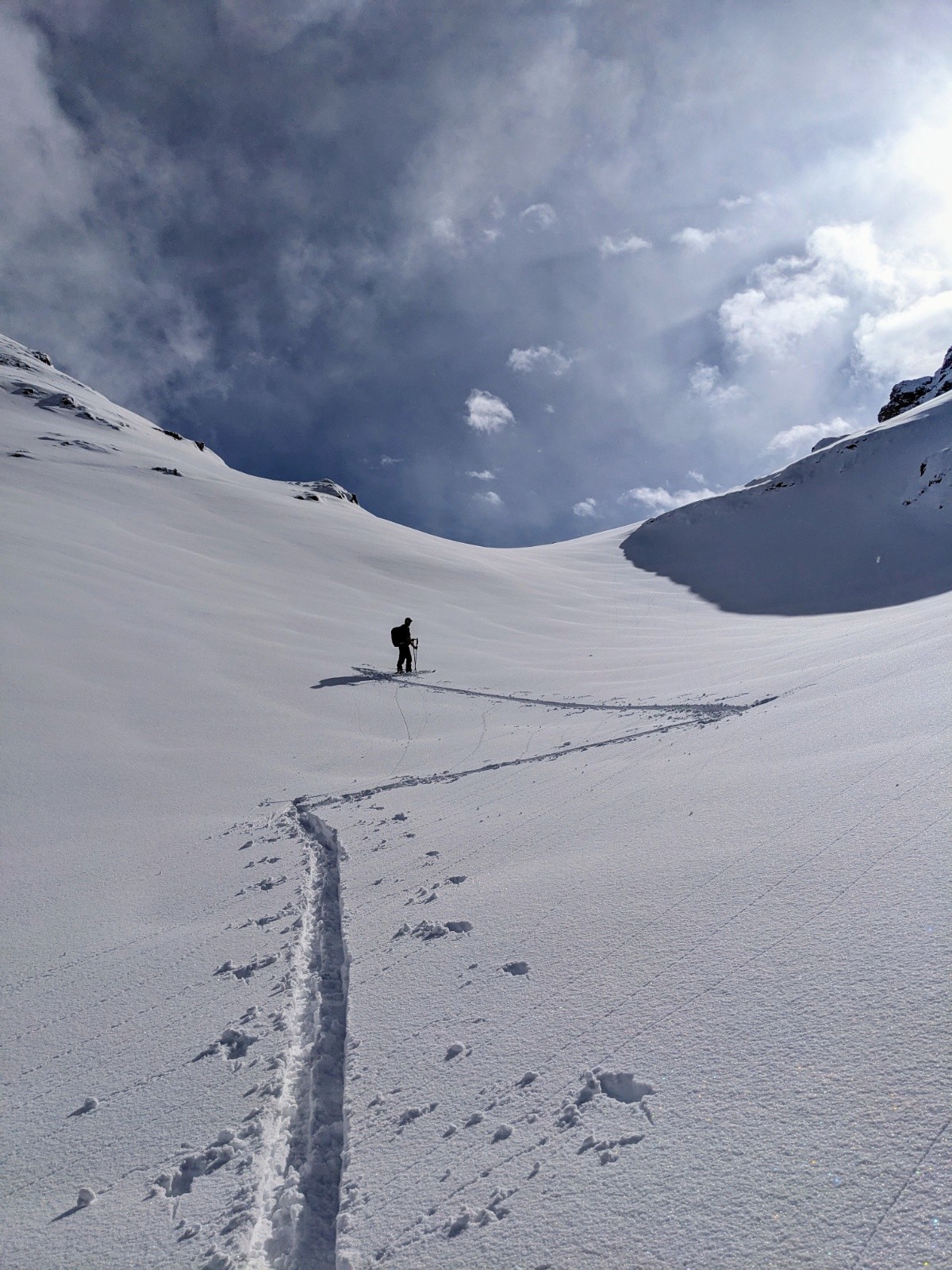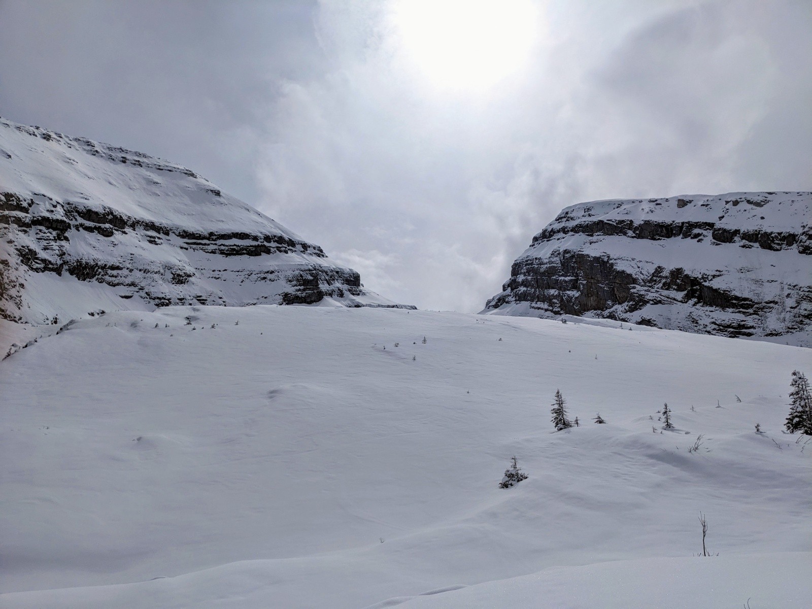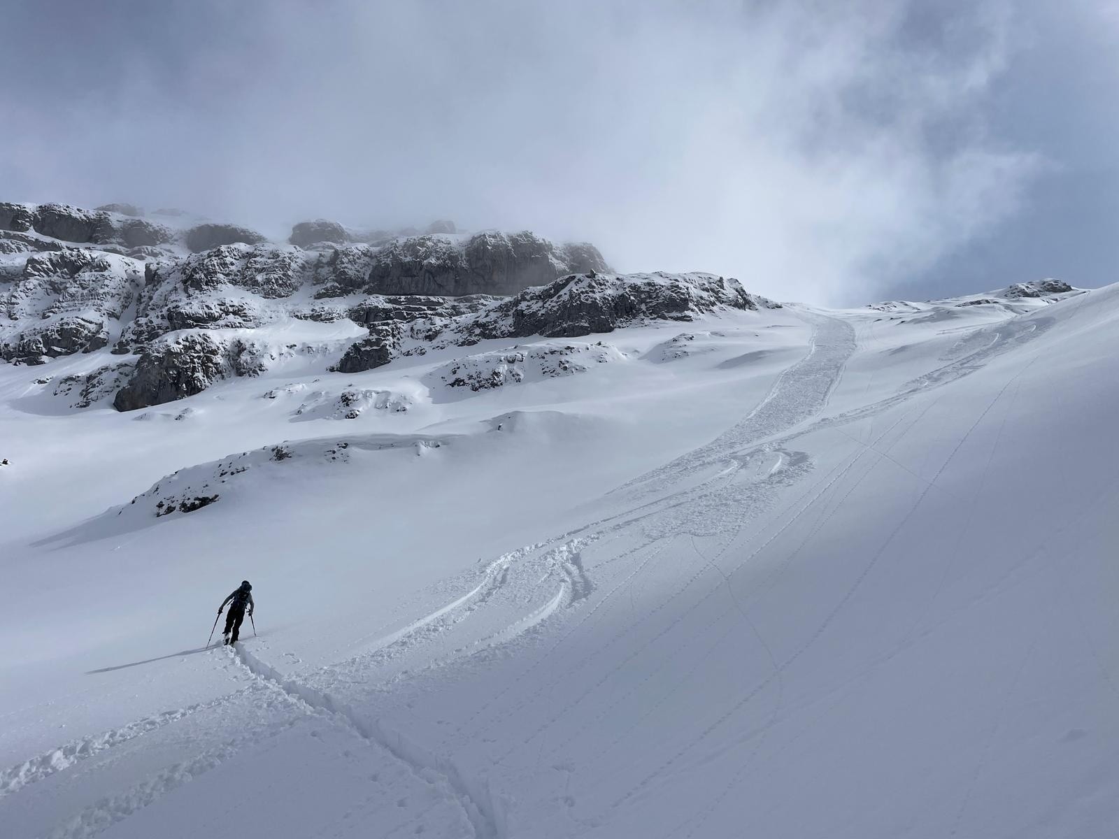 Conditions nivo et activité avalancheuse : 15 cm de fraîche, une coulée sans cohésion déclenchée visiblement par 2 skieurs arrivés du domaine skiable par le Hinterrug dans le vallon final