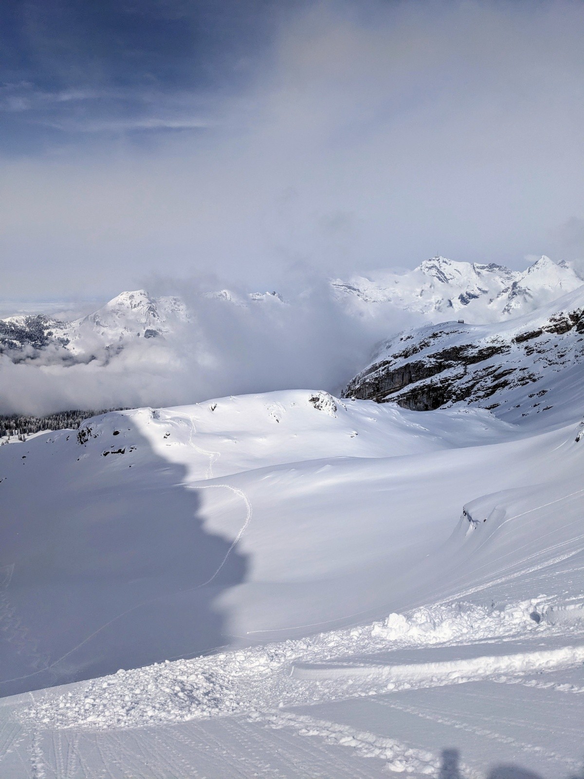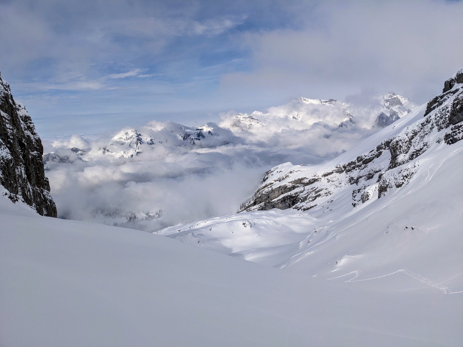 Conditions pour le ski : poudreuse lourde en haut, neige collante en-dessous de 1700m