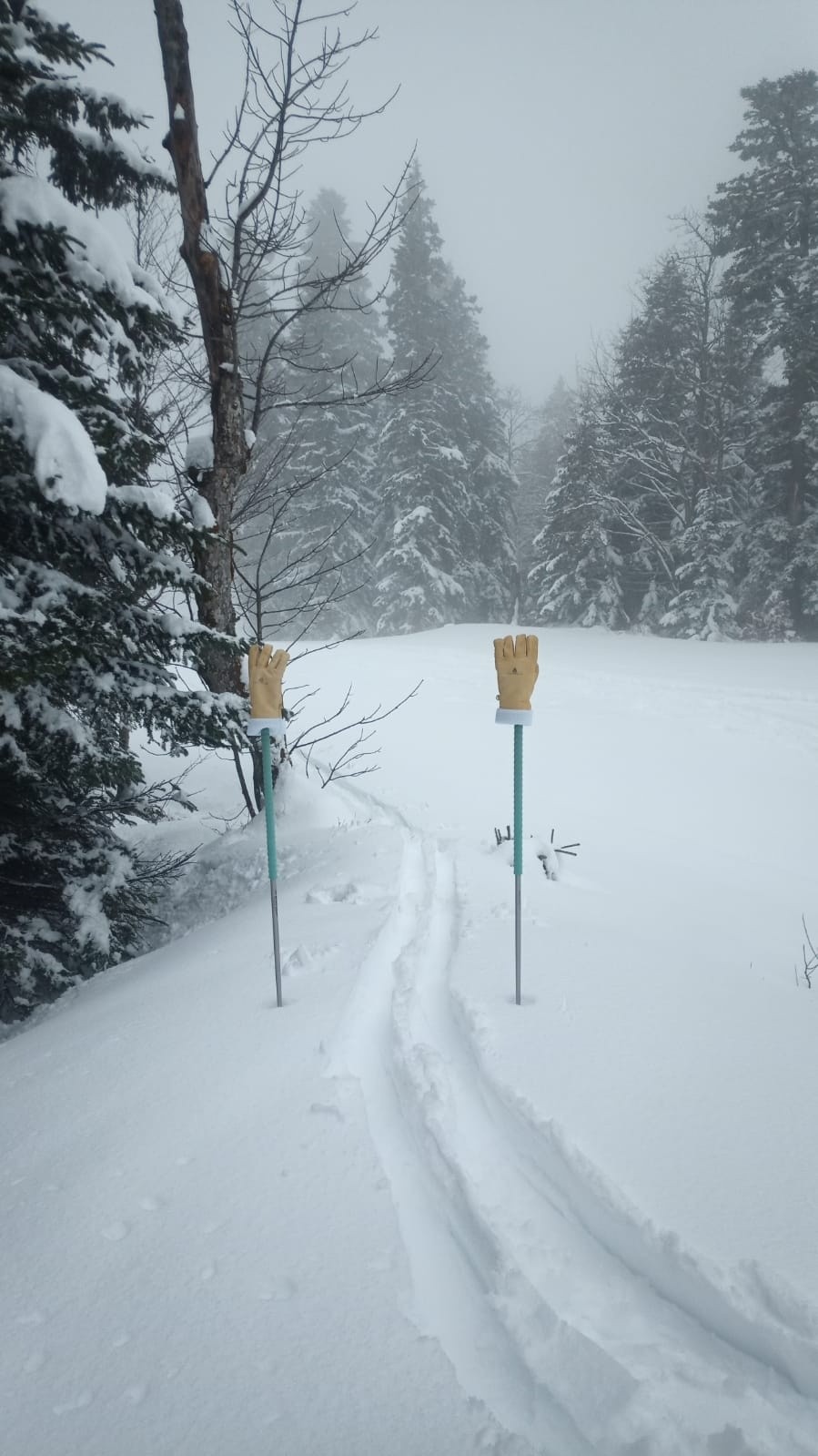 Conditions pour le ski : neige très lourde sur herbe en bas et sur ancien fond dur plus haut.