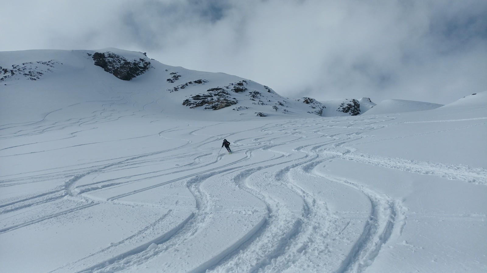 Conditions pour le ski : super poudreuse mais un peu alourdie la où elle a pris le soleil, et le brouillard gâche un peu le plaisir