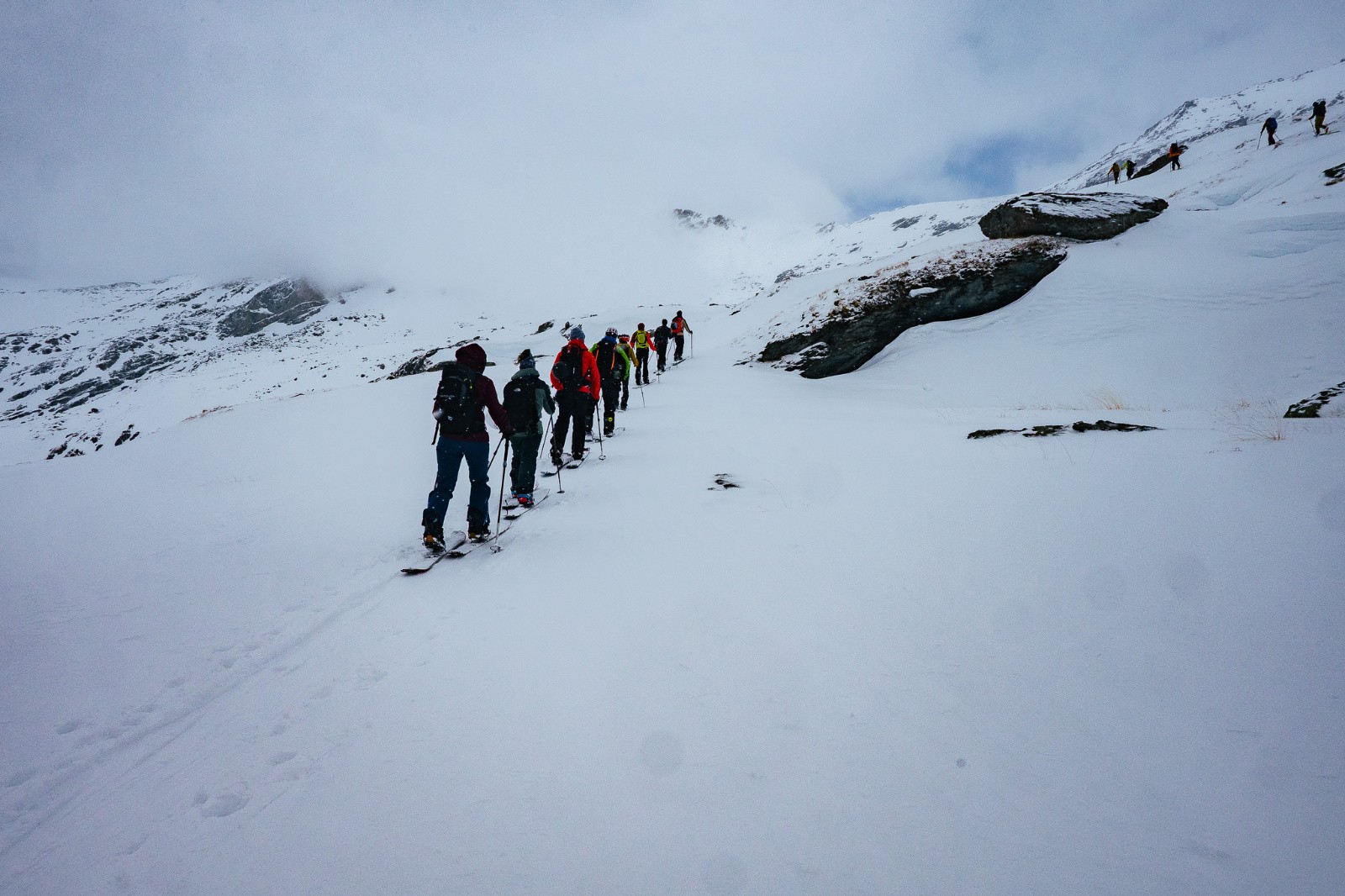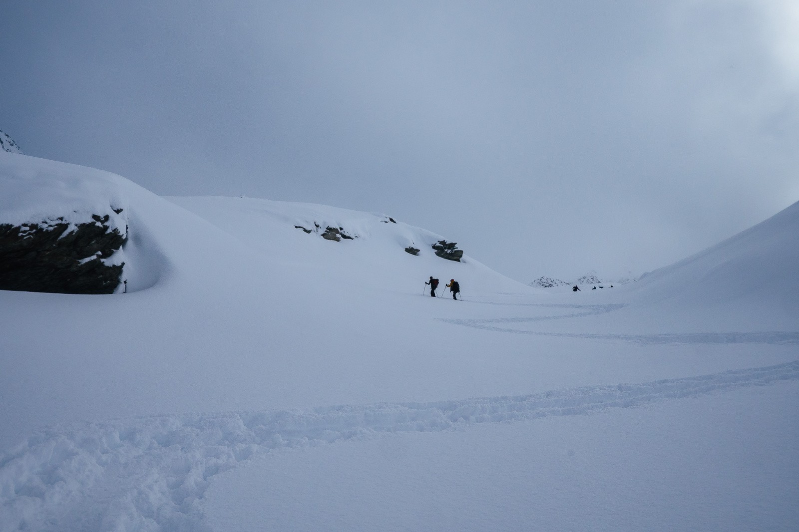 Samedi on se dirige doucement vers le lac du génépy, dans une alternance de fenêtres de ciel bleu pas si mal vu la météo. Surtout, la bonne couche du dessus est bien légère, ça va être fin bon à rider. Ça fait plaisirs de les voir tous pointer les sommets par leur noms, se guider en donnant les directions… quand on compare au premier WE où ils savaient pas de quel côté du Briançon ou Chambé ni dans quel massif ils étaient ! (Cela dit au Col du Lautaret le massif est parfois litigieux…). Arrivé au lac du Génépy, quelques petites baisse de forme "indépendante la volonté", ça arrive, une belle fenêtre de visi sous nos yeux, un bon gros nuage au loin : «On descend non ?». Bonne pioche, c'est super bon, on y voit. C'est certes pas très long, mais on aura pas le temps de finir le petit topo premier secours au refuge du Fond d'Aussois que le plafond nous sera tombé la tête.