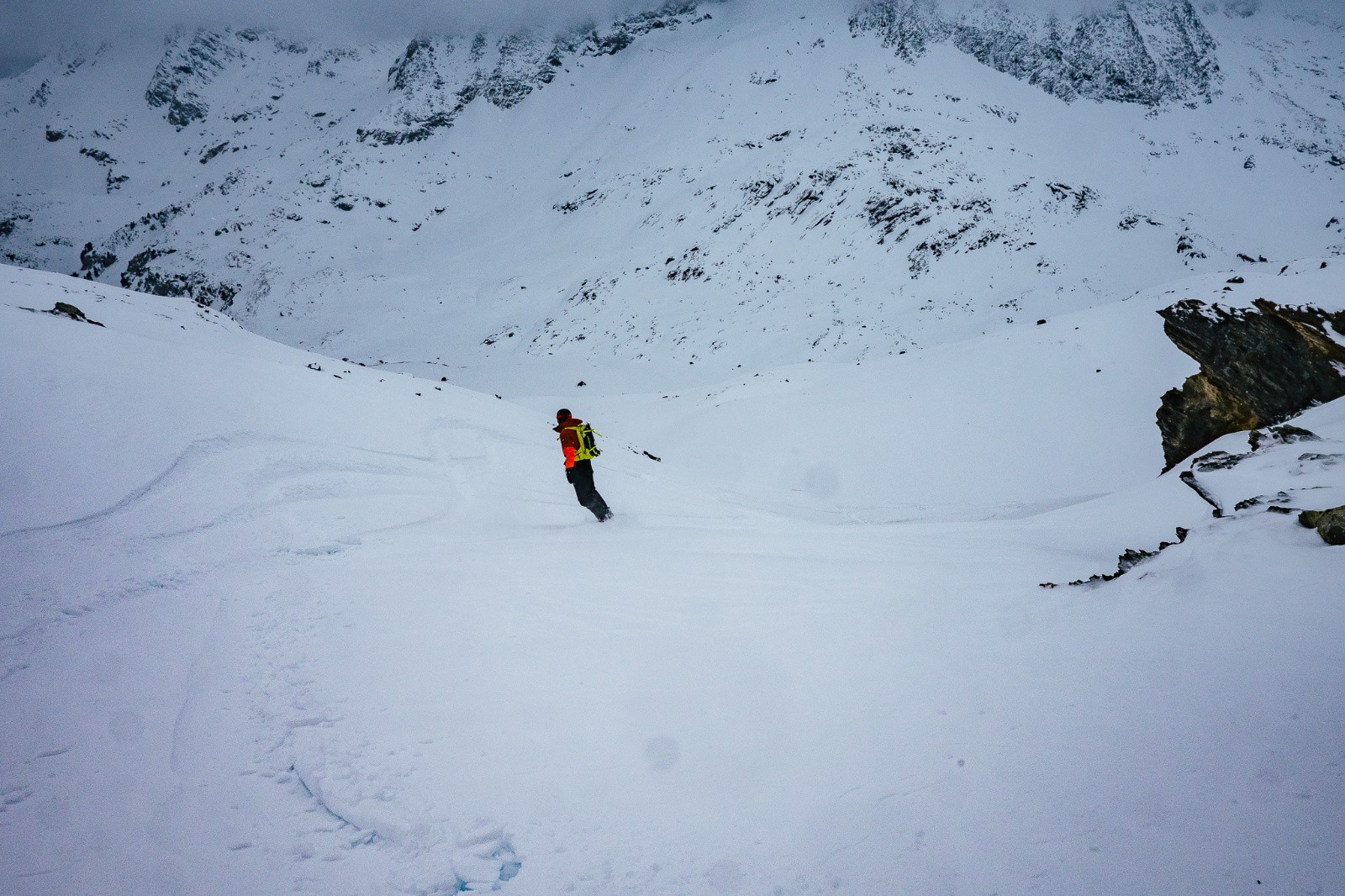 Le gardien nous conseille de nous lever tôt le lendemain, vu la possible mer de nuage. Puis bon, les premières lueurs au fond d'Aussois c'est jamais désagréable. Moi en bon fayot, j'écoute toujours les gardiens. Bonne pioche encore. On se réveille avec 40cm de poudre posé droit sur elle même—la météo en annonçait 5cm avec du vent—et une belle fenêtre arrive avec les premières lueurs. On annule l'idée d'aller au col d'Aussois, pour tenter d'aller au plus vite chercher notre dose de poudre tant qu'on y voit et éviter de trop galérer si ça bâche, quitte a en refaire un tour ensuite. Là comme veille, arrivé au lac la fenêtre est trop belle pour risquer de monter plus haut, on fonce dans la poudre et c'est la BANANE! Pas de second tour malheuresement, on finit dans la purée de pois (les groupes montée plus haut nous dirons qu'ils ont quand même trouvé de la visi !).