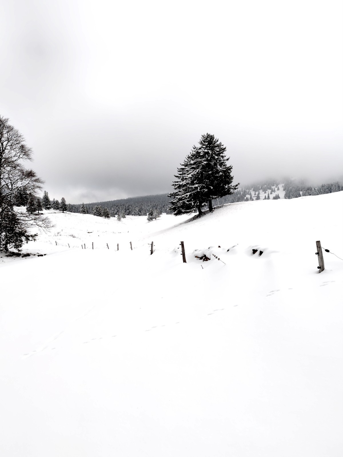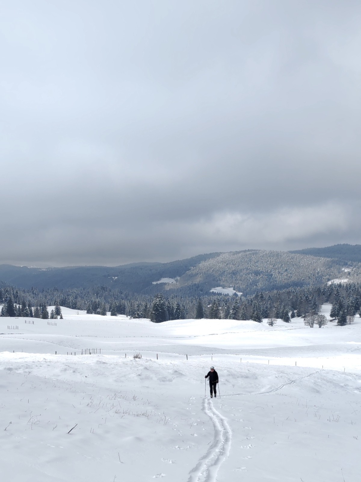 Vent du NE fort sur les crêtes, vite on plonge dans la purée en longeant un de ces murets de pierres sèches qui font tout le charme graphique de ce plateau du haut Jura.