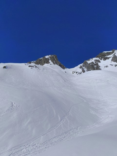 Conditions nivo et activité avalancheuse : les contre-pentes les plus au S à la montée commençait à couler. Bizarrement la combe elle-même n'avait pas pris le chaud tant que ça. En N, poudre posée sans vent : rien ne bouge.