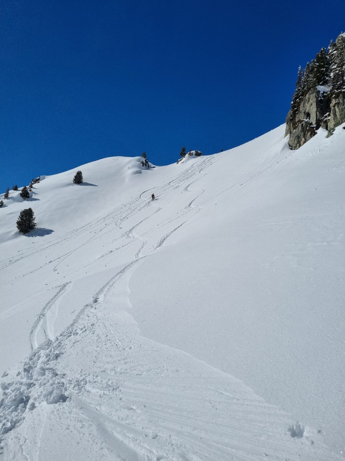 Conditions pour le ski : excellentes à l'est sous le pas de la coche, belle poudre revenue, fallait pas y être plus tard. Bien croûtée côté Venitier, moquette sur le bas