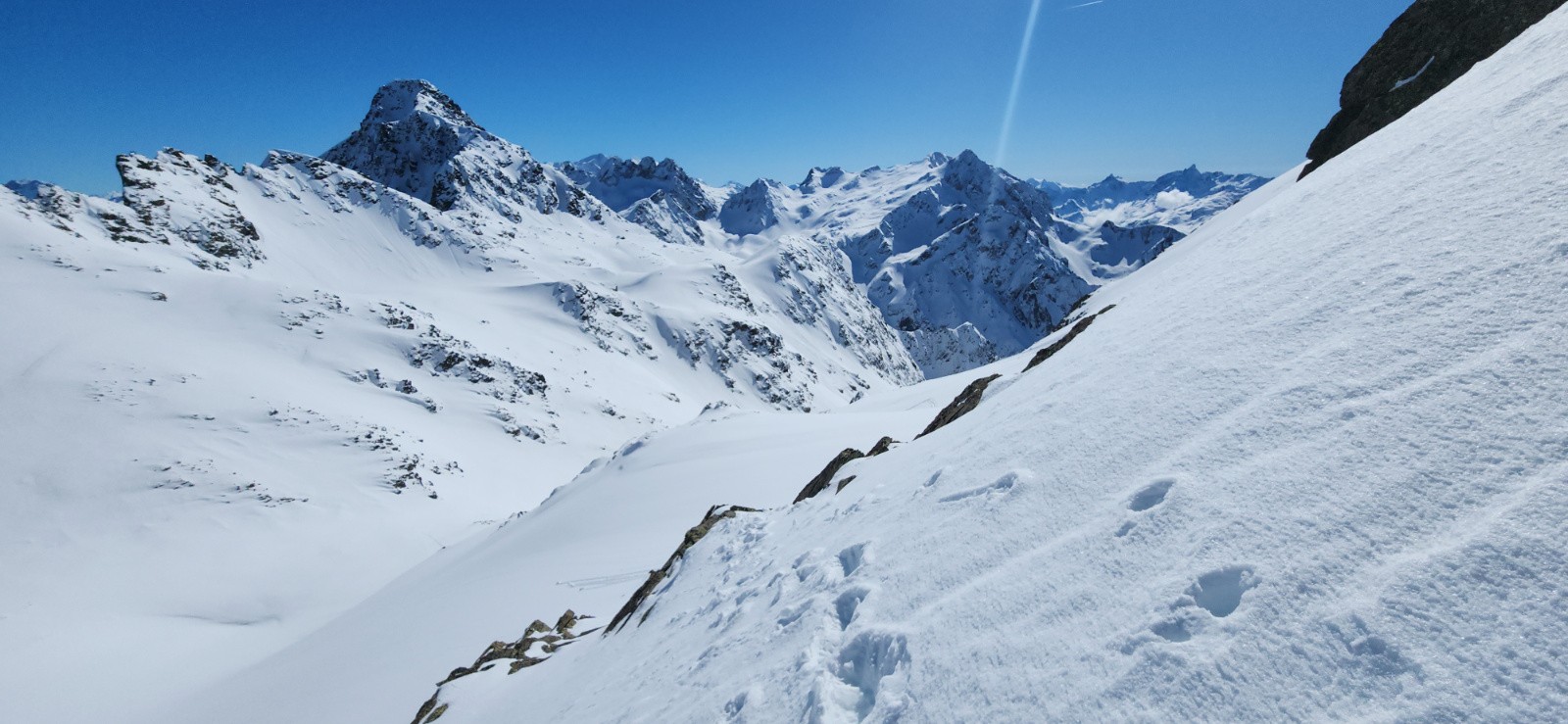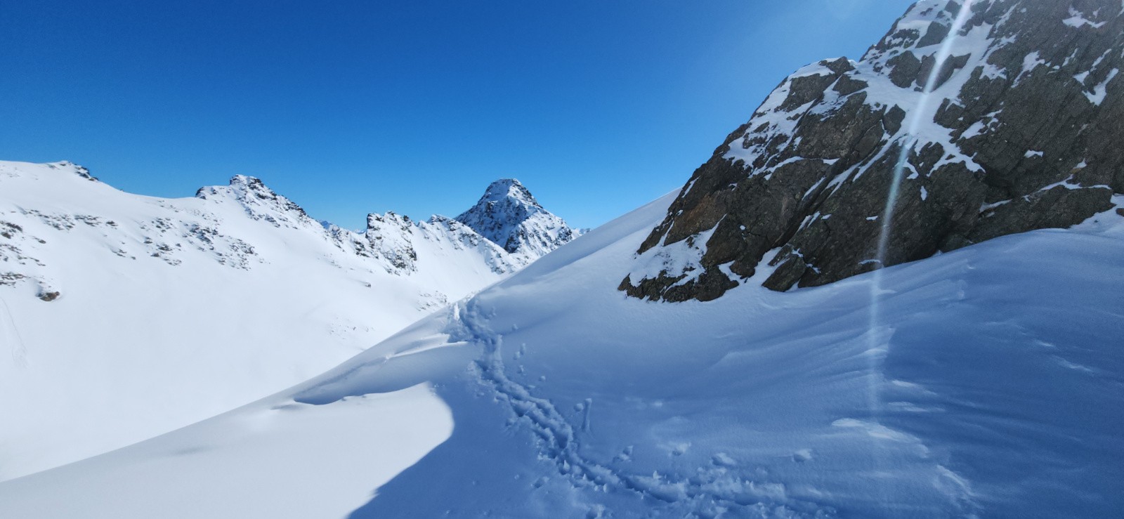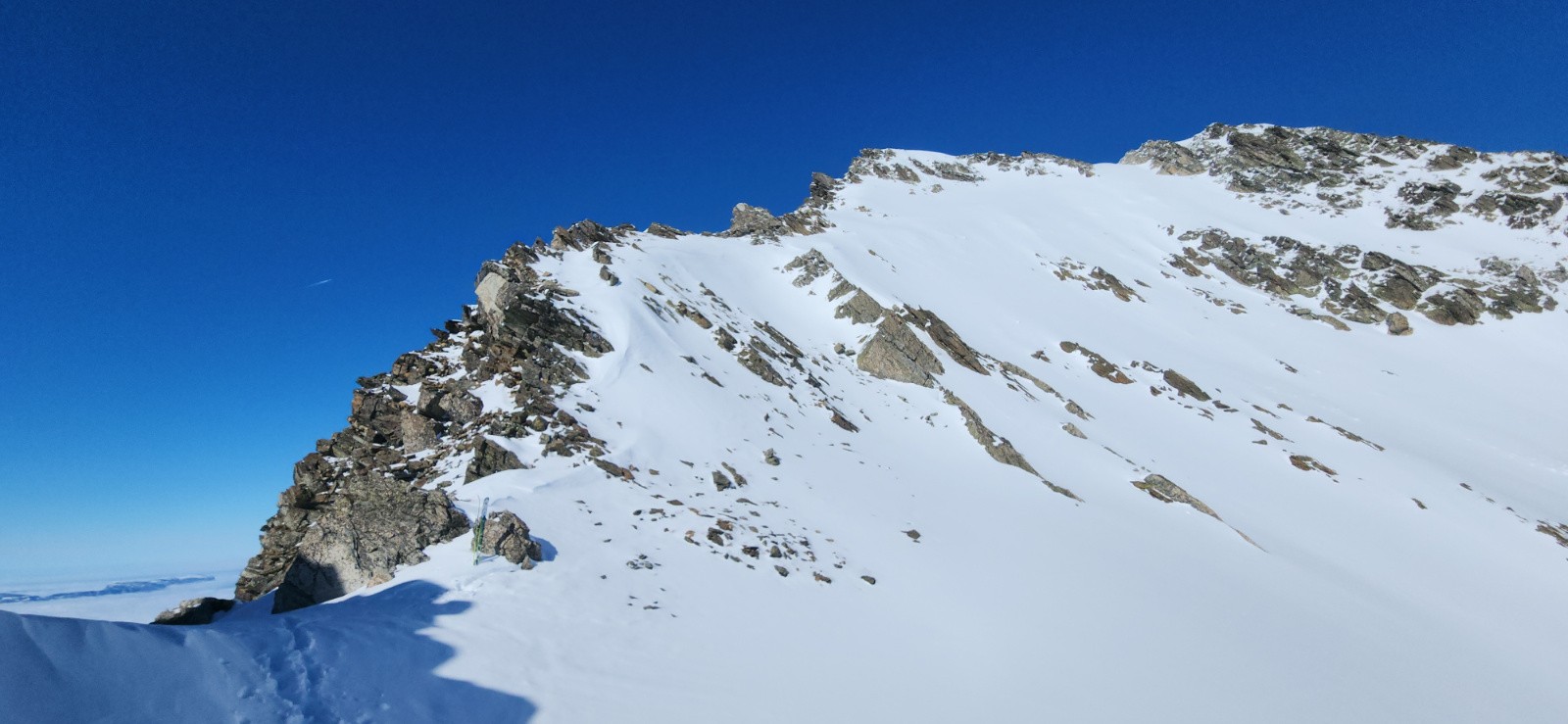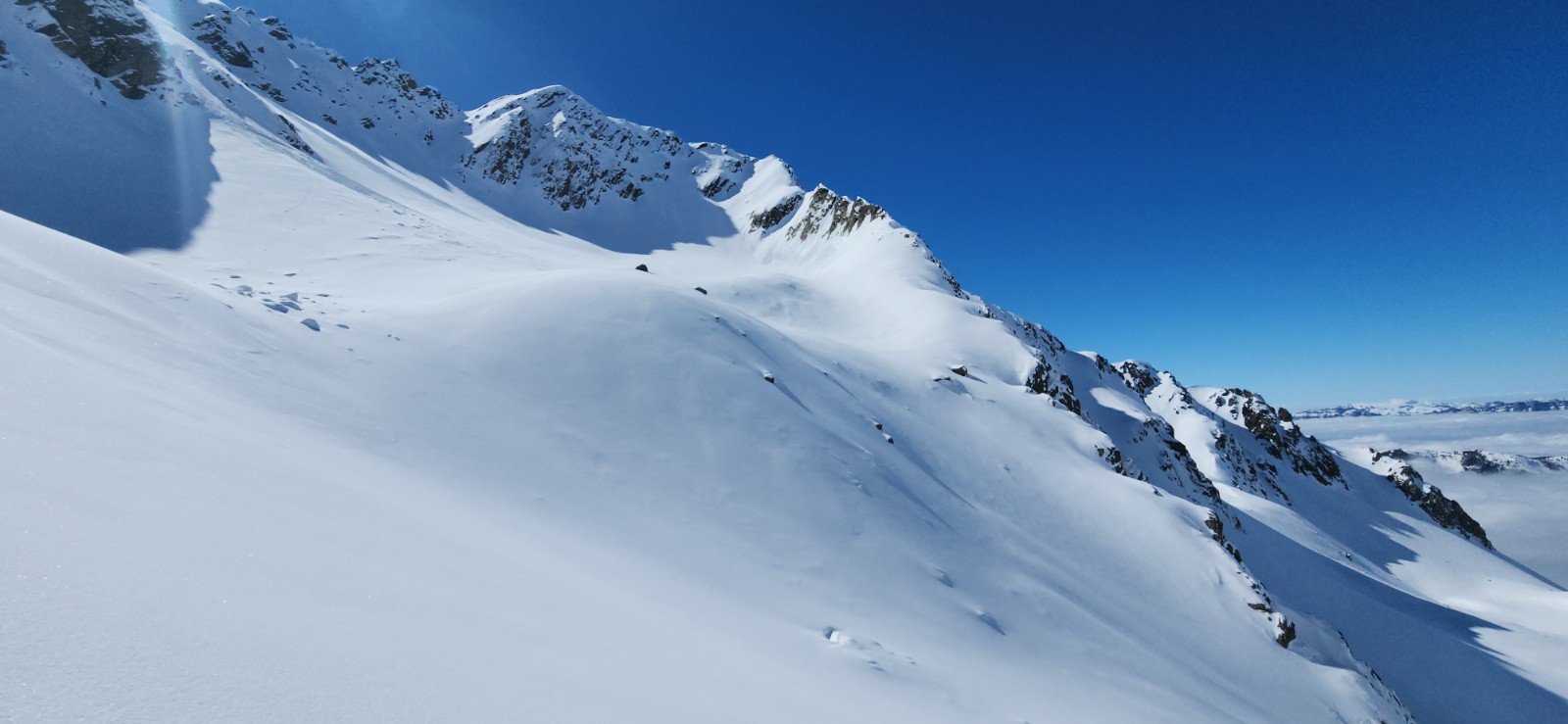 A noter un phénomène qui m'était encore inconnu jusqu'alors: il a fait un froid sec durant la nuit qui a séché la couche de nouvelle neige humide. On devine que c'était lourd et humide hier, plus du tout aujourd'hui. Par contre au sud le froid a durci cette couche, c'est vraiment pas terrible, voire croûté beurk. Pas de trace de plaque à vent toutefois.