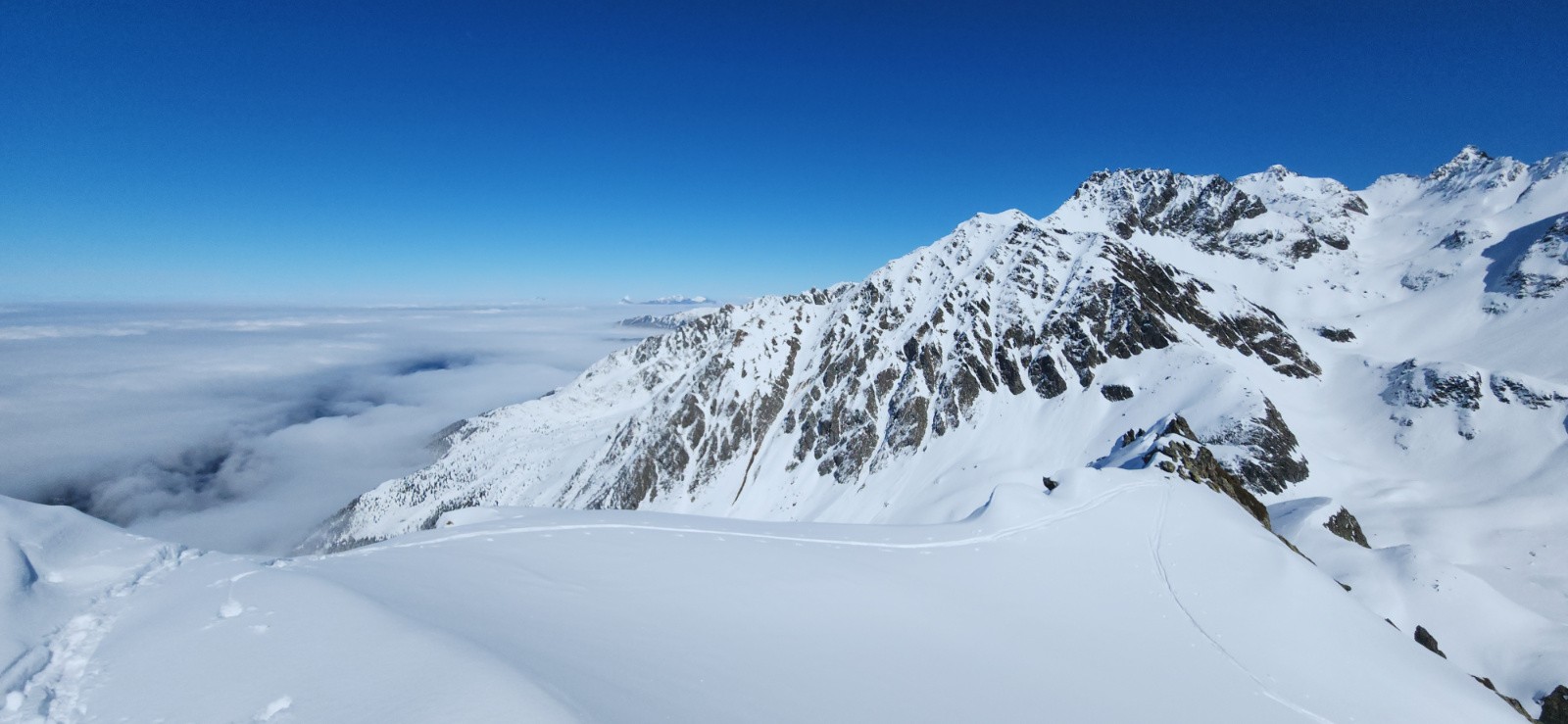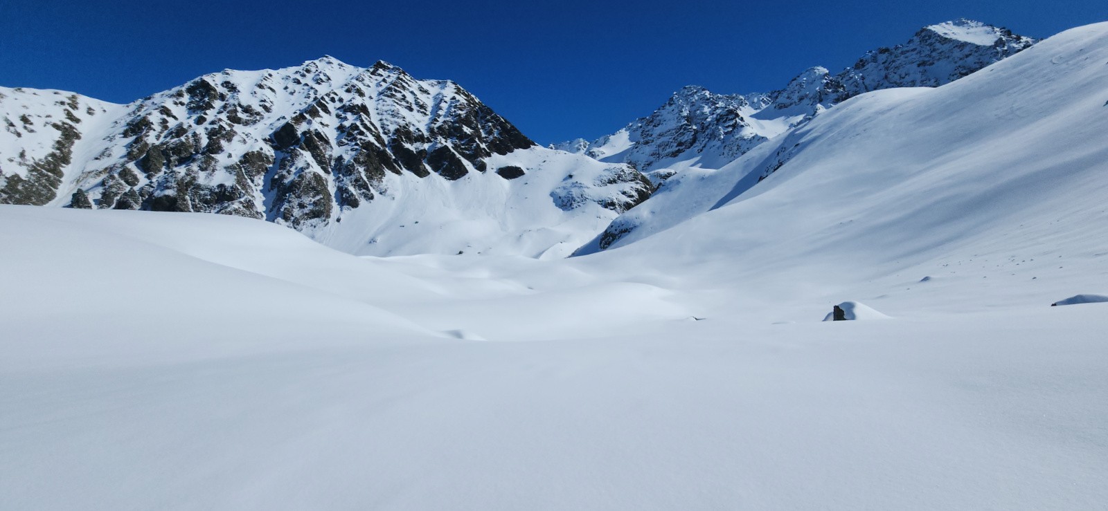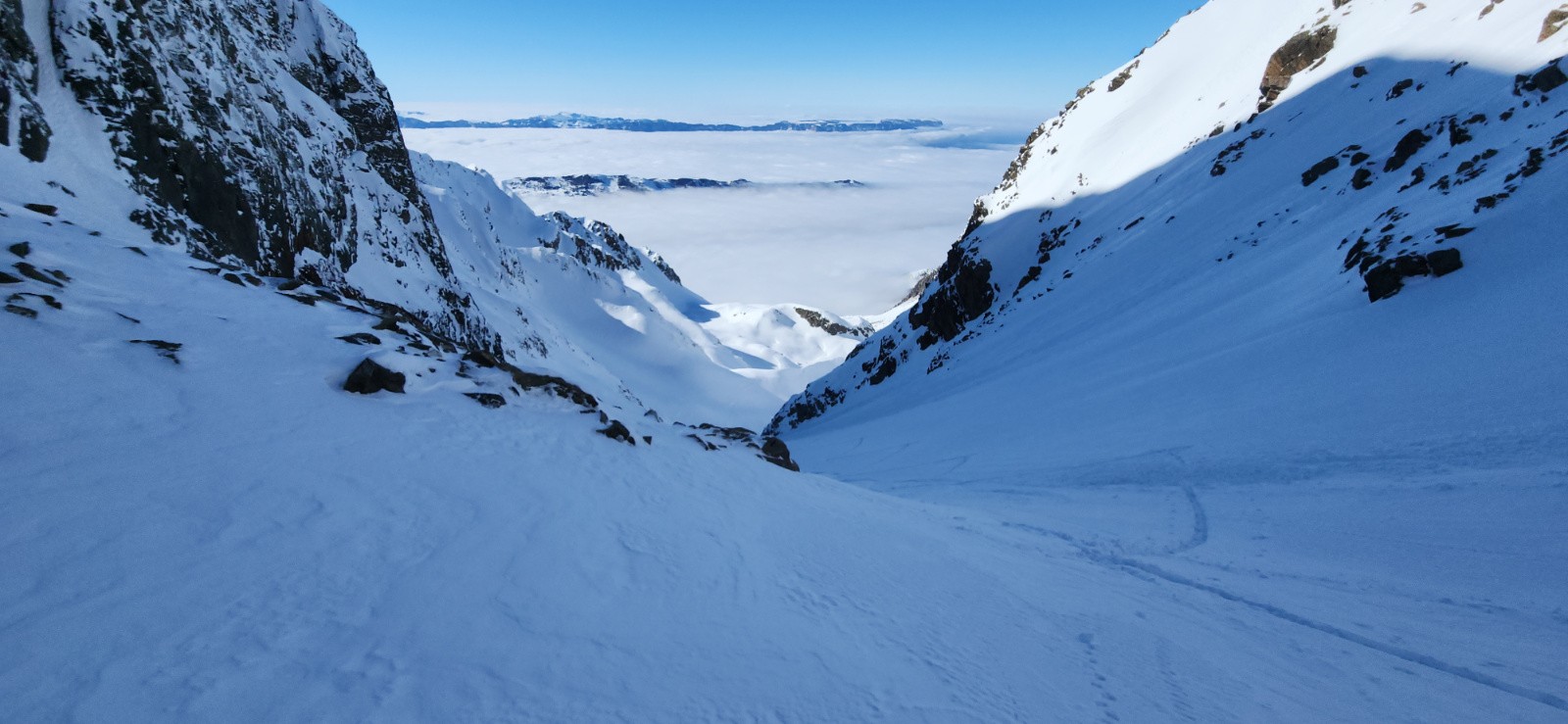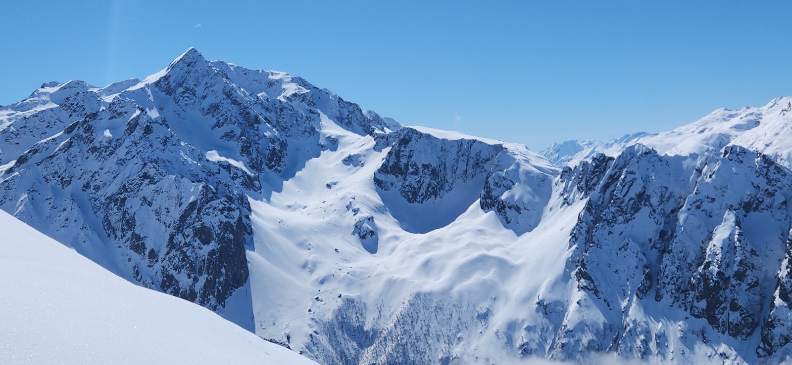 Conditions nivo et activité avalancheuse : ça a bien purgé sur les faces sud, et mes prédécesseurs ont du se faire une belle frayeur dans la descente du Col d'Arguille, une grosse coulée de boulettes solidifiée en beton armée quelques dizaines de mètres sous le Col à recouvert leur trace et nul doute que ça date d'hier. Sinon RAS, 30 à 40 cm de poudreuse légère partout sur les zones au Nord, c'est fabuleux. Chiant à tracer mais tellement bon à la descente!