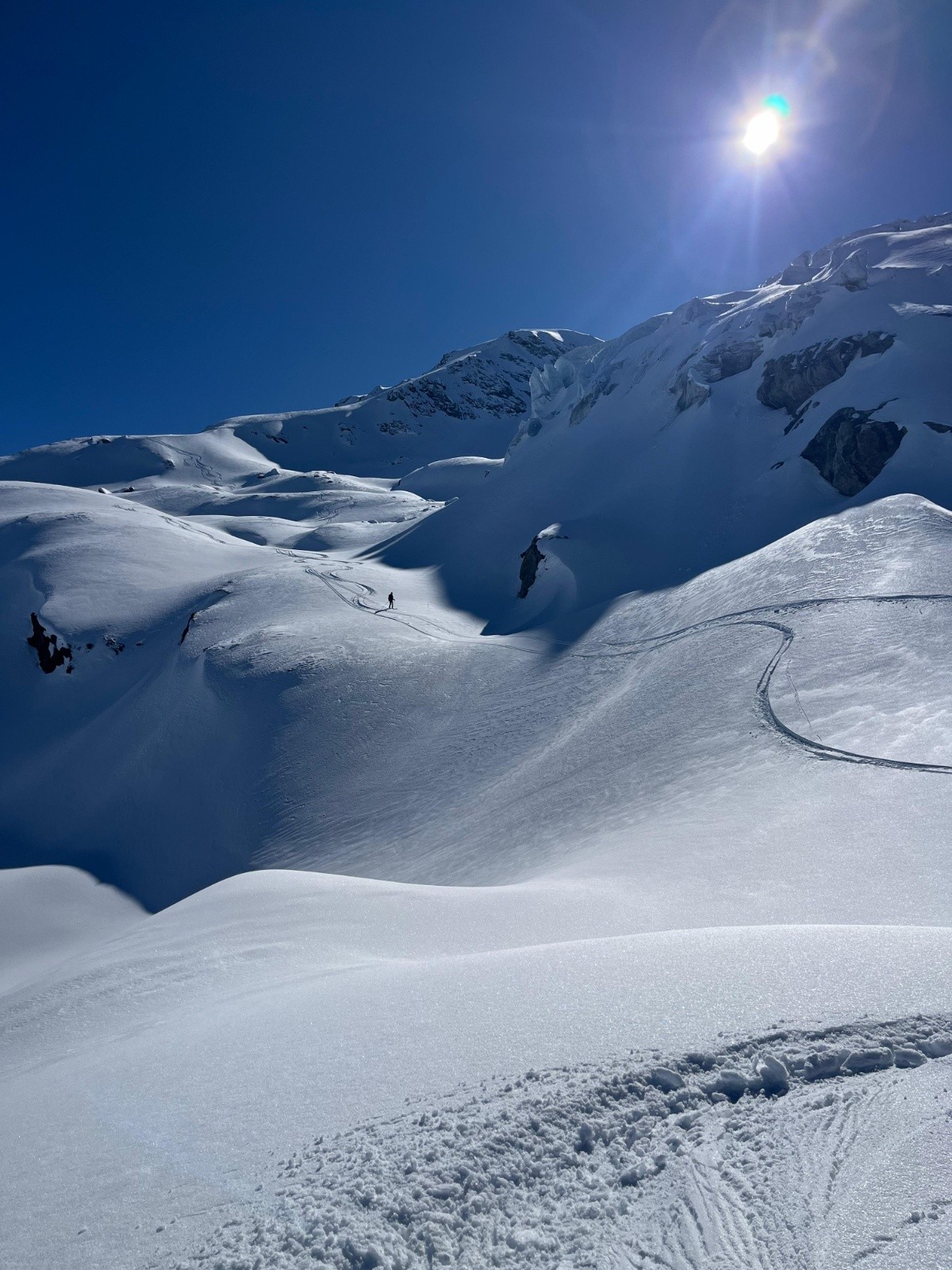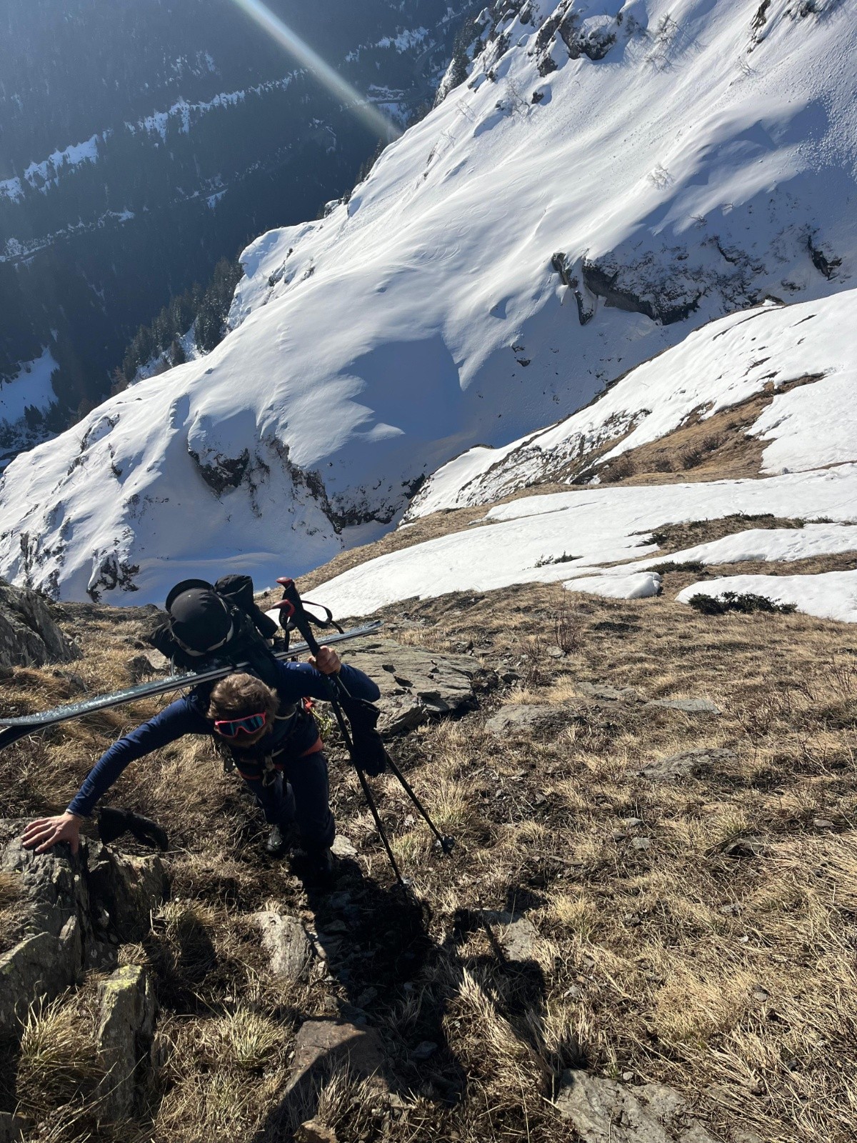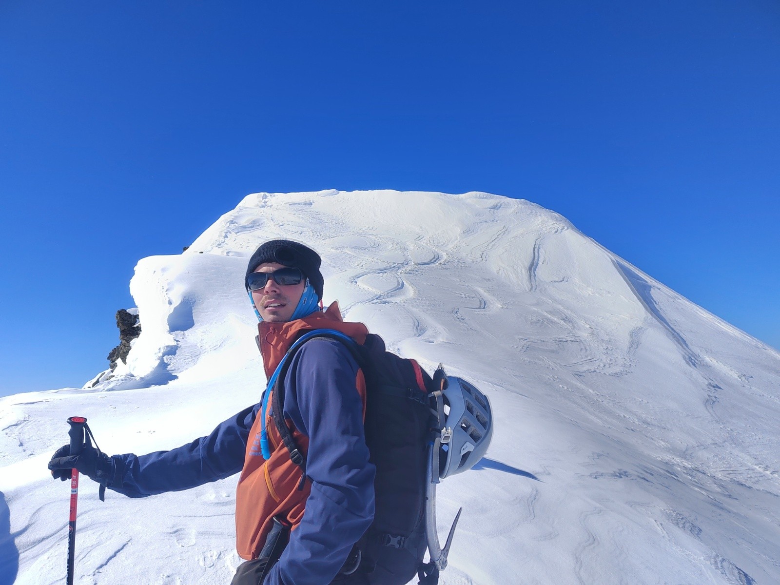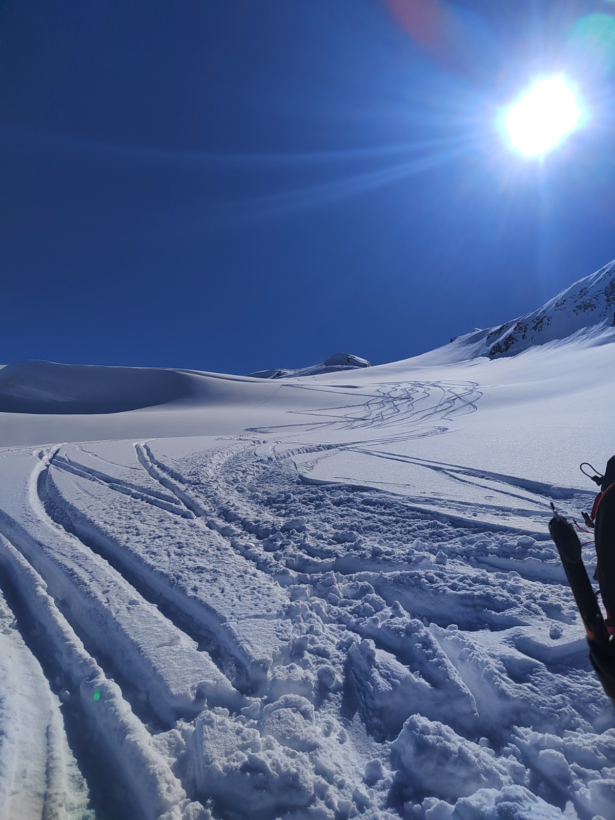 L'itinéraire de retour s'est avéré aléatoire, après la traversée sous le glacier, on a du remonté à pied 30m de pente neigeuse pour traverser loin sur notre gauche, récupérer une petite maison et suivre enfin un border cross un peu abo mais finalement c'est passé sans encombre 😁