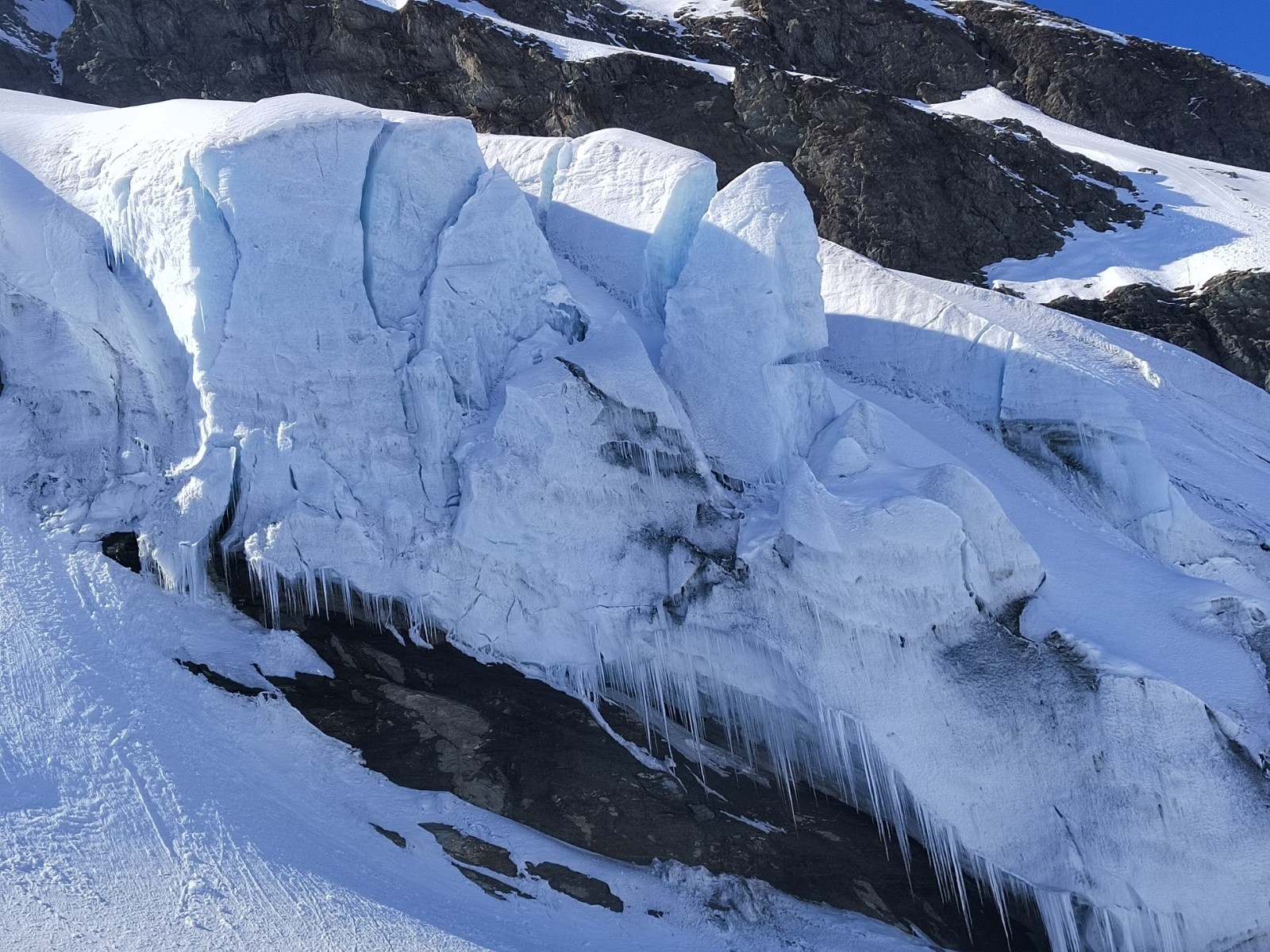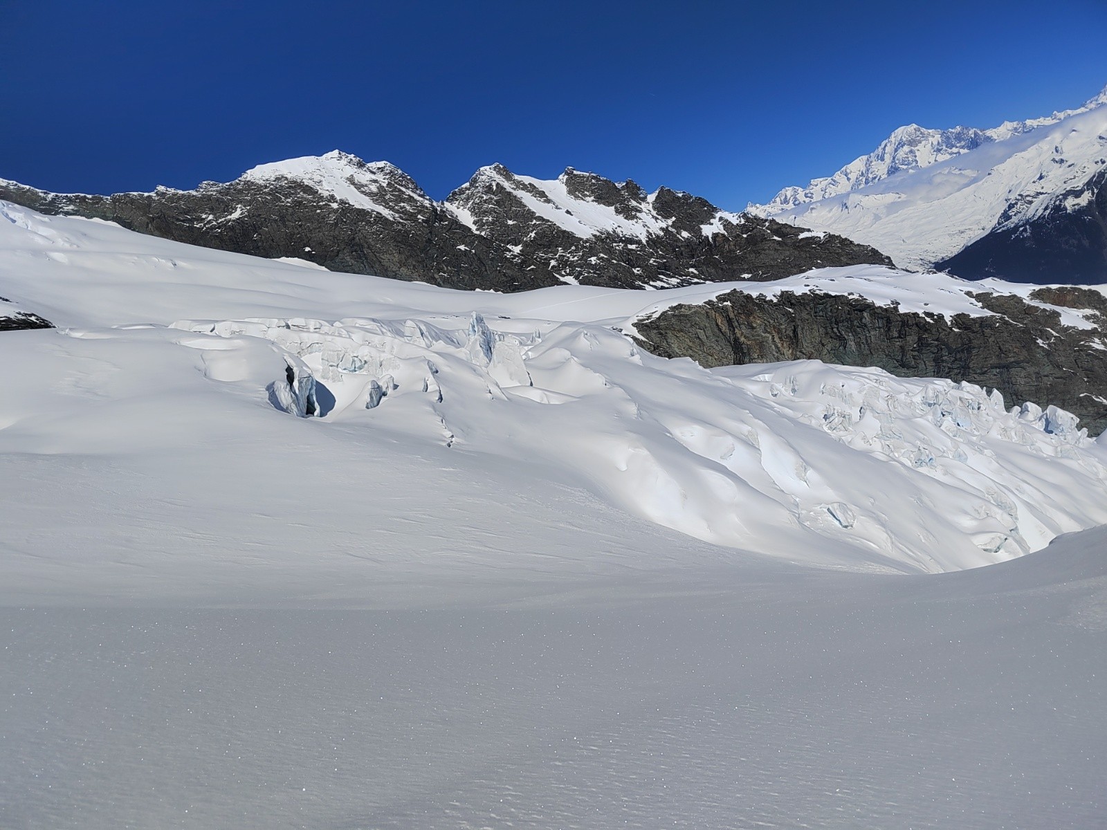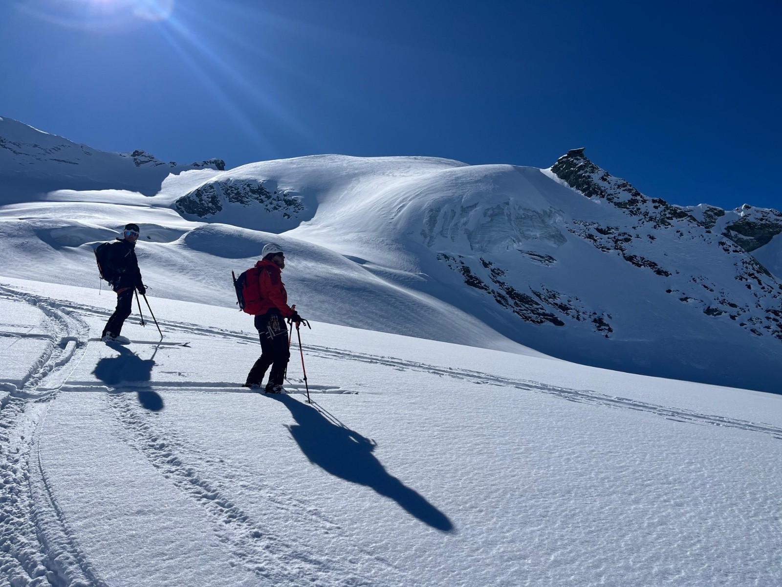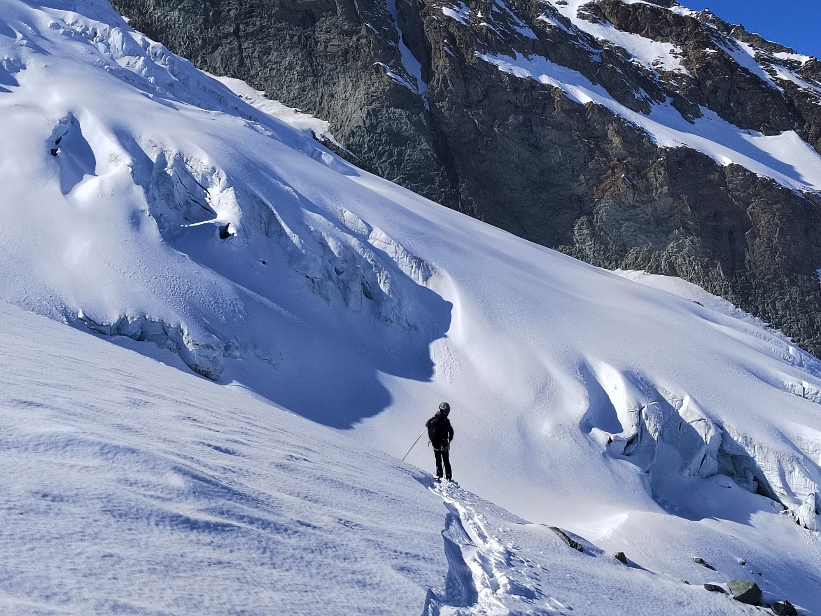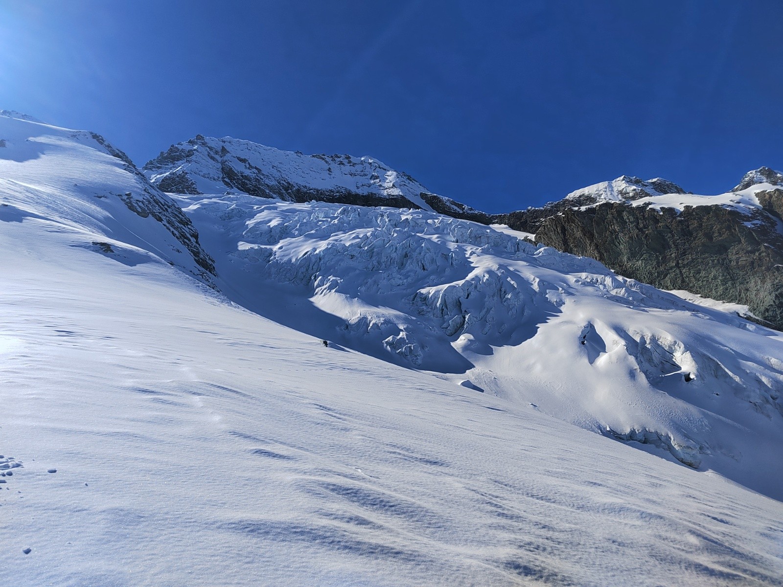 L'itinéraire de retour s'est avéré aléatoire, après la traversée sous le glacier, on a du remonté à pied 30m de pente neigeuse pour traverser loin sur notre gauche, récupérer une petite maison et suivre enfin un border cross un peu abo mais finalement c'est passé sans encombre 😁