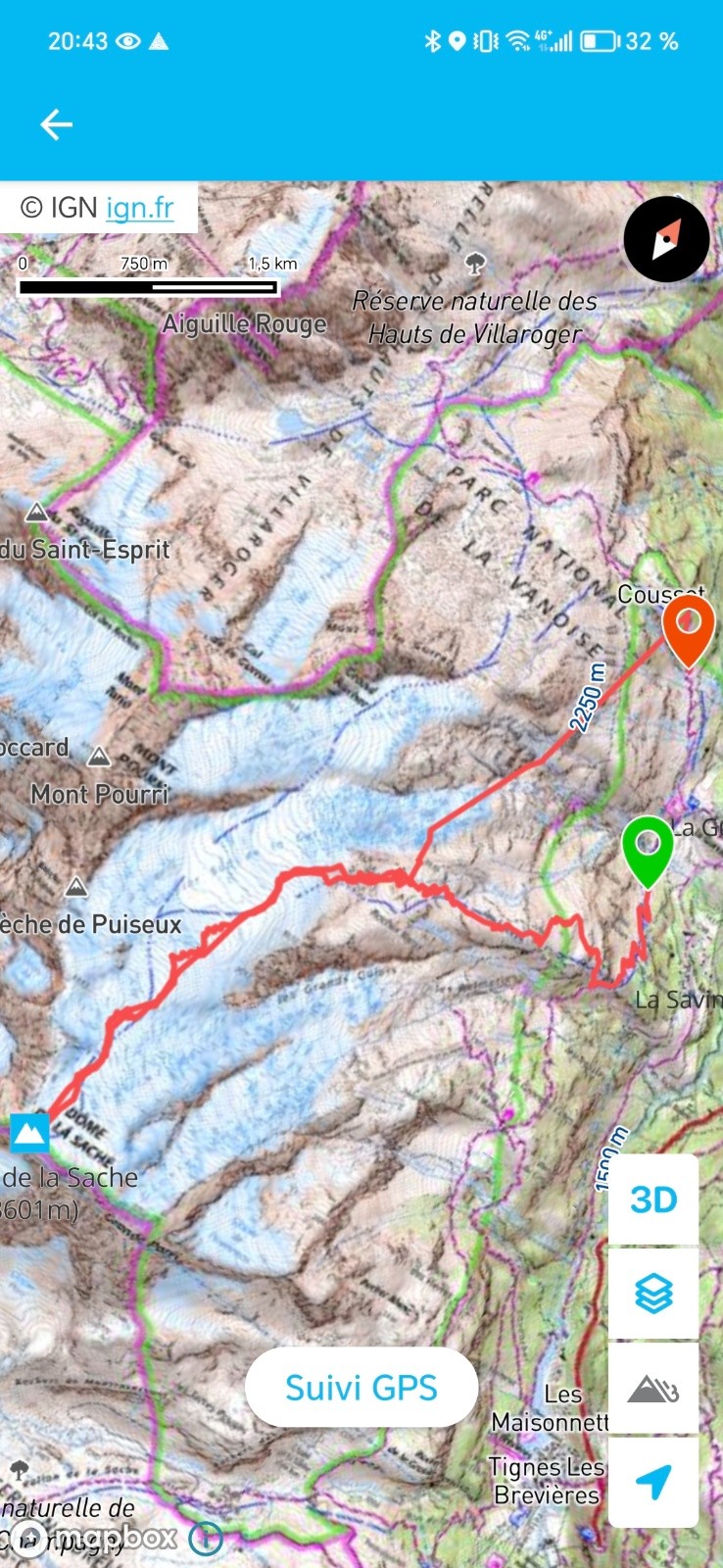 Je ne me suis pas occupé de l'itinéraire mais je vous met une photo du suivi. Superbe sortie, météo incroyable, poudre INCROYABLE sur presque 1000m sur les douces pentes après le sommet. Ensuite une ptite croûte mais rien d'abo.