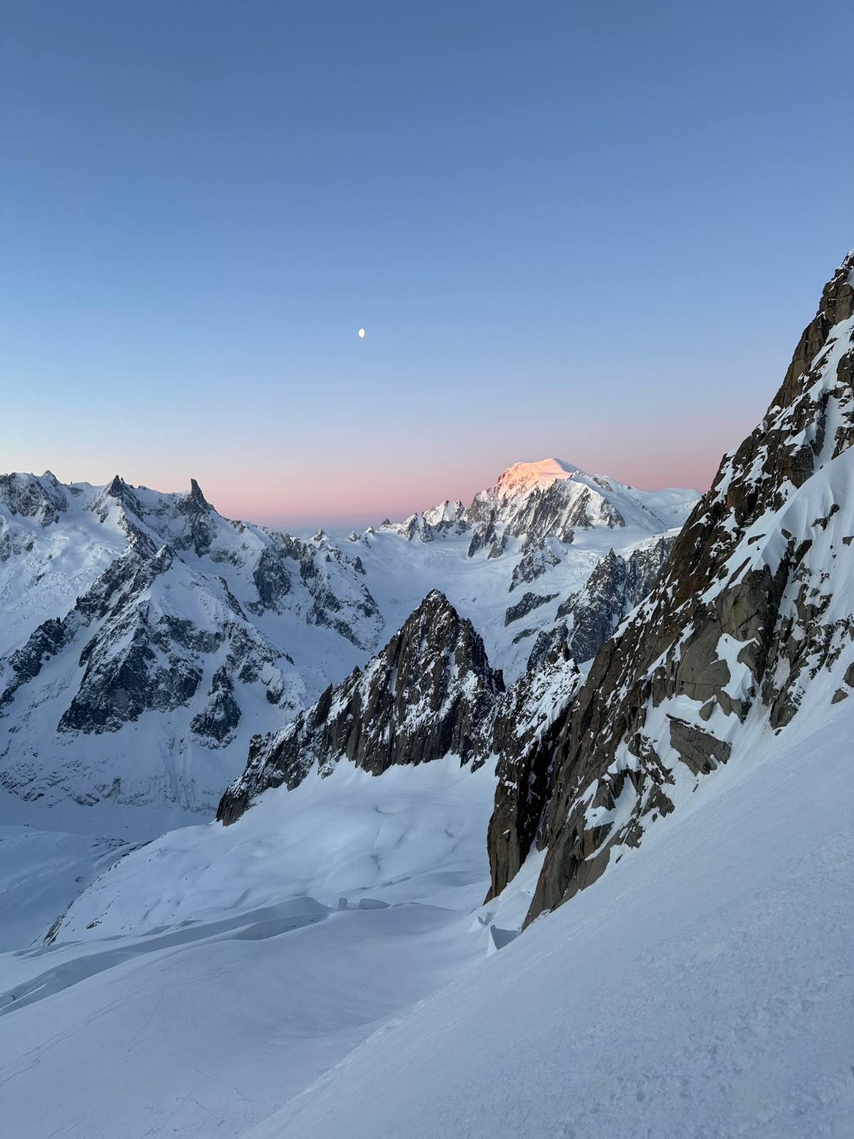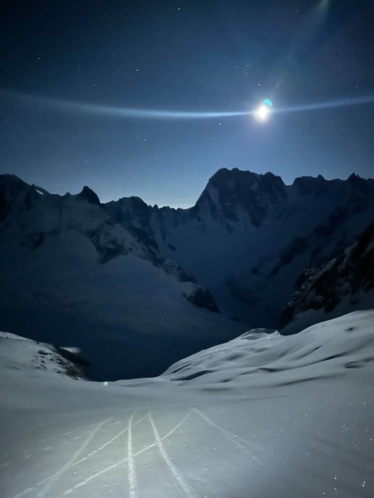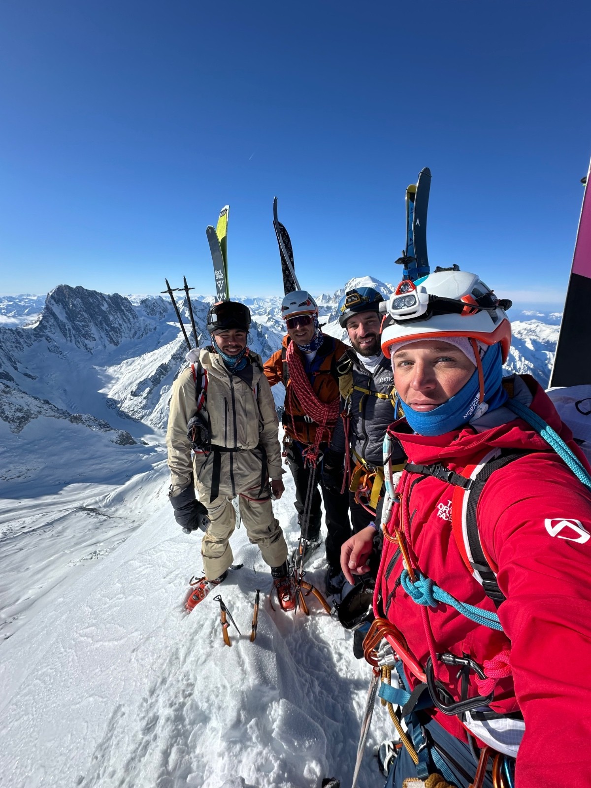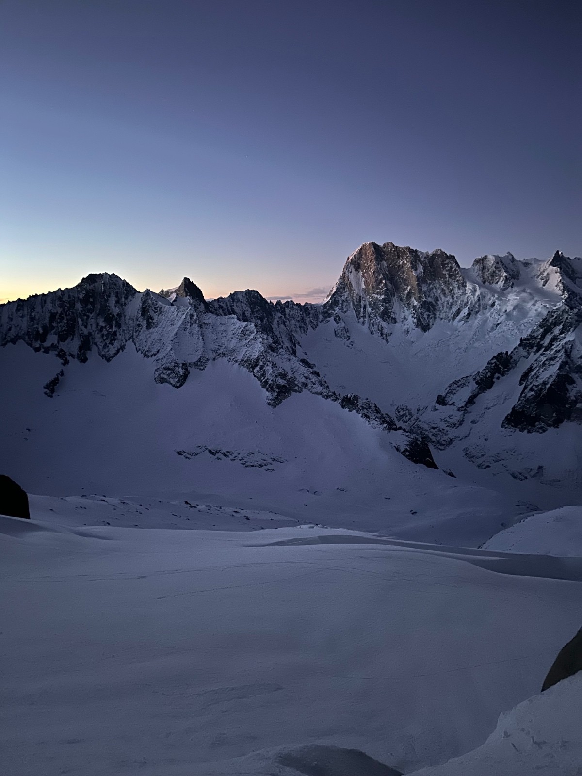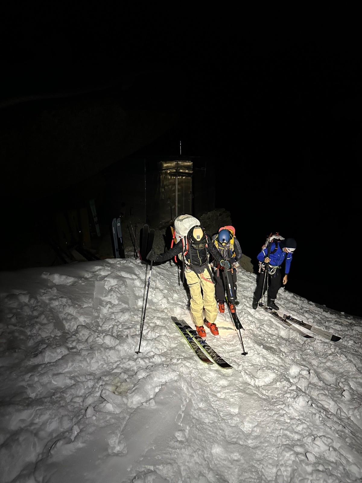 Arrivé à Cham, je cours à la boulangerie et pour me garer, j’oubli un peu de matos évidemment mais pas ma voile ! 16h00 et 19secondes, on me bricole une dernière benne. Pas de vent là haut ça vol nickel, mis à part que je me fais écraser donc je poserai 230m sous le refuge, Boh pas bien grave, bien vite torché. Arrivé au refuge on est une quinzaine et moi le dernier. J’ouvre la porte et demande qui va à la verte. Une équipe de 3 super cools me propose de me joindre à eux. J’ai zappé ma frontale donc pas trop de choix non plus 😂. On décolle juste avant 3h. La rimaye 2h plus tard est degueulasse. Je m’emploie tout à gauche sur une dalle pour passer, juste après avoir traversé une jambe dans un pont sans consistance. Nickel c’est passé. Ça déroule entre des croutes plus ou moins épaisses et portantes. Compliqué cette année d’avoir de vraies neiges printemps. La goulotte se bricole, puis grand espace, le couloir sommital qui sera béton car décaillant bien trop tard par rapport au reste dans ces condis.