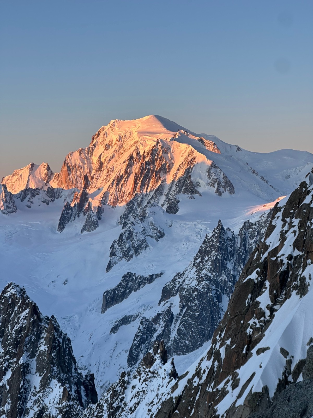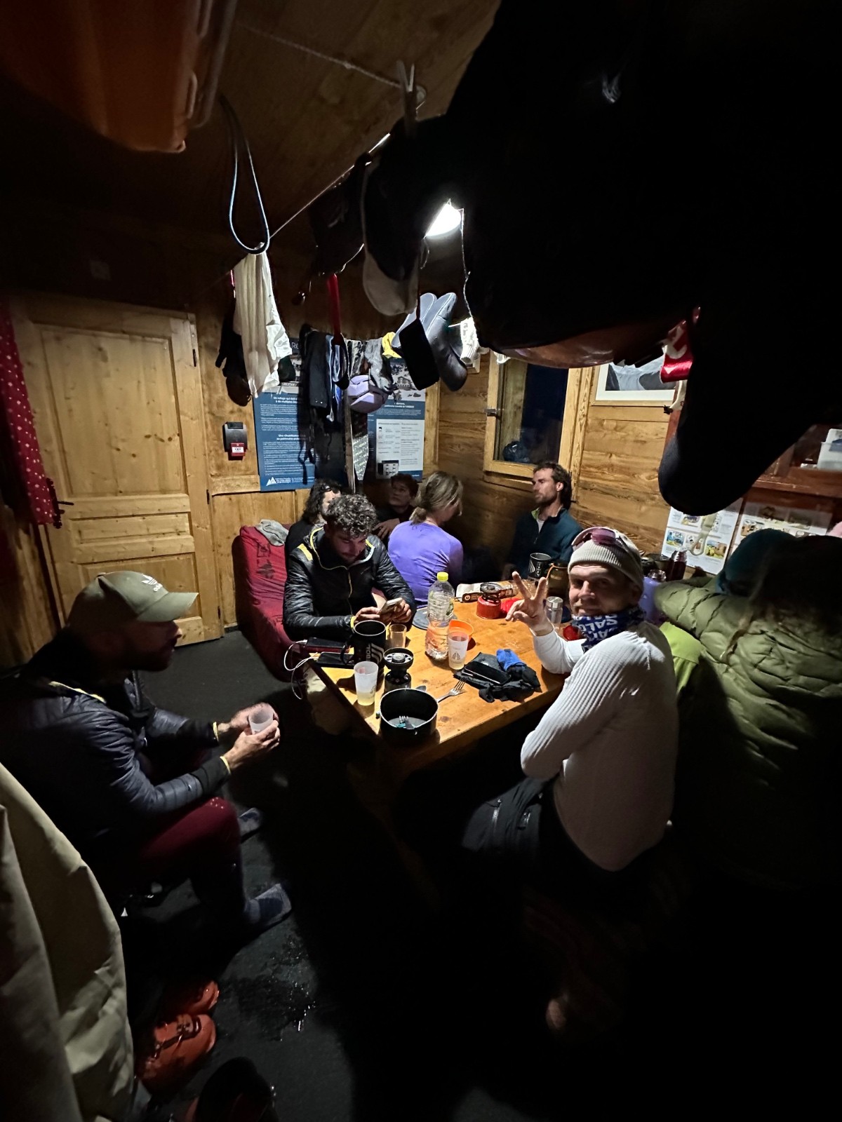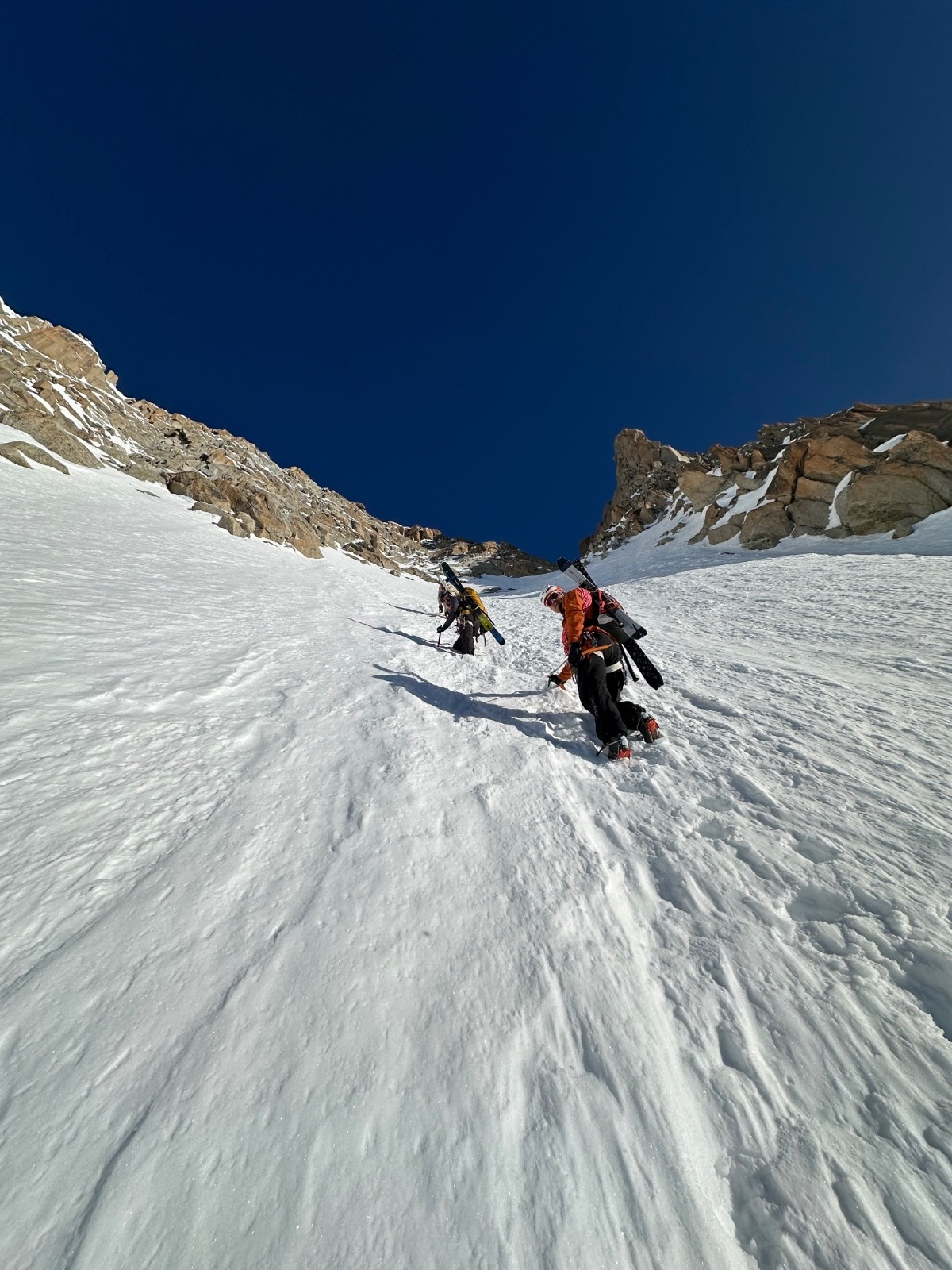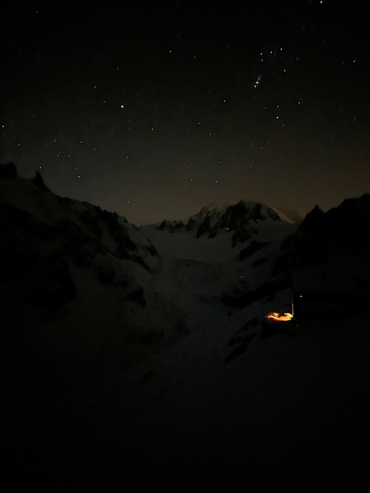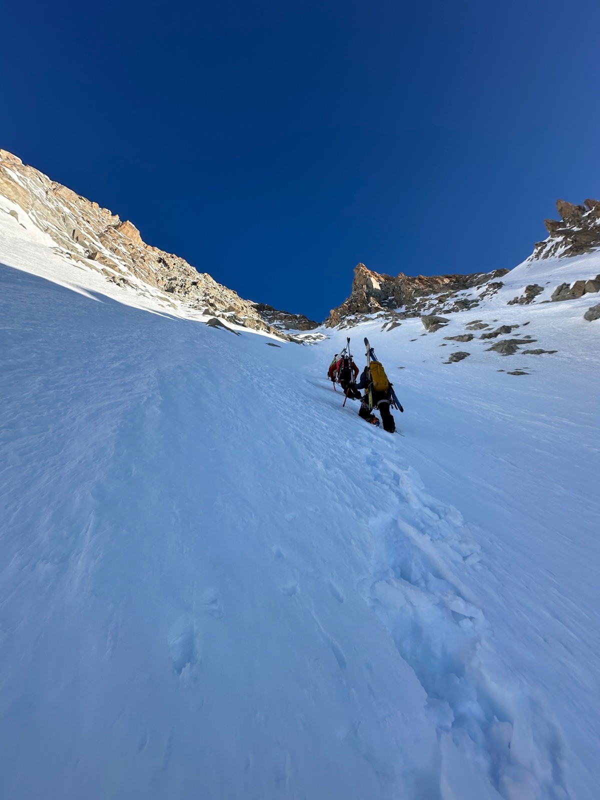 Arrivé à Cham, je cours à la boulangerie et pour me garer, j’oubli un peu de matos évidemment mais pas ma voile ! 16h00 et 19secondes, on me bricole une dernière benne. Pas de vent là haut ça vol nickel, mis à part que je me fais écraser donc je poserai 230m sous le refuge, Boh pas bien grave, bien vite torché. Arrivé au refuge on est une quinzaine et moi le dernier. J’ouvre la porte et demande qui va à la verte. Une équipe de 3 super cools me propose de me joindre à eux. J’ai zappé ma frontale donc pas trop de choix non plus 😂. On décolle juste avant 3h. La rimaye 2h plus tard est degueulasse. Je m’emploie tout à gauche sur une dalle pour passer, juste après avoir traversé une jambe dans un pont sans consistance. Nickel c’est passé. Ça déroule entre des croutes plus ou moins épaisses et portantes. Compliqué cette année d’avoir de vraies neiges printemps. La goulotte se bricole, puis grand espace, le couloir sommital qui sera béton car décaillant bien trop tard par rapport au reste dans ces condis.